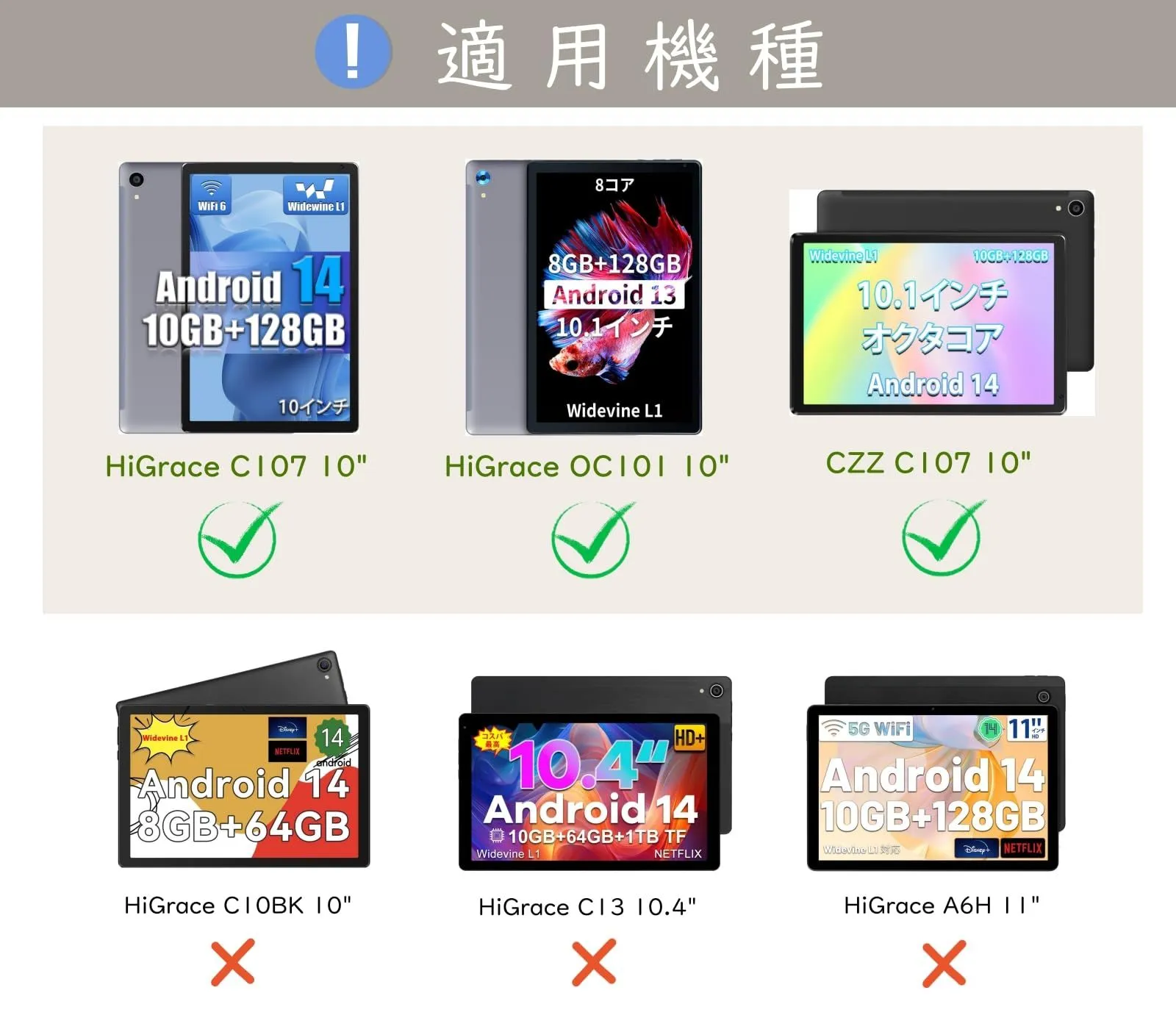 「適用機種」HiGrace OC101、HiGrace/CZZ C107、FancyDay C108 10インチ向けの専門デザインです。HiGrace/Velorim/Cheerjoy/Dewsod MB1001 4コアCPU(×)、HiGrace C10BK(×)、HiGrace Android 14 8コアCPU 11インチ/10.4インチ(×)と他の機種に対応できませんので、ご購入する時はお使いのタブレットの説明書にあるモデル番号とカメラレンズをしっかりとご確認になってからお買い求めください。
