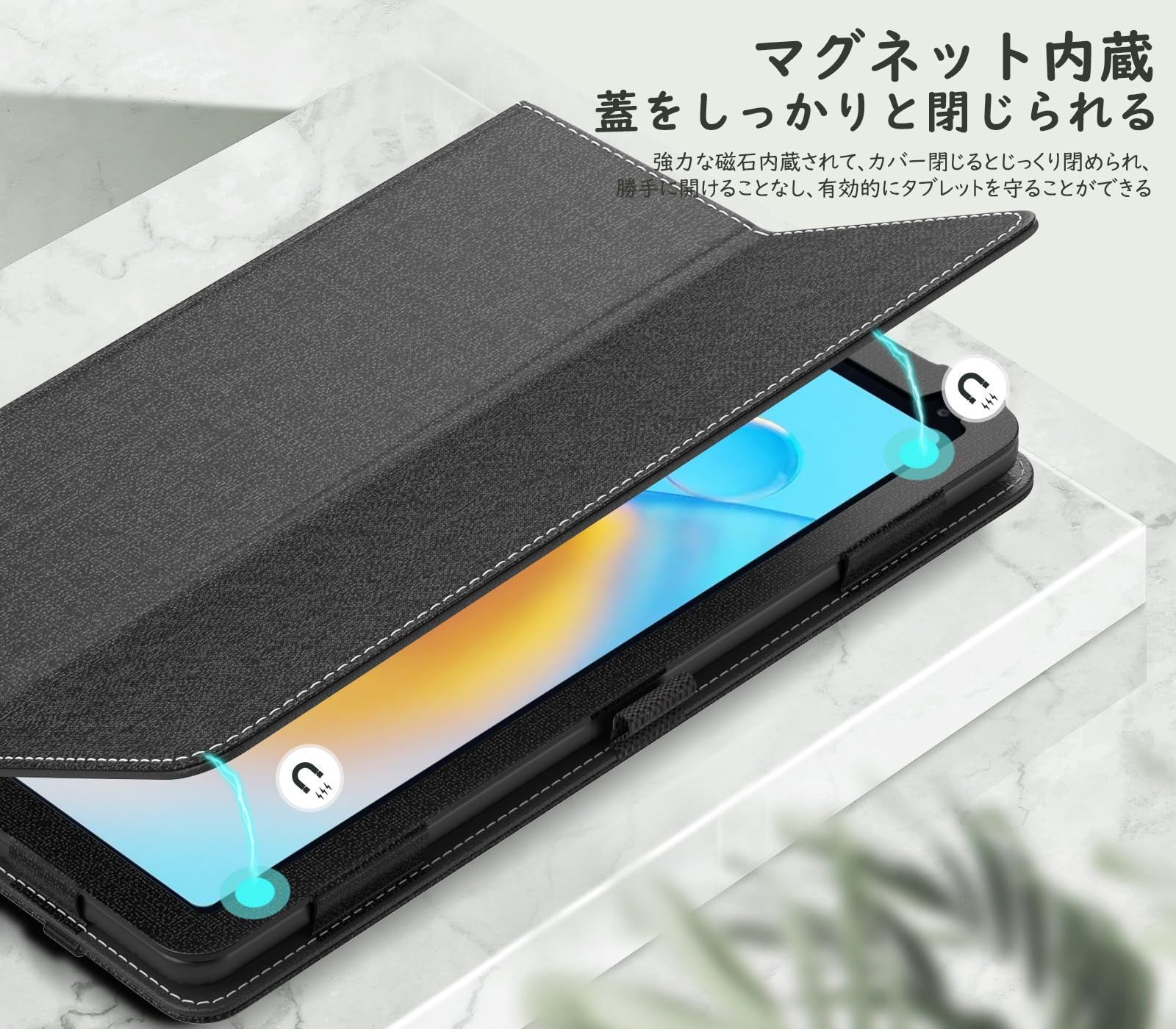 「マグネット内蔵」 カバー中身にはマグネット内蔵されて、閉めるときっちりとくっつけられて、勝手に開けること心配いりません。軽量化にしたデザインより、タブレットに負担をかからず、タブレットの扱いをより快適にお楽しみいただけます。