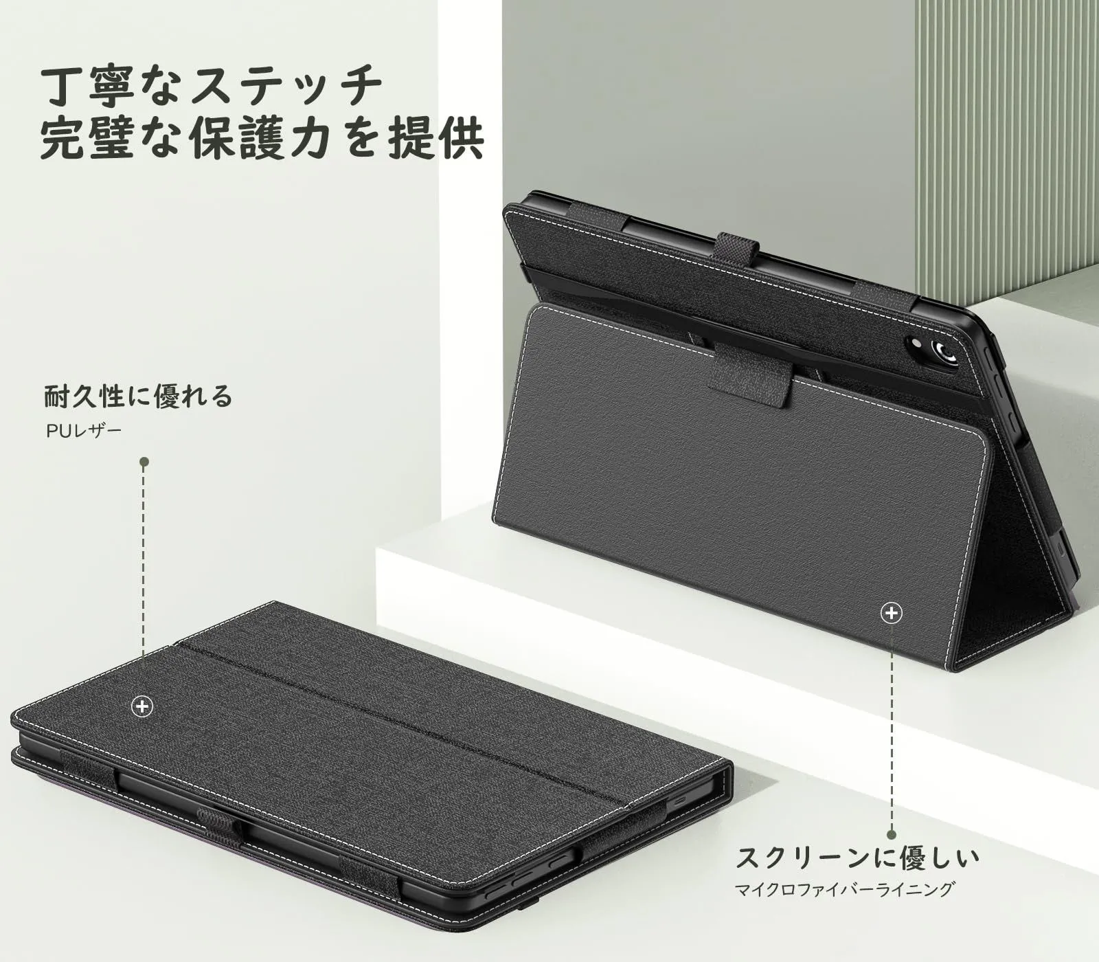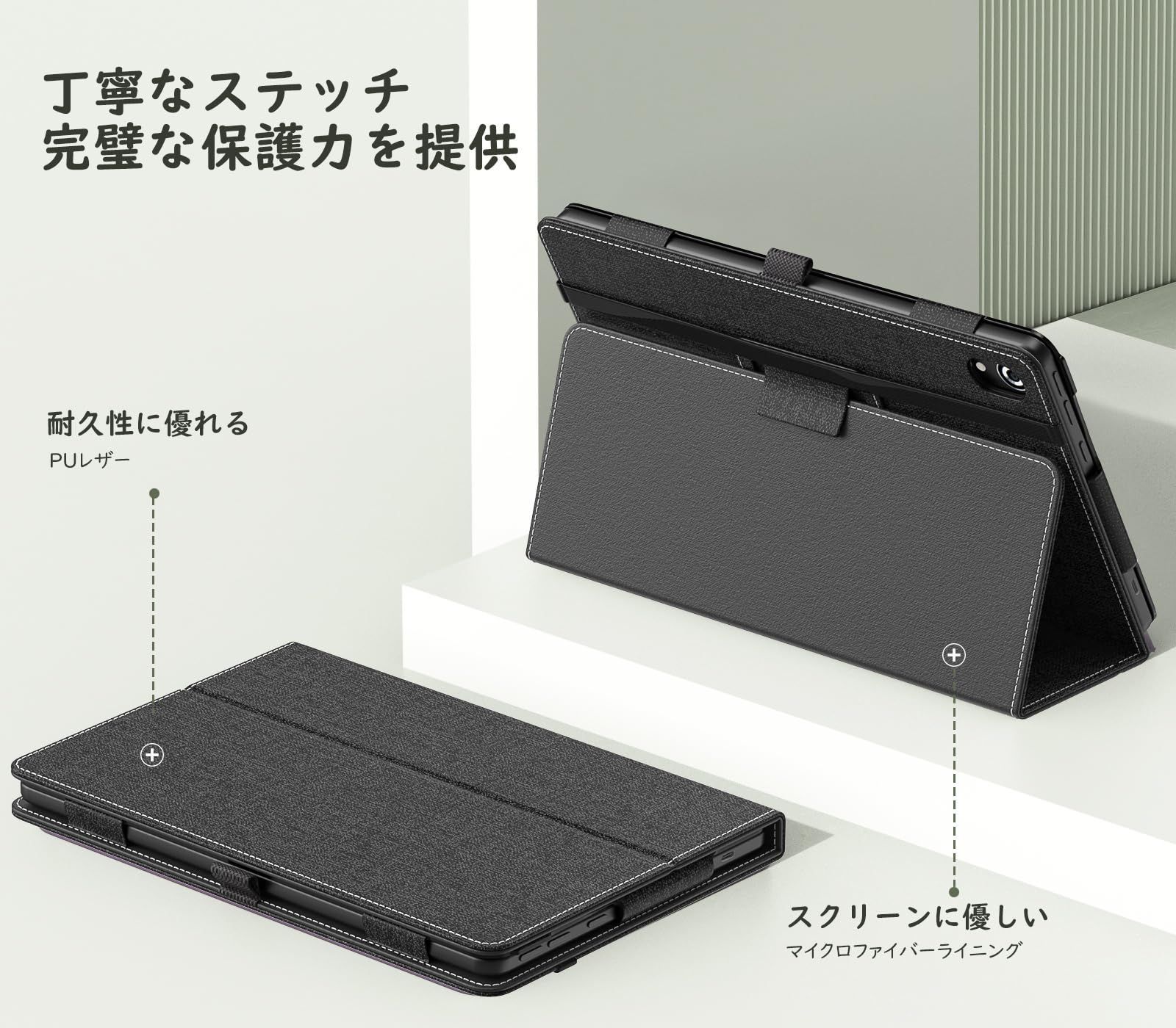 「上質な素材採用」外装は手触りがよく耐久性に優れた高級PUレザーで作られて、綺麗で高級感のあふれるステッチ仕様となっており、内部材質はマイクロファイバー製で、摩擦により発生する擦り傷を抑えられて、デバイスに最高の保護してくれます。