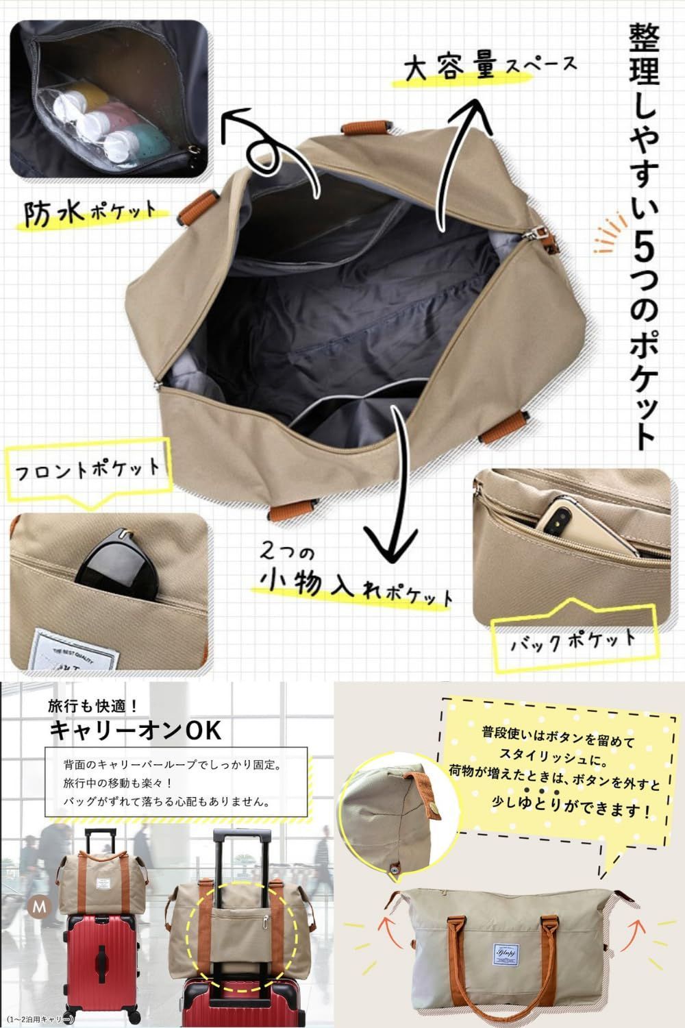 【便利な5ポケット】 フロントポケット×1、小物入れポケット×2、バックファスナーポケット×1、防水ポケット×1、合計5ポケット。 すぐに取り出したい小物から、服や靴、雑誌、A4ファイル、ノートPCなど様々なアイテムを収納可能です。 ?