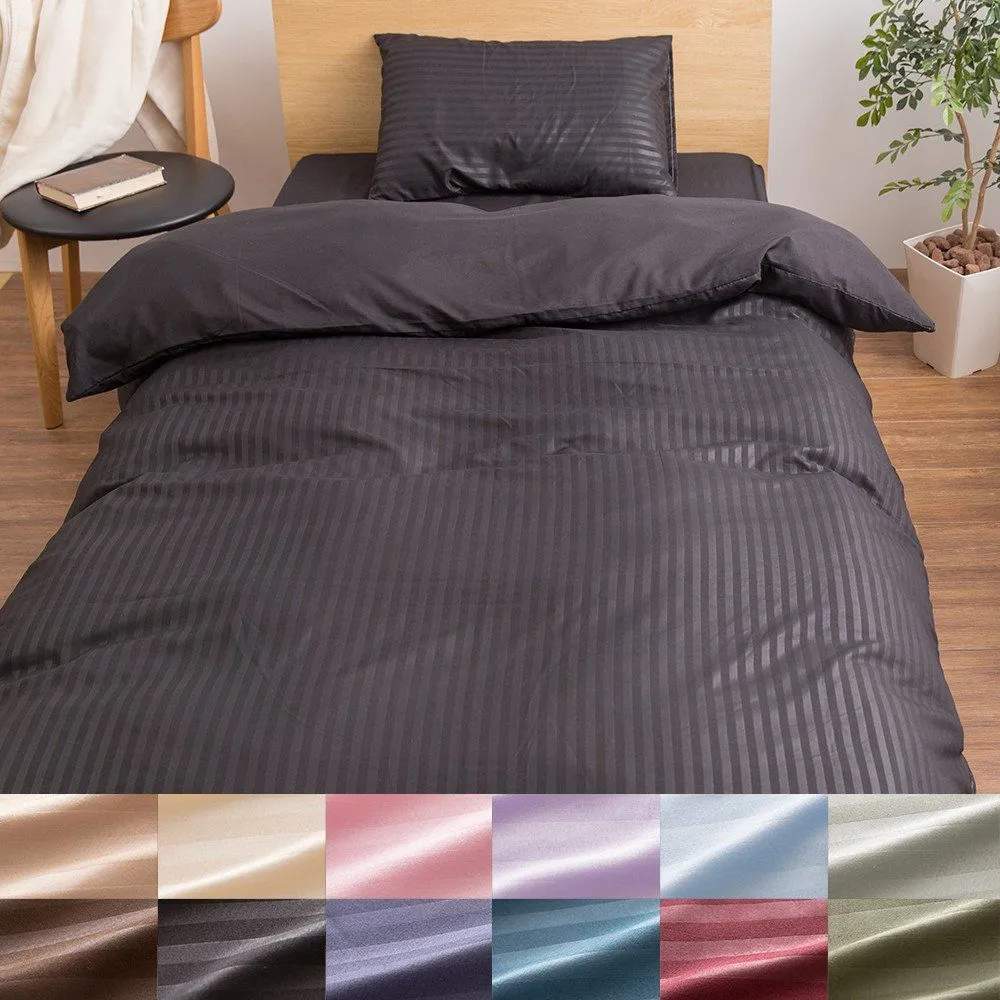 【ホテルタイプ 布団カバー3点セット】。 サテン調生地に、エンボス加工のストライプを描いたことで、 ただのストライプとは違う、上質な雰囲気を表現できました。 寝室は、人に見られる事もないし・・と、 寝具のカバーがチグハグな方も多いのでは・・? この機会に