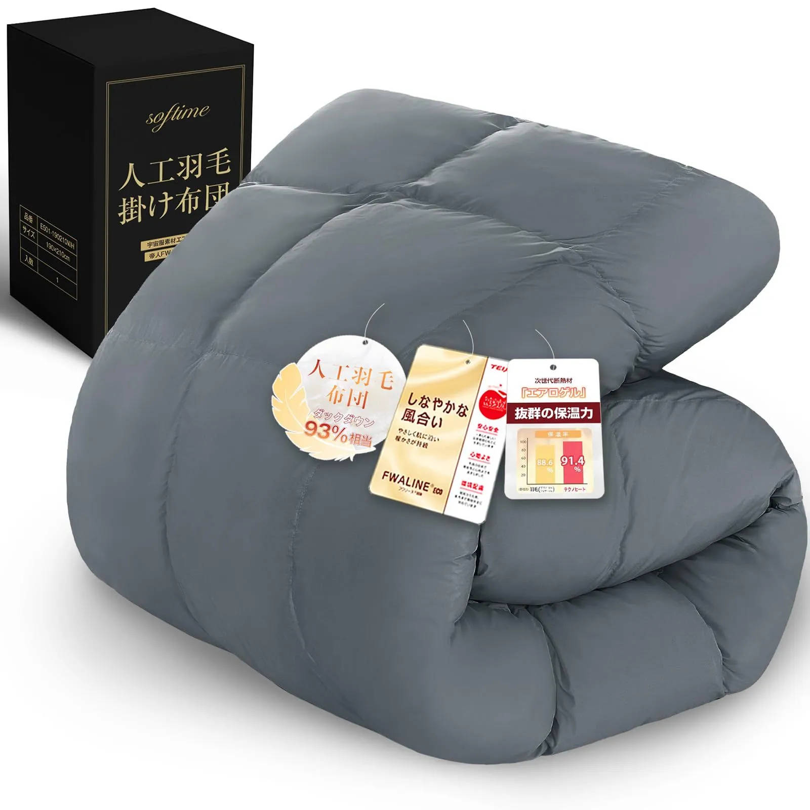 【収納袋付き・圧縮梱包でお届け】不織布製のファスナー式収納袋が付属しております。圧縮梱包でお届けいたしますので、到着後は軽くたたいて空気を含ませていただければ、ふんわりと元の状態に復元します。省スペースで、季節物の収納にも大変便利です。 材質 宇宙服素材エアロゲル採用・ダックダウン93%相当 色 ダックグレー ブランド Softime 特徴 特許取得「人工羽毛保温性わた」, 立体キルト構造 スタイル ??主? 最後までご確認頂き誠にありがとうございました。 上記をご確認頂き、ご購入いただけましたら幸いです。 何かご不明な点がございましたらお気軽にメッセージからお問い合わせ下さい。