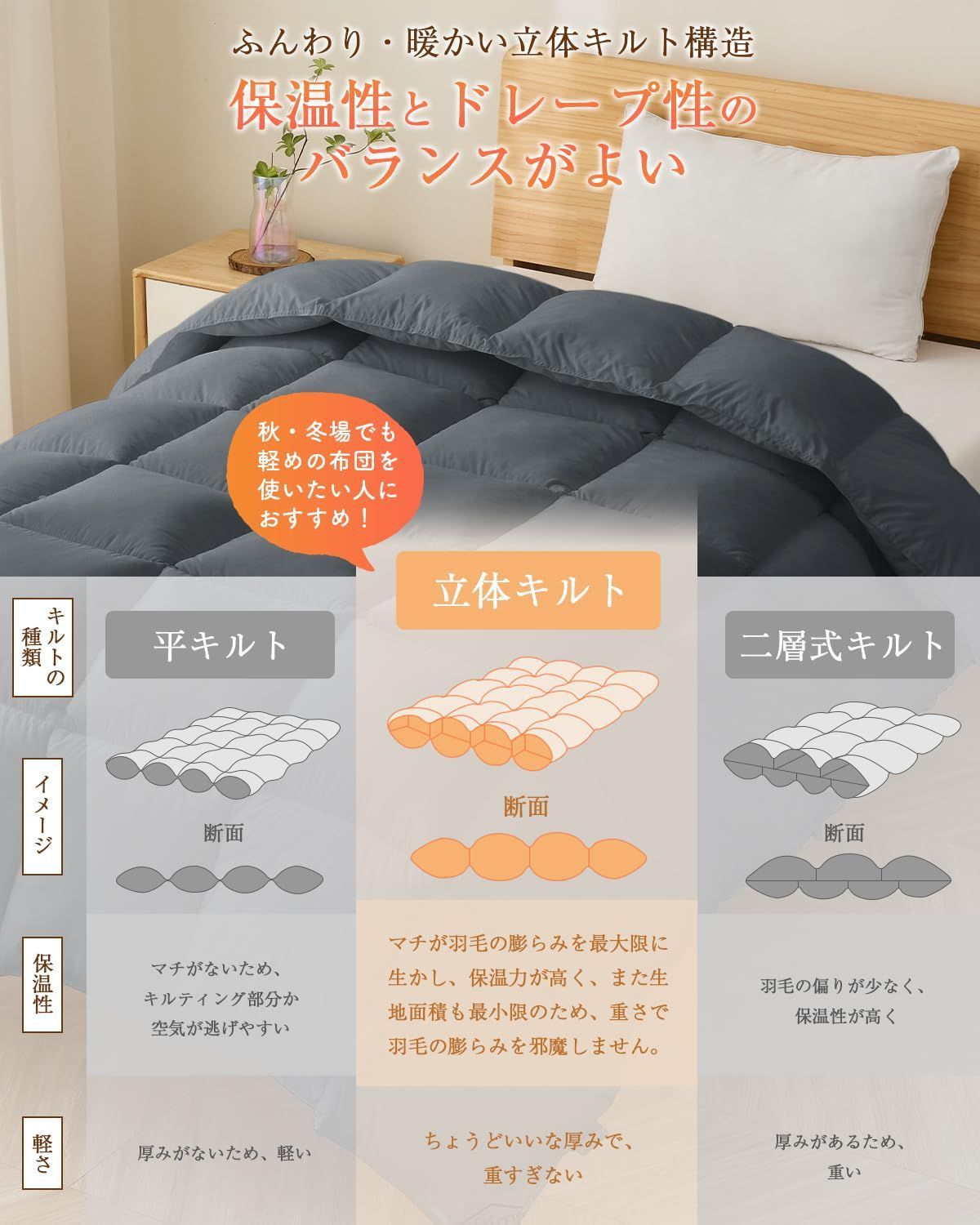 【立体キルト構造・保温性とドレープ性のバランスがよい】立体キルト加工により、お布団と身体の隙間ができにくく、暖かさをしっかり閉じ込めます。肩口から冷気が侵入するのを防ぎ、一晩中暖かさをキープ。さらに、高品質な「帝人FWALINE」を中綿に採用。肌に優しく沿い、ふんわりしなやかに身体を包み込みます。フィット性が高く、寝返りを打っても冷気が逃げにくいので、朝までぐっすりお休みいただけます。