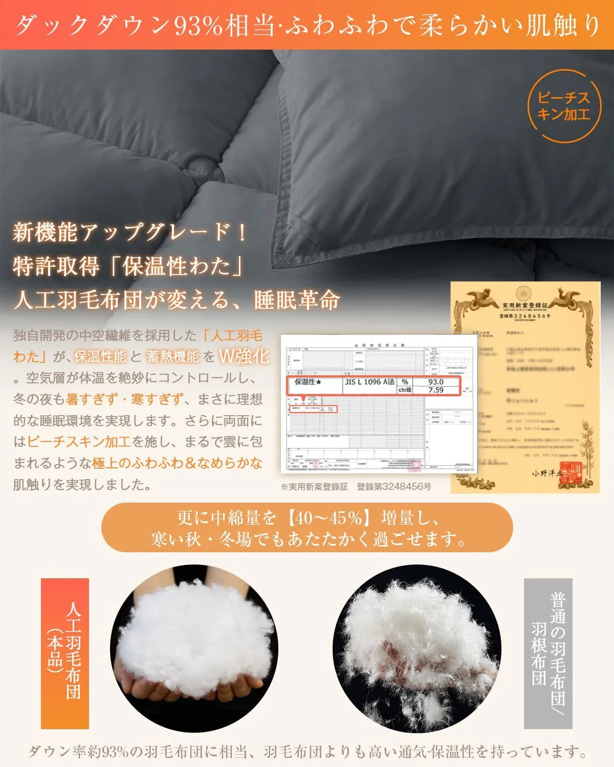 【ダックダウン93%相当・特許取得「人工羽毛」保温力UP】独自開発の中空繊維を採用した「人工羽毛わた」が、保温性能と蓄熱機能を強化しました。さらに中綿量を
