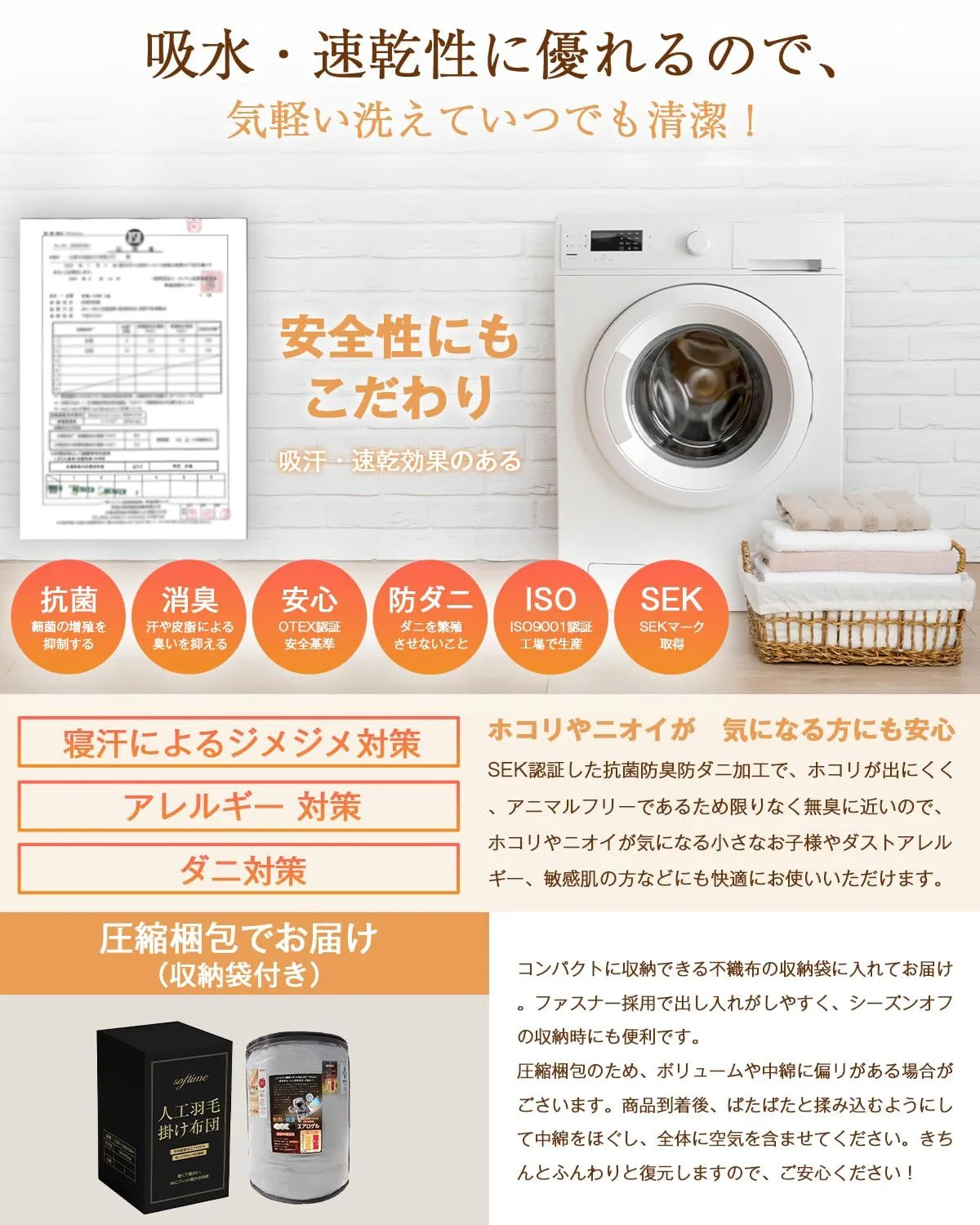 【SEK認証・抗菌防臭防ダニ加工】ダニを寄せ付けにくく、優れた抗菌防臭効果で細菌の増殖や汗の臭いを抑制します。羽毛独特のニオイが苦手な方にもおすすめです。