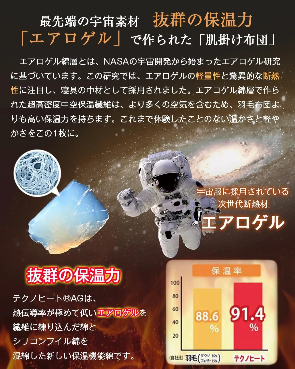 【宇宙服素材エアロゲル採用・軽量&高断熱】極小ナノファイバーが真空層を形成する「エアロゲル繊維」は、宇宙服にも採用されるほどの次世代断熱素材。驚きの軽さで高い断熱性を発揮し、外の冷気をシャットアウトしながらも、適度な通気性で湿気を逃がします。羽毛布団を上回る保温力で、良質な睡眠をサポートします。