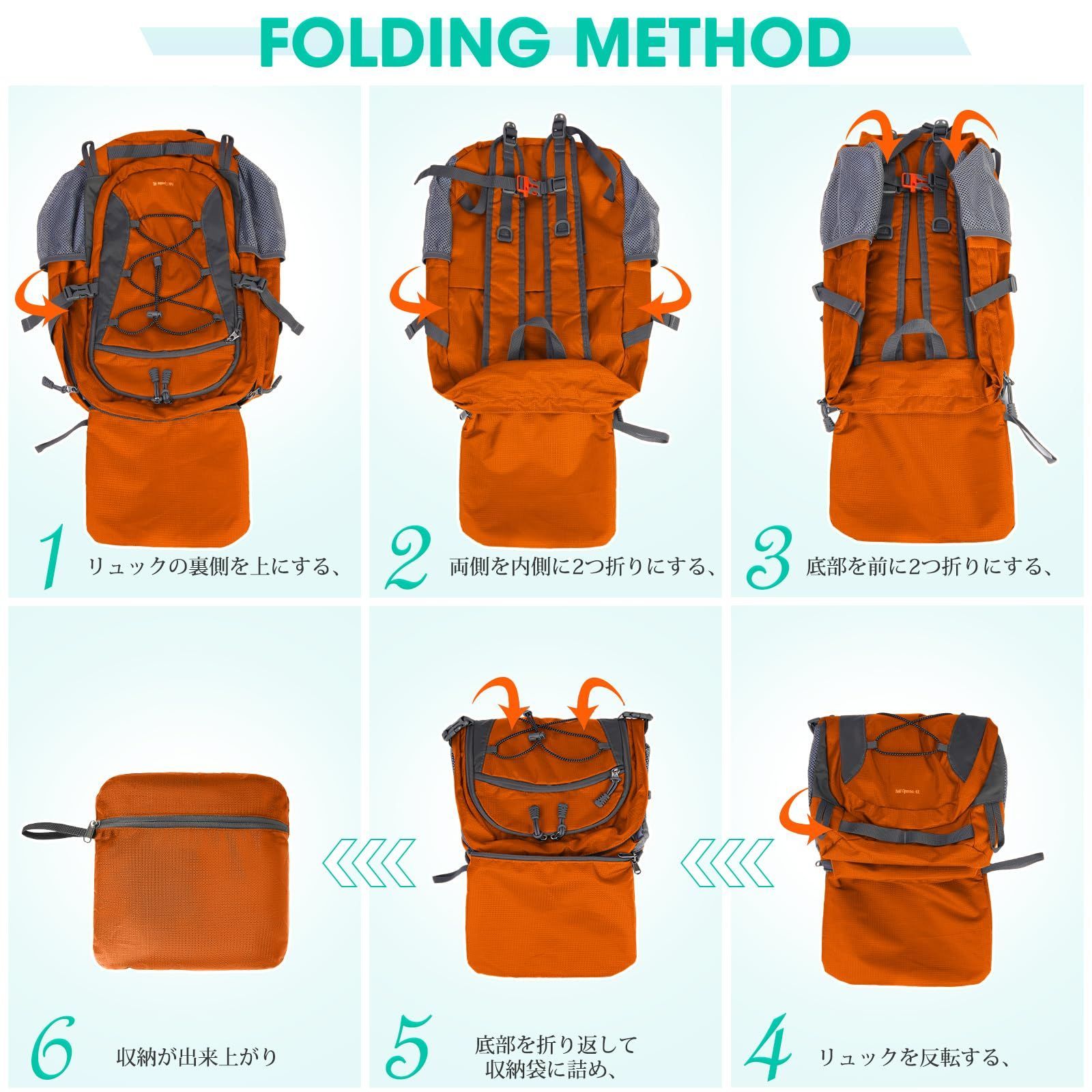『コンパクトで非常に安全』:このリュックサックは40リットル収容でき、重さはわずか1ポンド。折りたたみやすく、サイズは27 x 27 cmしかありません。両側の伸縮可能な靴ひもは登山杖や他の杖を固定するのに役立ちます。リュックサックの前部のゴムひもはものを固定することができます。反射マークは夜にも安心で、胸に付いたホイッスルの音は危険を回避するのに役立ちます。