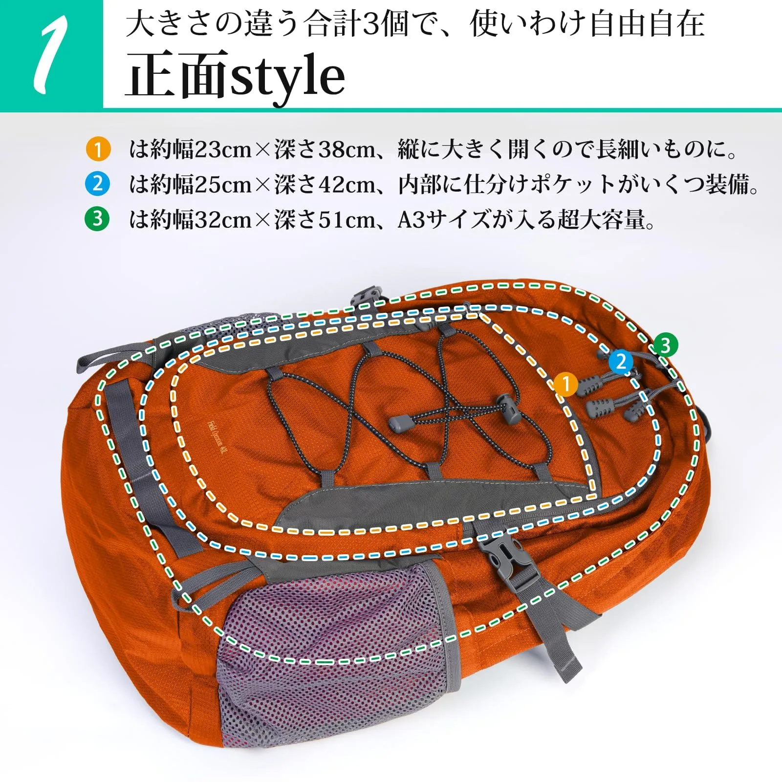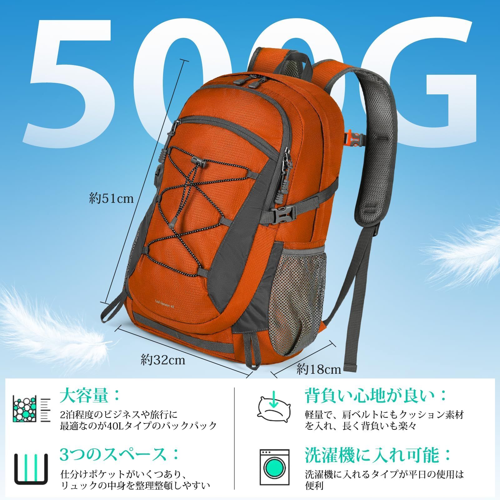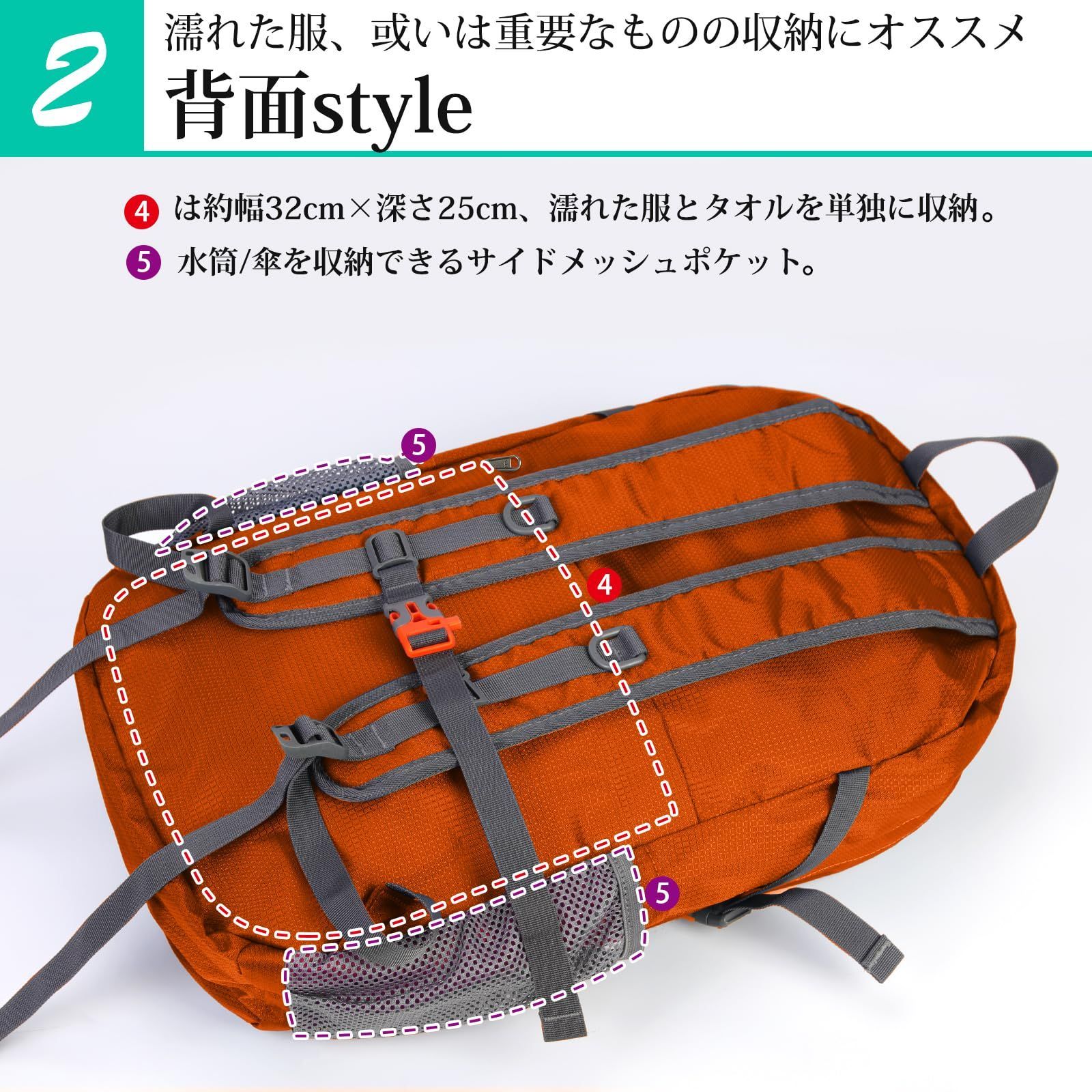 『大容量』:このバックには複数の間仕切りが含まれており、より多くの物を保管し、整理するに役立ちます。メインポケットのほか、正面ポケット2つ、水筒と折りたたみ傘のためのサイドポケット2つ、背中ポケットも乾湿分離機能を与えて、アウトドアや普段の持ち運びにぴったりな大きなリュックサック。