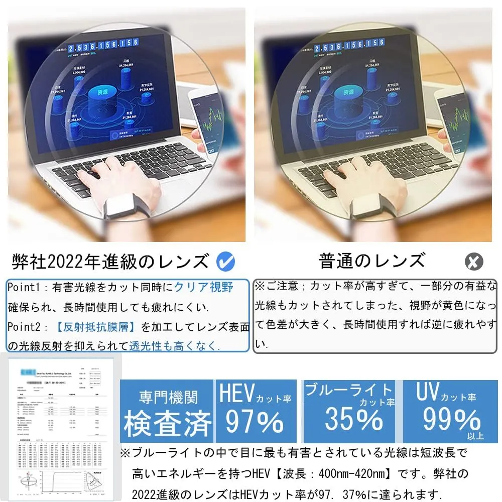 【ブルーライトカットメガネ】長時間スクリーンを見ると、眼疲労、神経のストレスにつながり、睡眠の質、肩こり、腰痛に影響する恐れがあり、Granvanブルーライトカットメガネは高品質のブルーライトレンズを採用し、HEV90%以上、ブルーライト35%カット、パソコン、スマートフォン、テレビ、PCなどのスクリーンから発するブルーライト、青色光と輻射をカットできる、大切な目を守る. ★