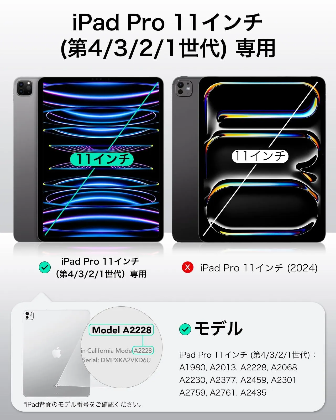 【互換性】:iPad Pro 11インチ(2022/2021/2020/2018、第4/3/2/1世代)に対応。モデル番号:A2435, A2759, A2761, A2301, A2377, A2459, A2228, A2068, A2230。ご注意:この製品はiPad Pro 11インチ M4(2024年、第5世代)とは互換性がありません