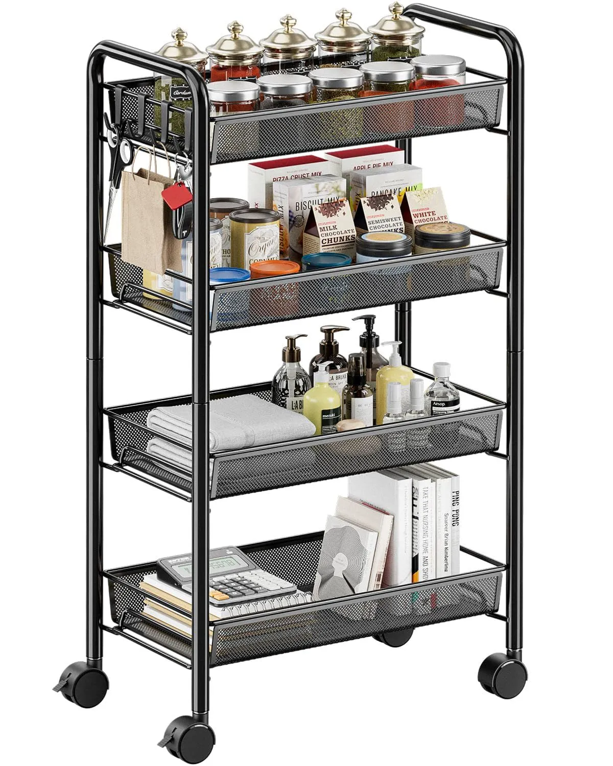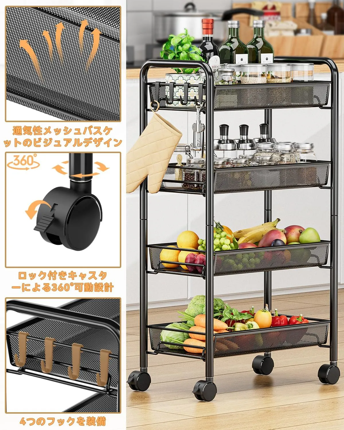【人気商品】幅26.5×奥行45.5×高さ84.5cm 洗濯機 ブラック 浴室用 洗面所 キッチン 多機能 隙間収納 キッチン棚 4段 キャスター付き ワゴン キッチンワゴン EKNITEY