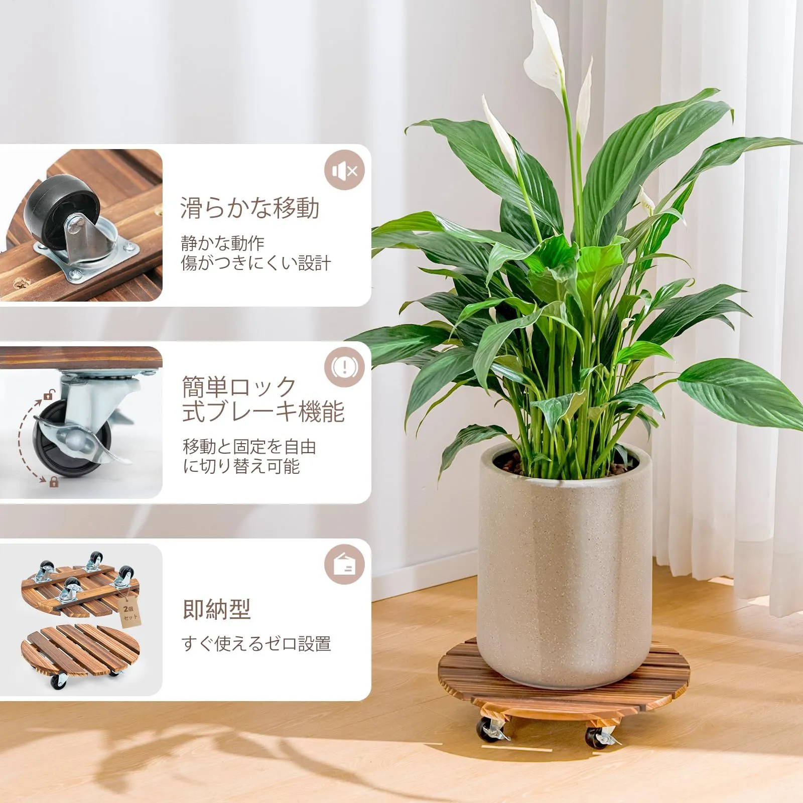 360°回転可能なキャスター付き:2輪ロック機構で、植木鉢 スタンドのスムーズ移動と確実な安定性を実現。壁際やコーナーでも自在に配置可能です