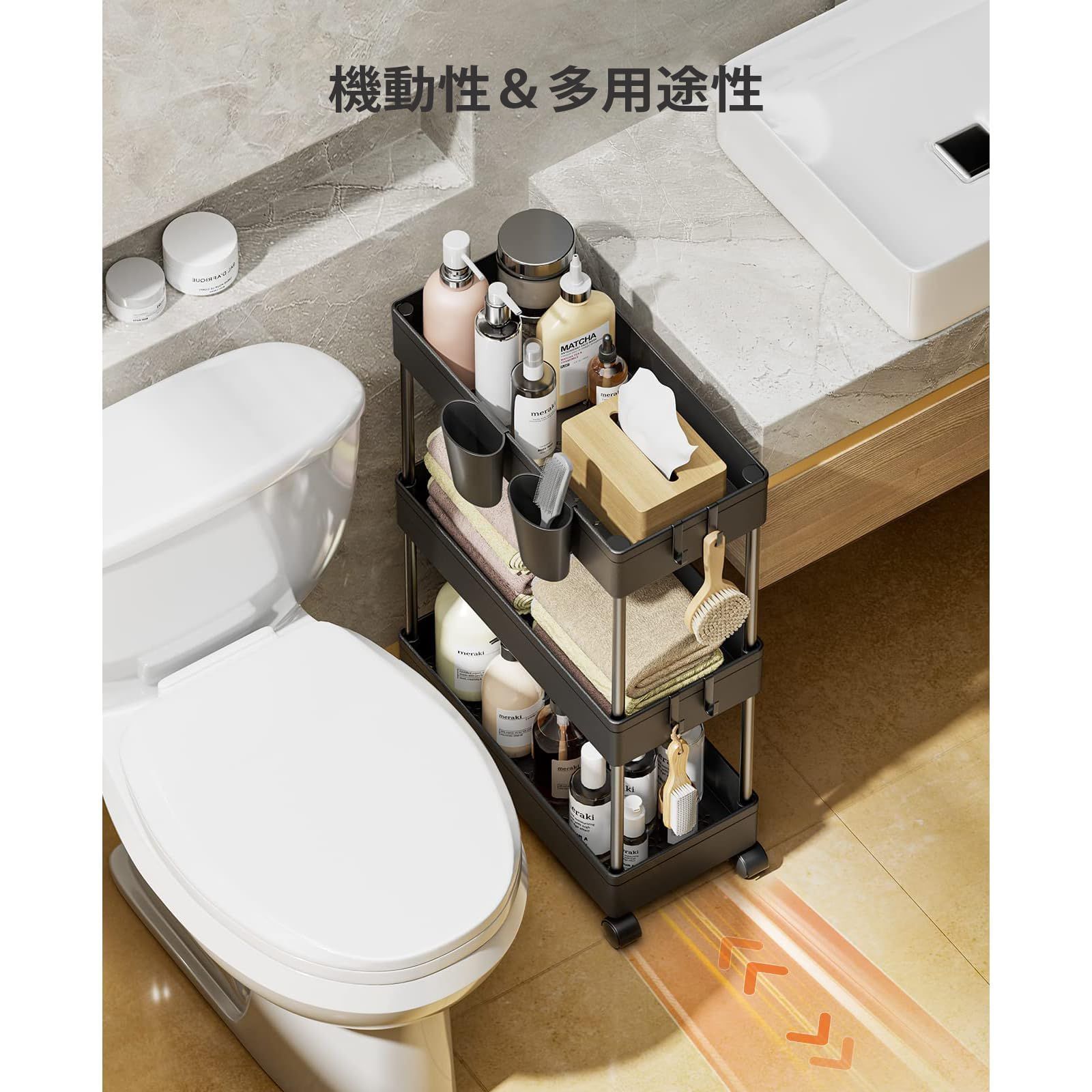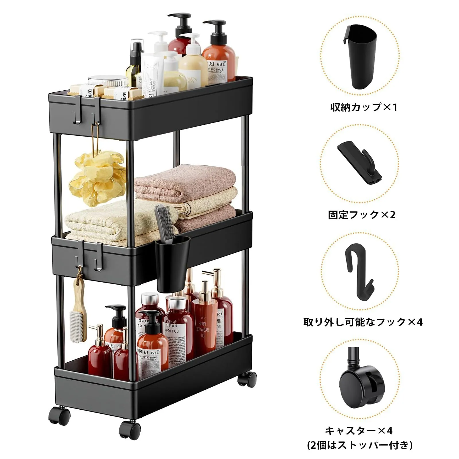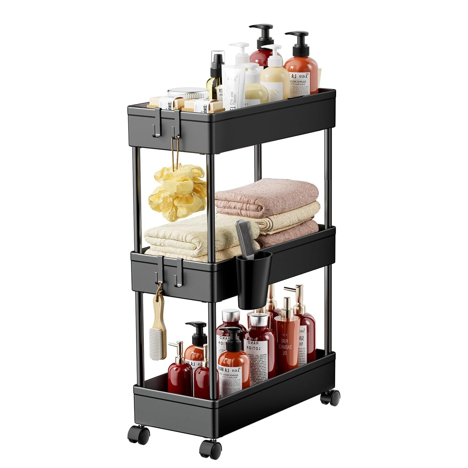 【人気商品】浴室 台所 トイレ 冷蔵庫横 細い棚 22cm 18cm 3段 13.5cm 収納 4段 洗面所 キッチン おしゃれ 収納カート 組立簡単 スリム 隙間収納 フック&収納カップ付き ワゴン キャスター付き (3段式-[22cm]-ブラック) キッチ