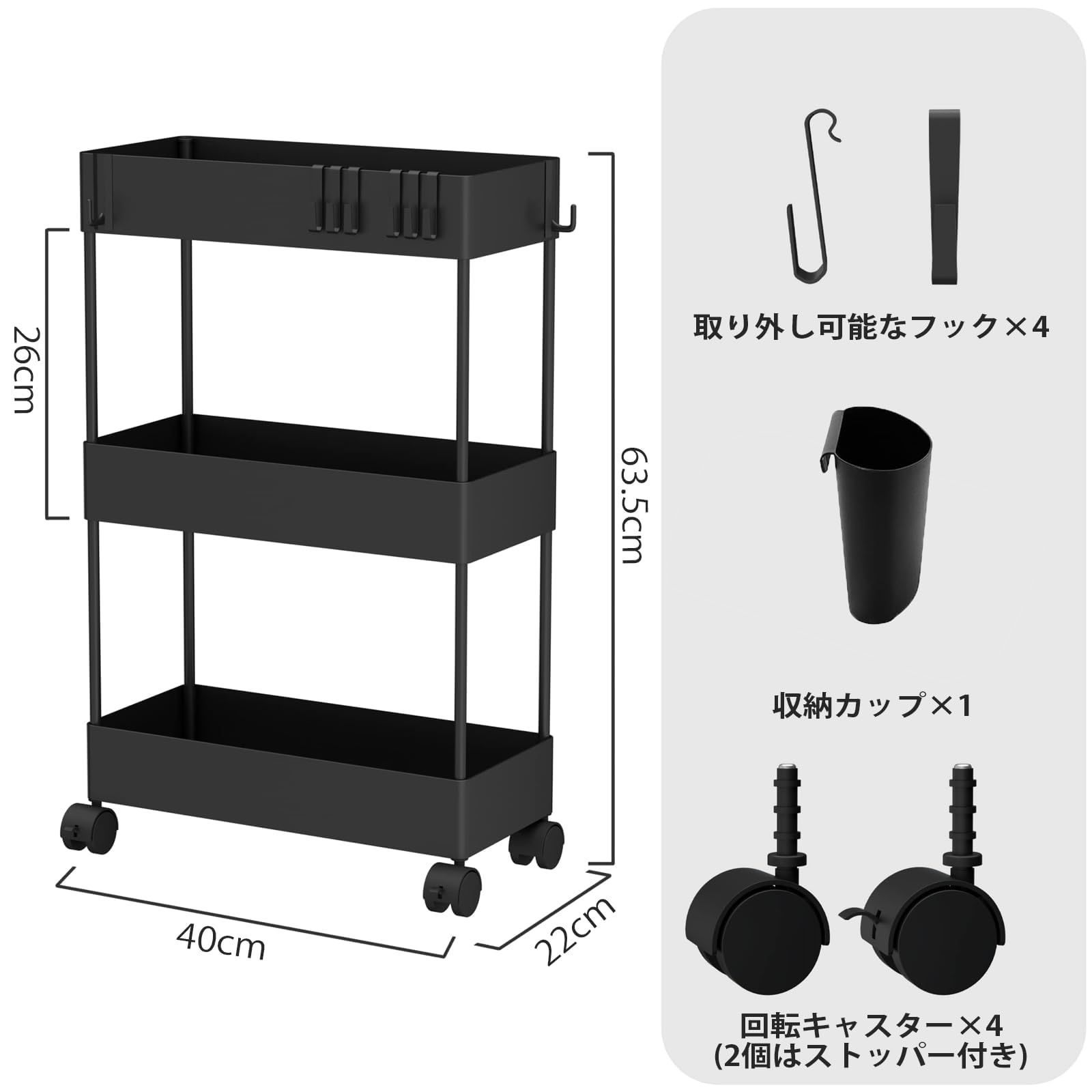 キッチンワゴン キャスター付き ワゴン 隙間収納 スリム 収納カート キッチン 洗面所 収納 13.5cm 18cm 22cm 冷蔵庫横 台所 浴室 トイレ 細い棚 3段 4段 おしゃれ 組立簡単 フック&収納カップ付き (3段式-[22cm]-ブラック)