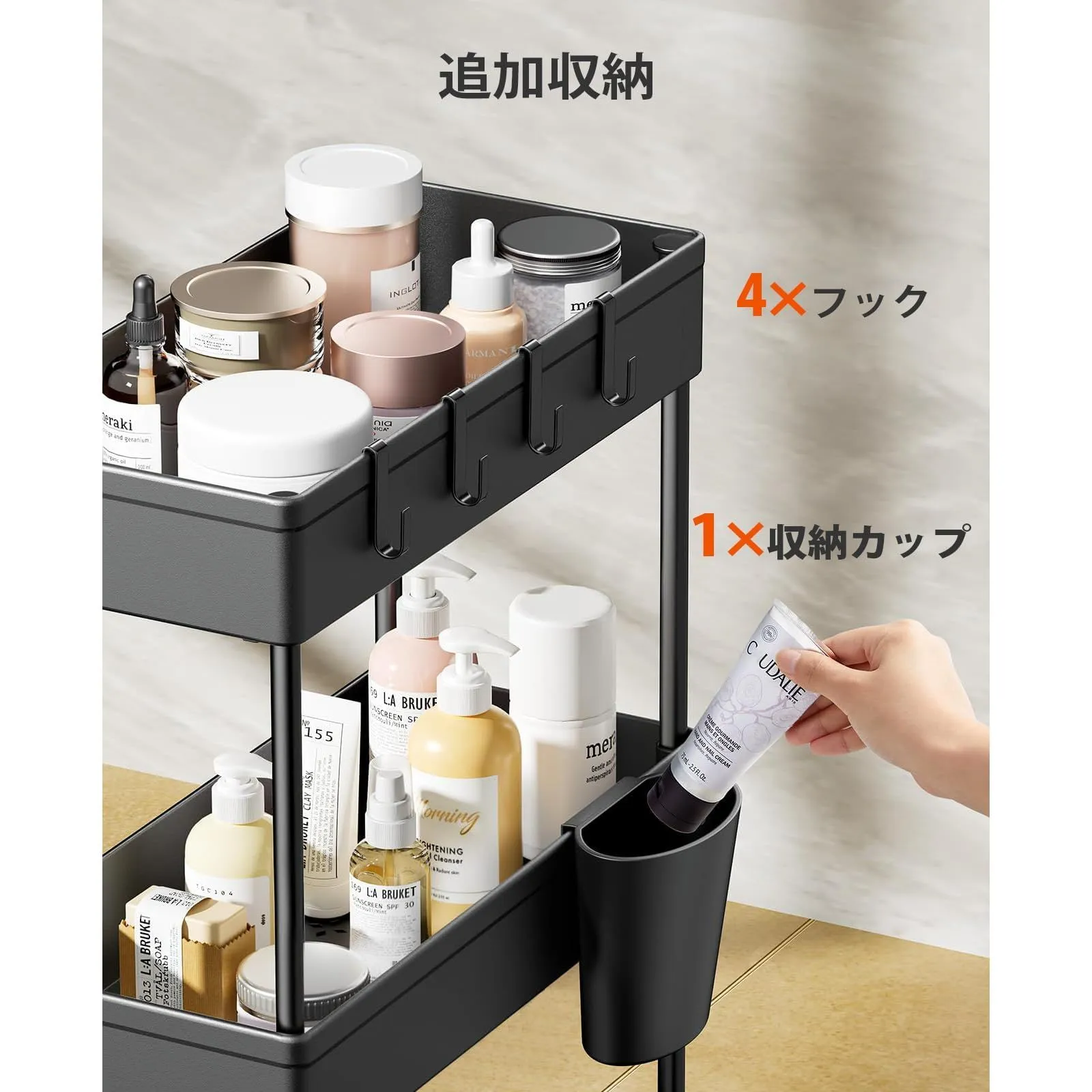 【フック&カップ付きで収納力アップ】キッチンワゴンには固定フック(4個)だけでなく、取り外し可能なフック(4個)と収納カップ(1個)が付属しており、収納力が大幅に向上し、必要に応じてワゴンの異なる位置に取り付けることができ、より柔軟な使用が可能になります。