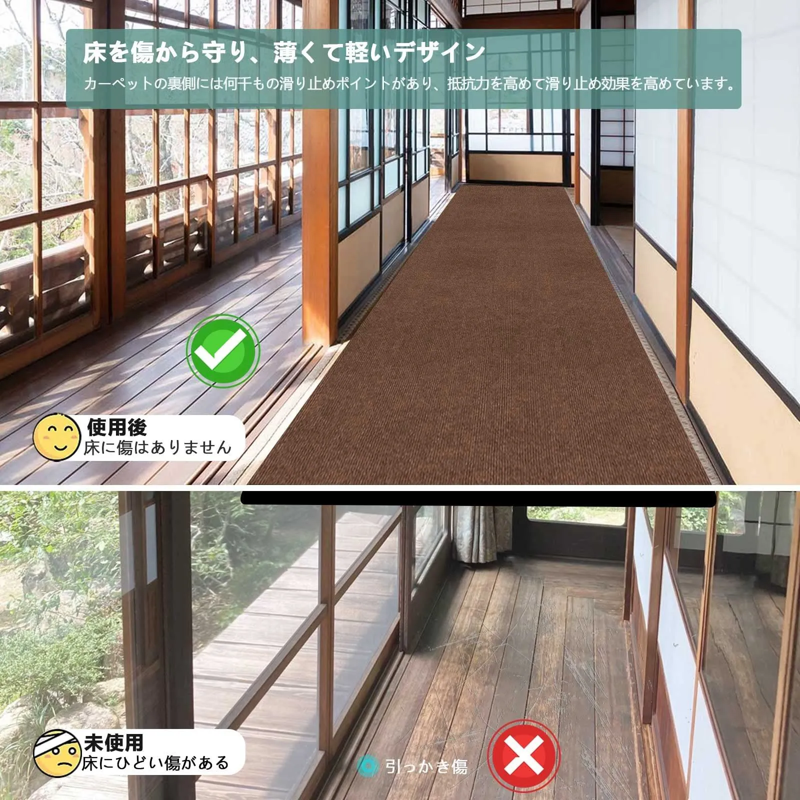 【快適素材】廊下のフロアマットは、表面が柔らかく快適で、厚さは約4mmです。足の裏とフロアマットの底との間の摩擦を減らし、家の木製の床を保護し、あらゆる床に適用します。 ?