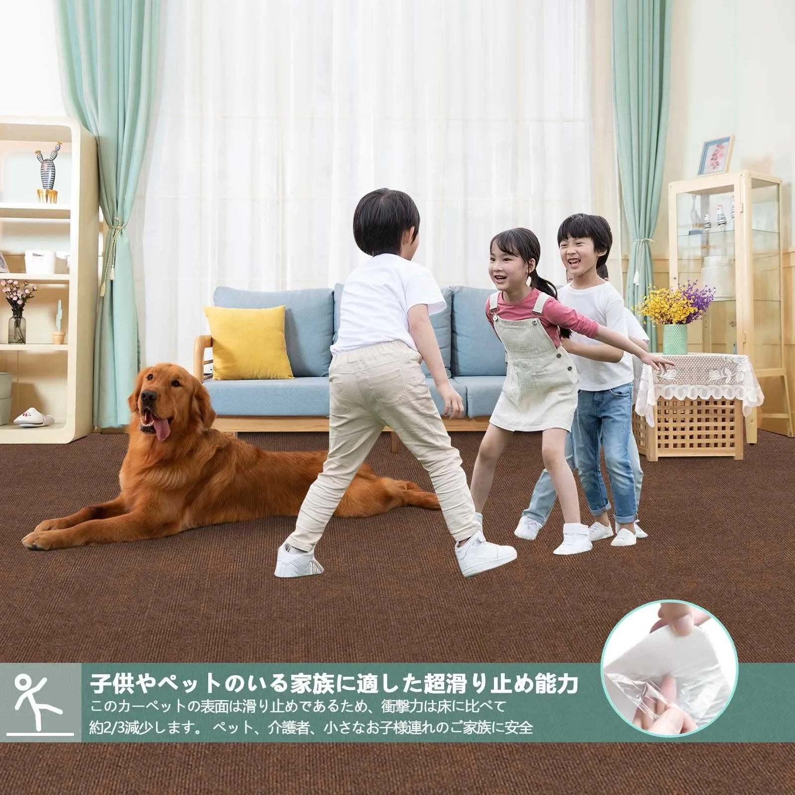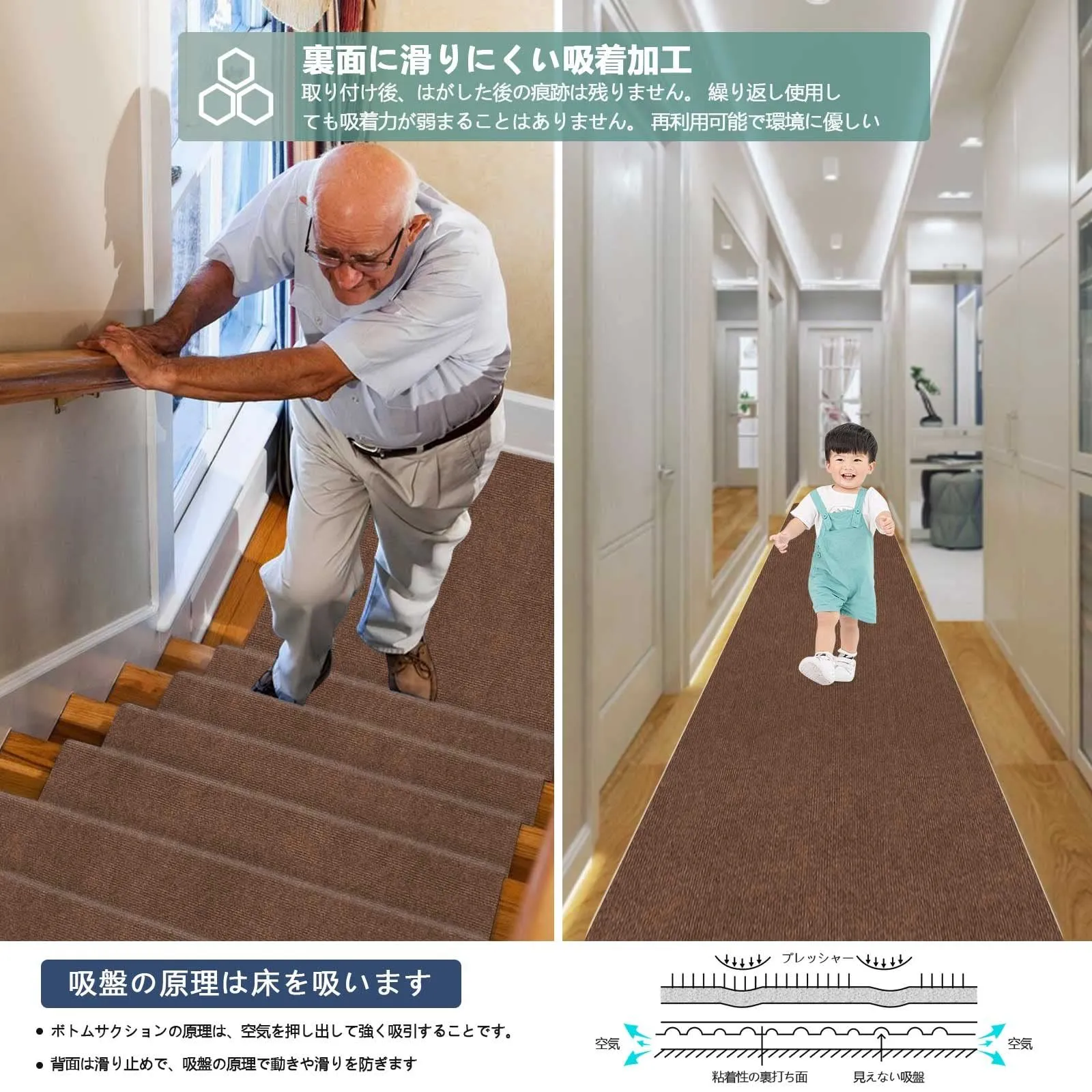 【ボトム吸着】フロアマットのボトムフィルムをはがすと、フロアマットを床に吸着させることができ、お年寄りやお子様のスポーツがとても快適になります。フロアマットの吸着機能を繰り返し使用できます。 ?