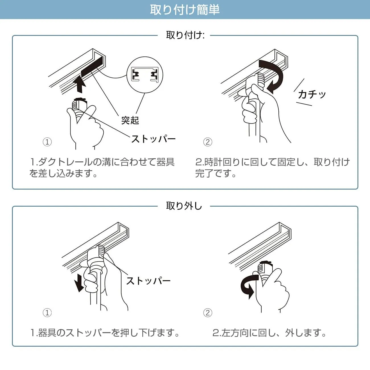 【高さ自由】場所に応じてコードの長さを付属のパーツで調節可能。レール式器具なので、普通の配線ダクトレールに差し込んで回すだけで設置完了。工具不要、配線ダクトレールやライティングレール上に自由に配置できます。
