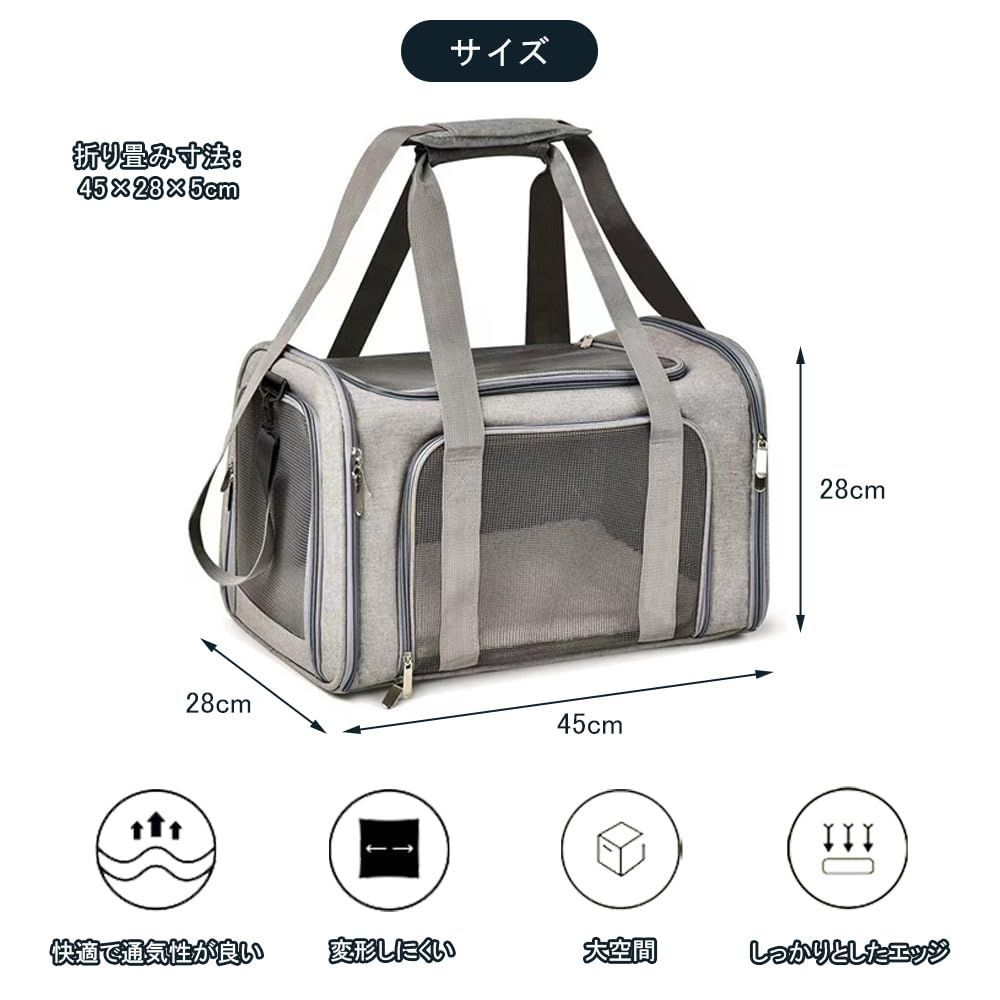 【広々とした快適な空間】折りたたみ式ペットキャリーの展開サイズは45cm x 28cm x 28cmで、9kg以下の小型ペットに適しています。中大型の猫、小型犬、うさぎなど、さまざまな小型ペットに対応しています。内部の空間は広々としており、ペットが旅行中に圧迫感を感じることはありません。柔らかい中敷きマットも付属し、ペットにより快適な休息環境を提供します。