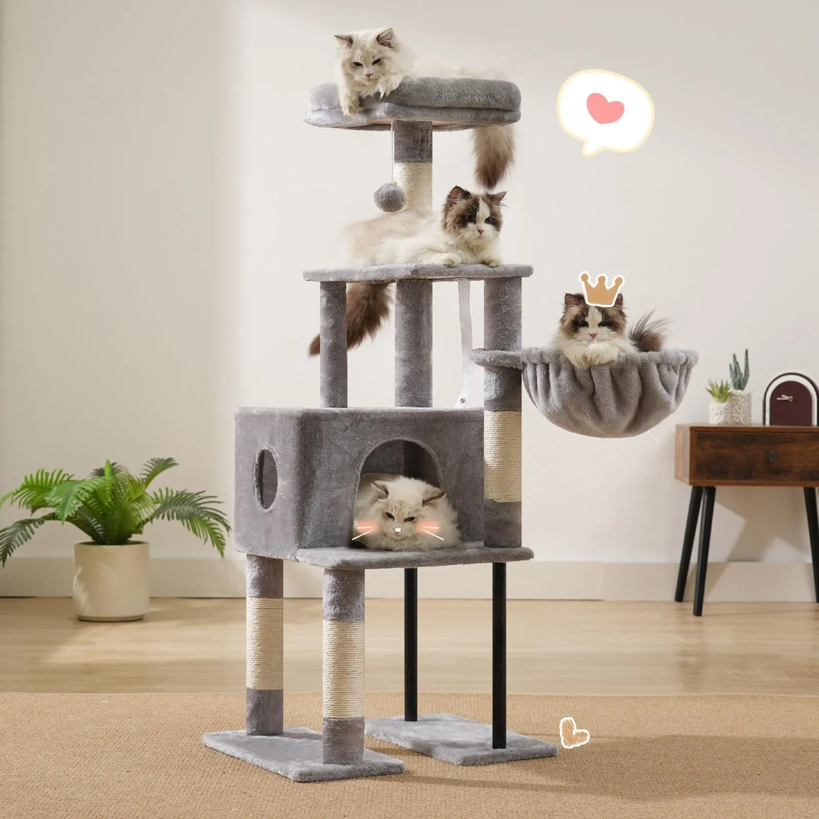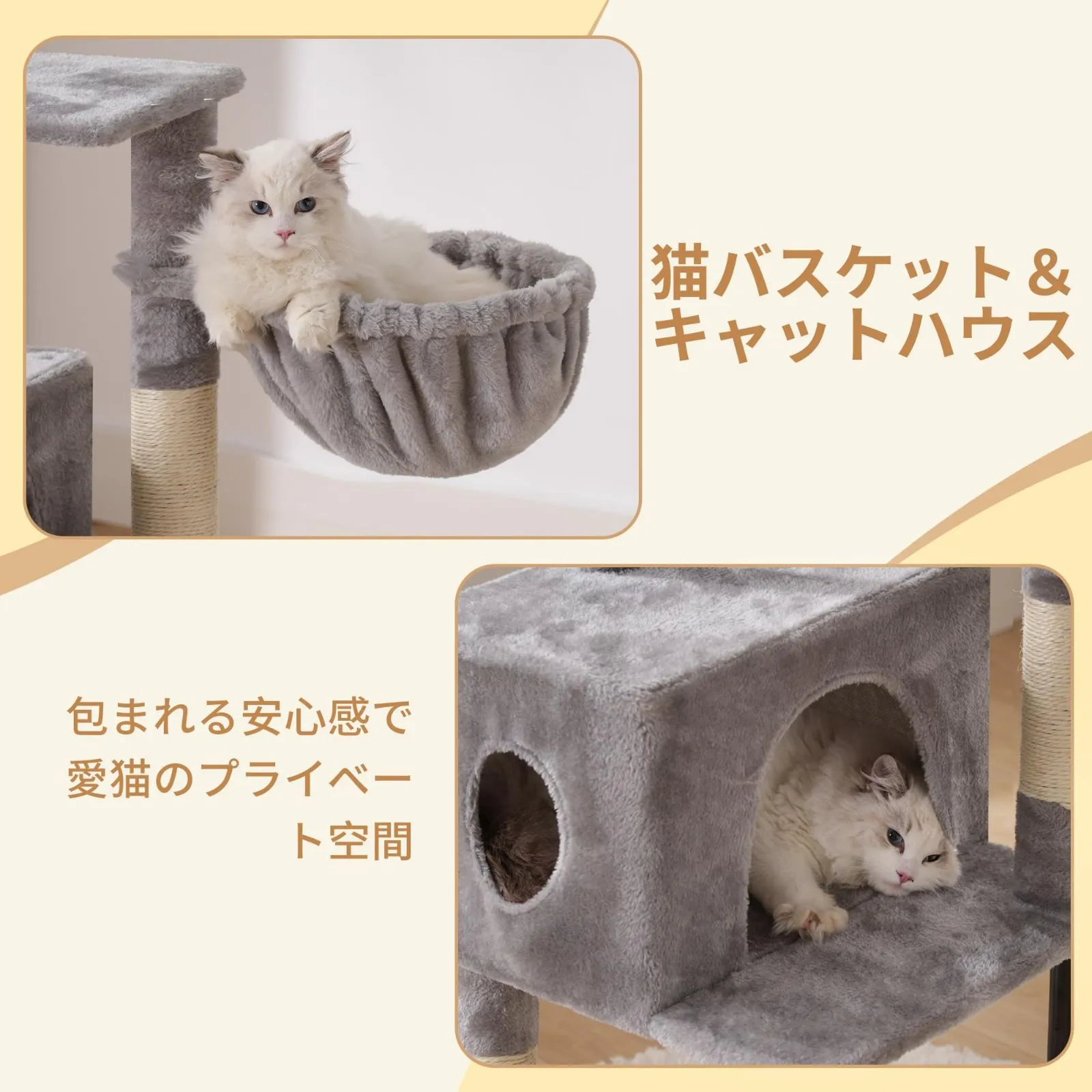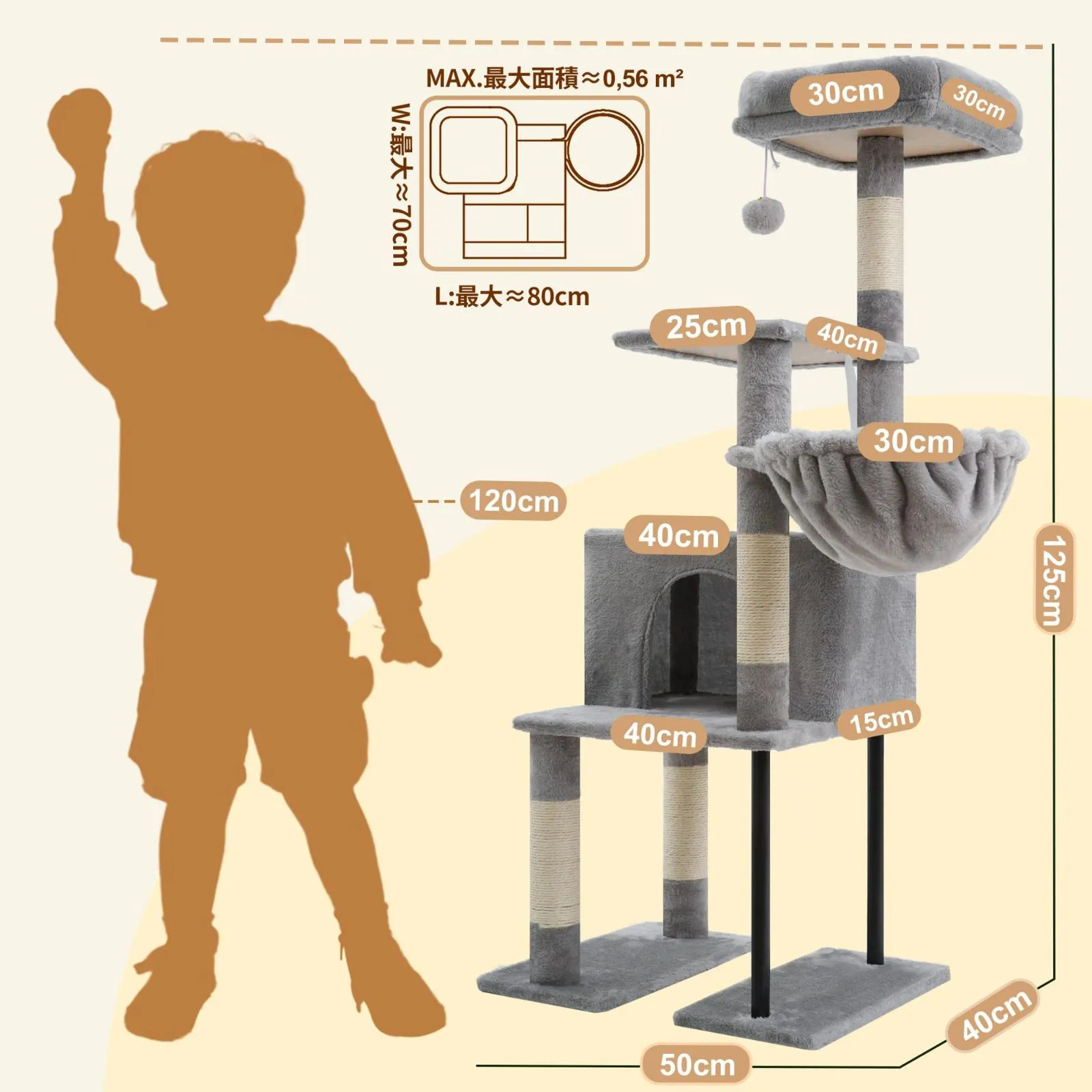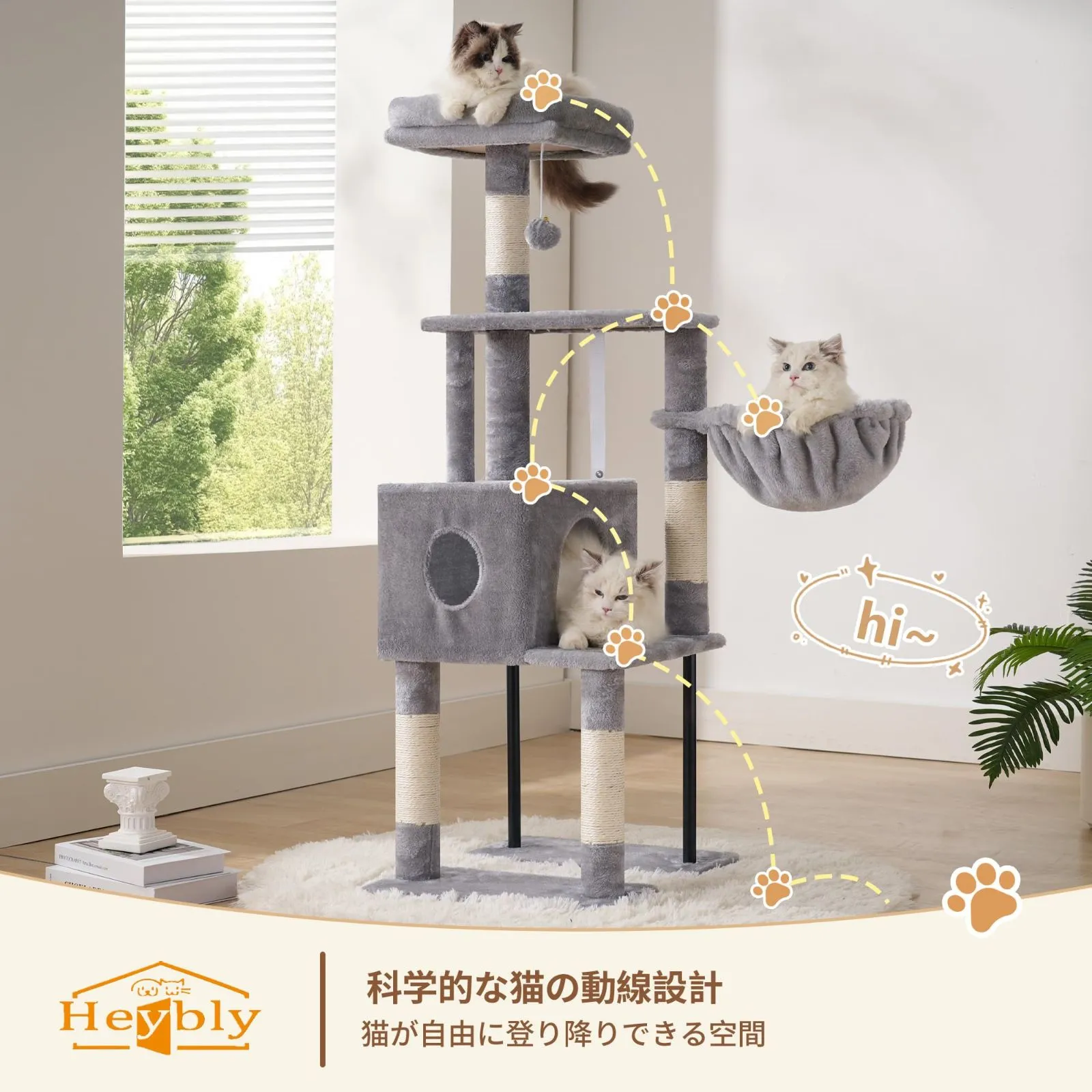 Heyblyキャットタワー 超スリム 高さ125cm 省スペース 猫タワー 高い安定性 展望台 柔らかいハンモック 据え置きタイプ シザル麻爪とぎポール ライトグレー HCT200SW