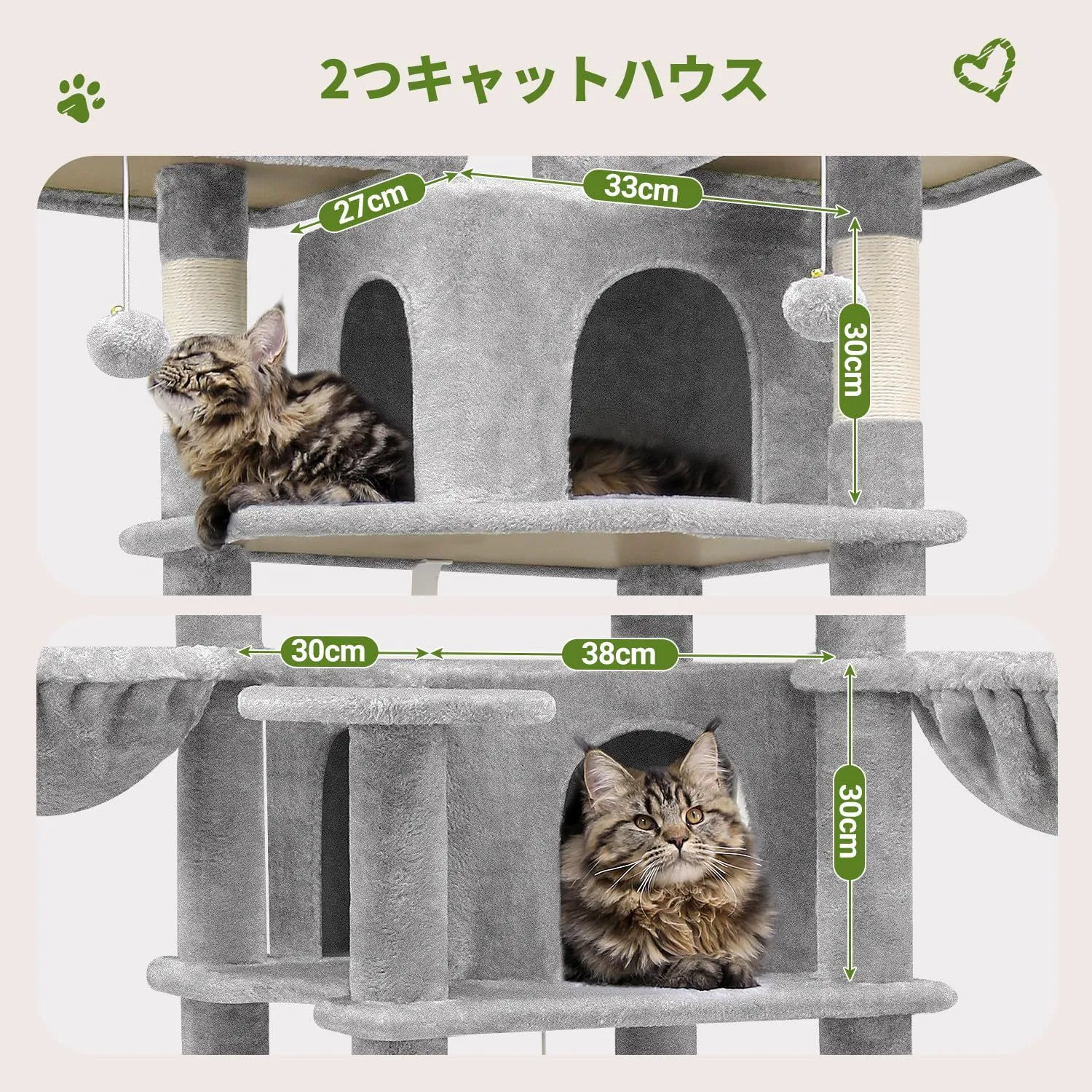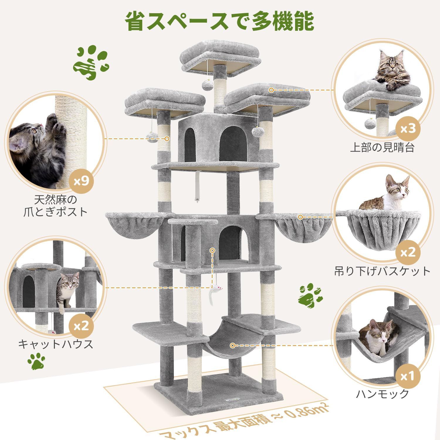 【即日発送】取り外し可能な展望台3つ 大型猫用 キャットハウス2つ 多頭飼い 特大ハンモック と柔らかく快適な吊り下げバスケット2つ 猫タワー 複数の天然麻紐の爪とぎポスト 多機能 ぬいぐるみボールおもちゃ3つ 据え置き型 ぬいぐるみマウスおもちゃ2つ 転倒防