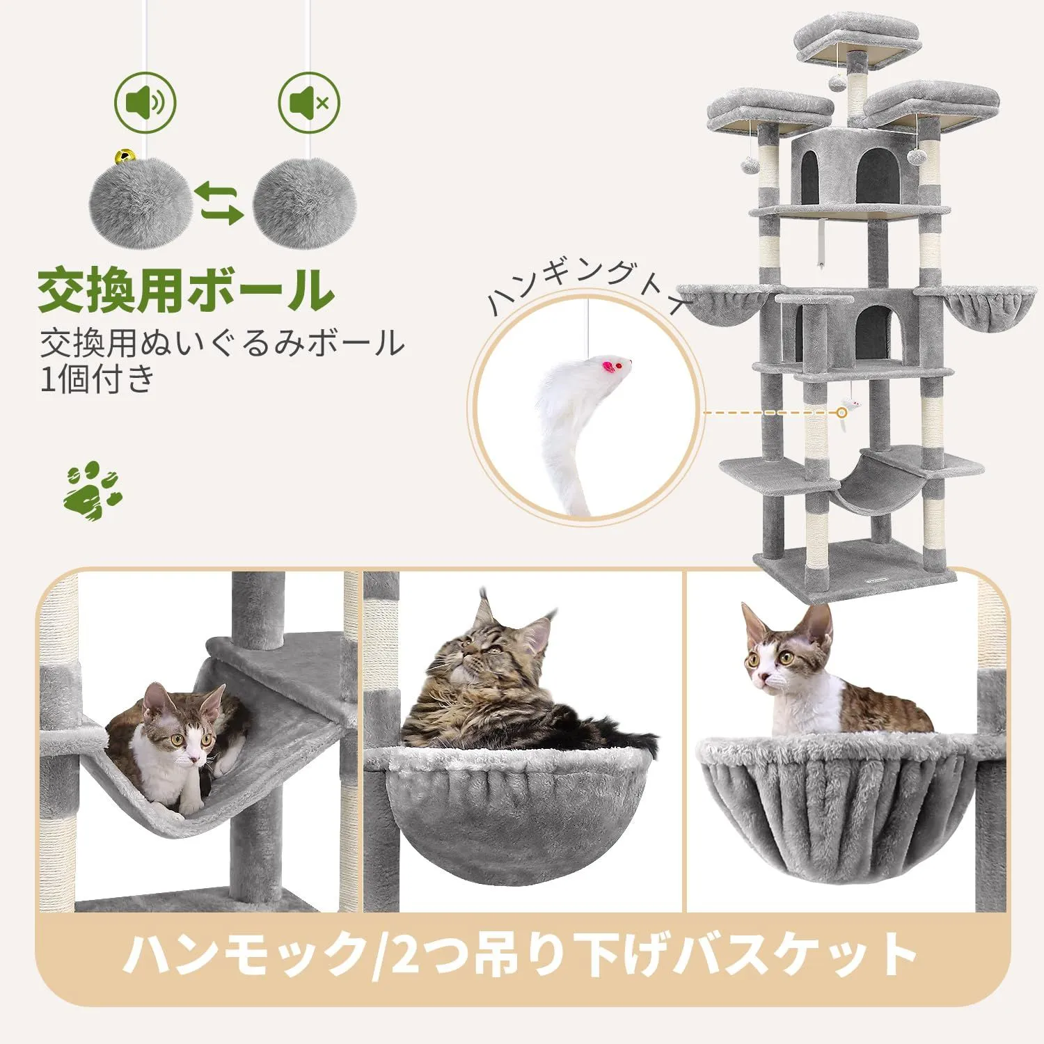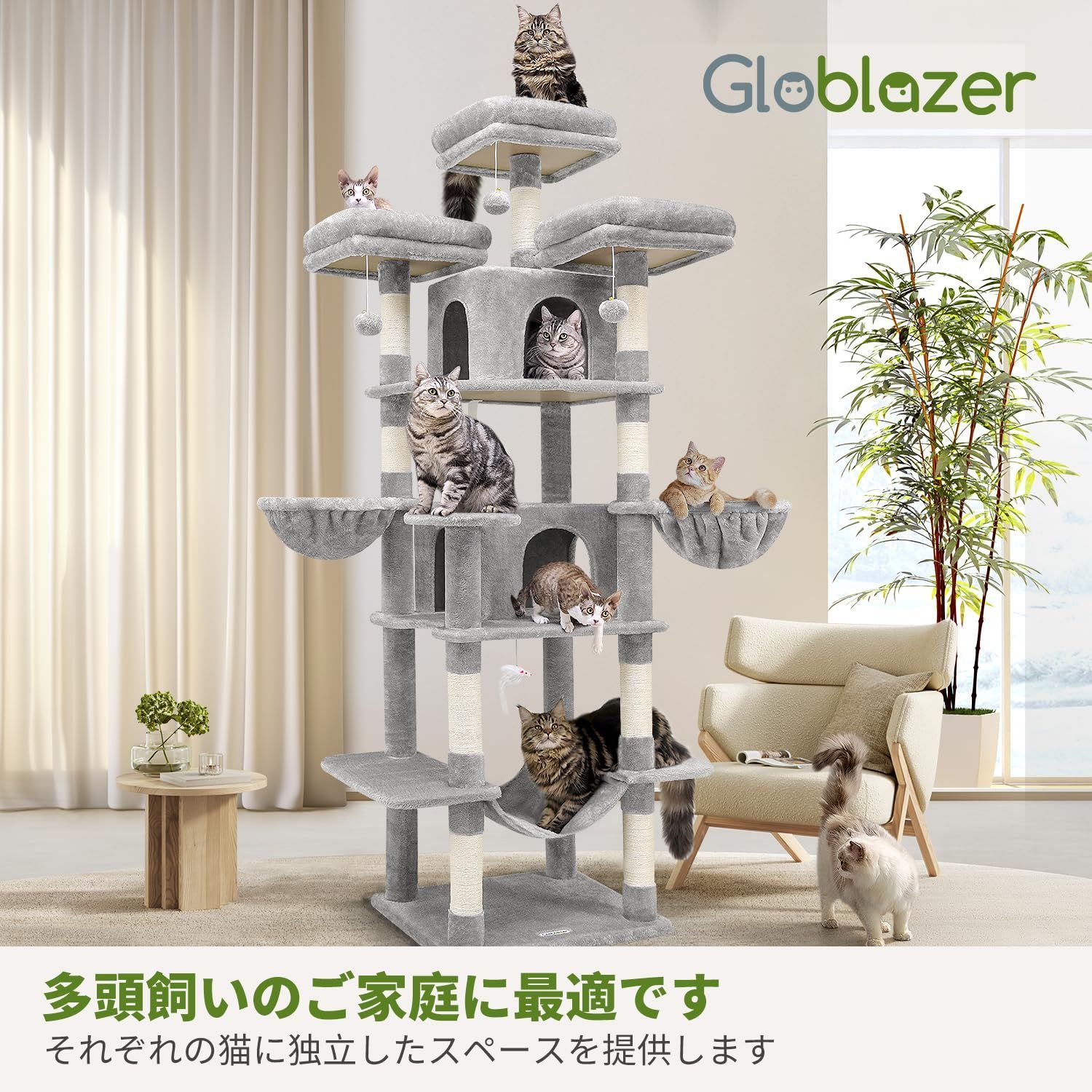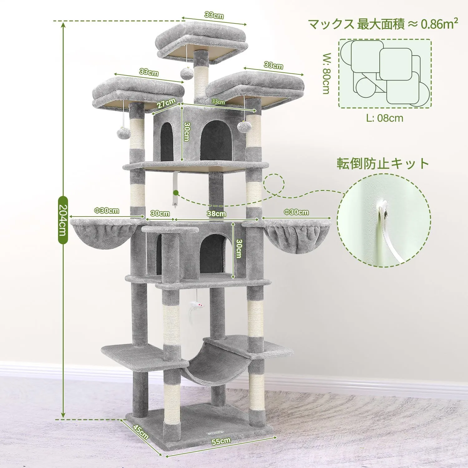 Globlazer キャットタワー ラージサイズ 高さ204cm 据え置き型 多機能 猫タワー 多頭飼い 大型猫用 取り外し可能な展望台3つ キャットハウス2つ 特大ハンモック と柔らかく快適な吊り下げバスケット2つ 複数の天然麻紐の爪とぎポスト ぬいぐるみボールおもちゃ3つ ぬいぐるみマウスおもちゃ2つ 転倒防止ストラップ 強い安定性 簡単に登れる 運動不足解消 ライトグレー F80