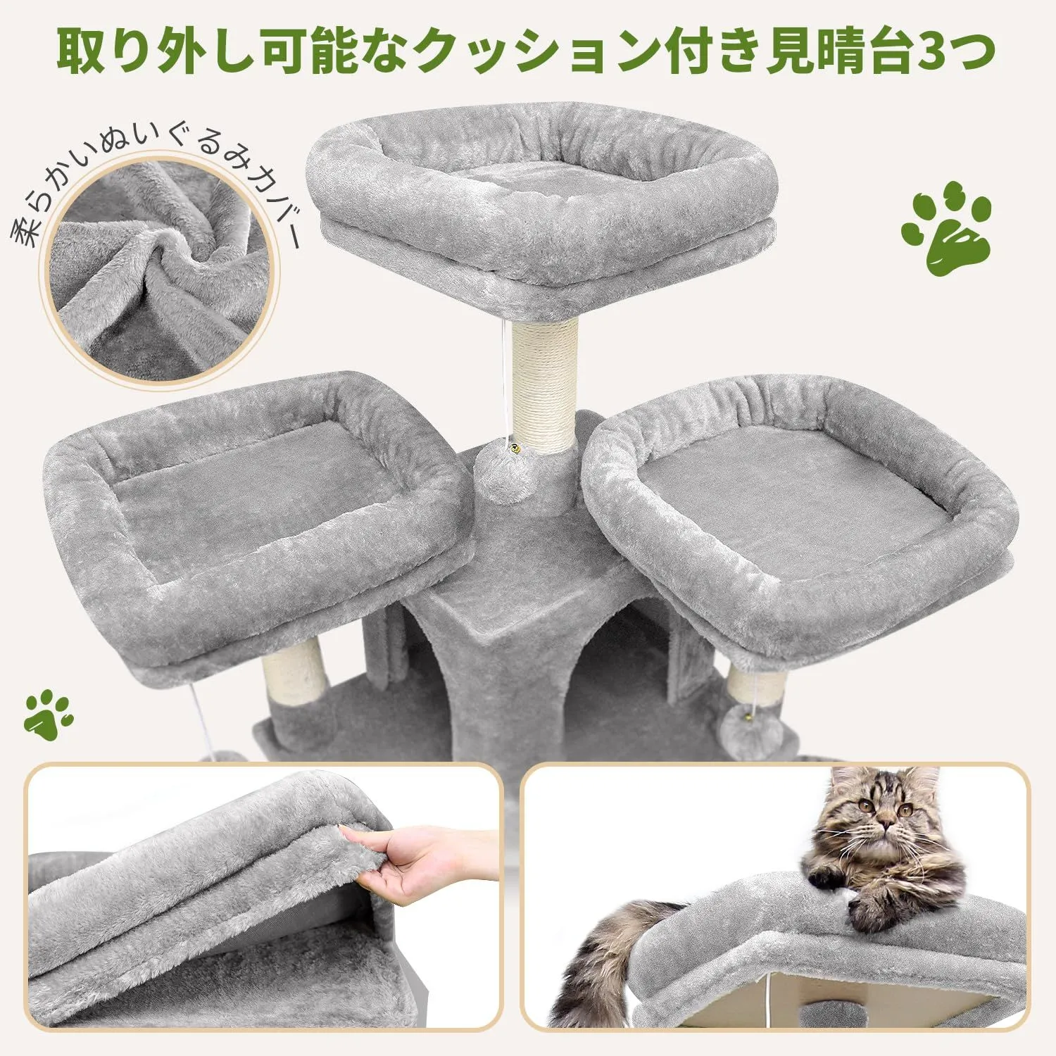 【取り外し可能なパッド付き展望台3つ】キャットタワーの上部には、取り外し可能なパッド付き見晴台が3つ付いており、最大3匹の猫が高い位置から周囲を観察したり、リラックスしたり、縄張りを確認したりすることができます。