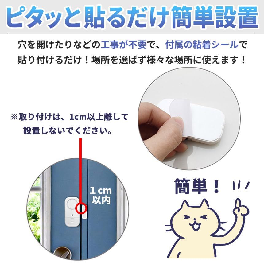 【簡単取り付け】付属の粘着シールで貼りつけるだけなので穴を開けたりなどの工事が不要で、ドアや窓・窓枠や引き出しなど様々な場所に取り付けできます。(本体と磁石の距離が1cmを超えないように設置してください。)