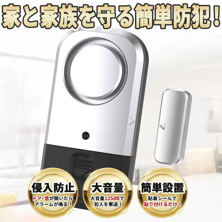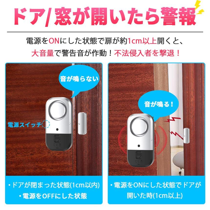 ドア・窓を開けると音が鳴る!おうちへの不法侵入を防止する最強防犯グッズ!電源をONにした状態でドアや窓が約1cm以上開くと大音量で警告音が鳴ります。外出時や睡眠中の防犯対策やお子様が勝手に出て行かないように守る用途でも使えます。ドアや窓以外にも、引き出しや押し入れ、たんすなど様々な場所に取り付けることができます。