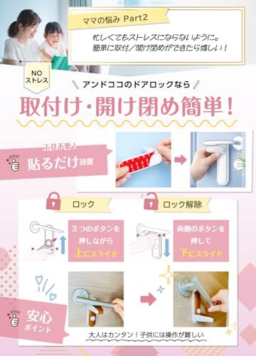 【片手で解錠!大人は1秒、子供には開けられないロック】 大人なら上下のボタンをつまんで回すだけのワンタッチ操作。子供の力では解除しにくい構造で、しっかりドアロックします。「赤ちゃんを抱っこしたまま」「荷物で手が塞がっている」時でもスムーズに通れるのが強みです。ドアストッパーとして一時的に開放したい時は「常時オープンモード」に切り替え可能。家事の動線を邪魔しません。