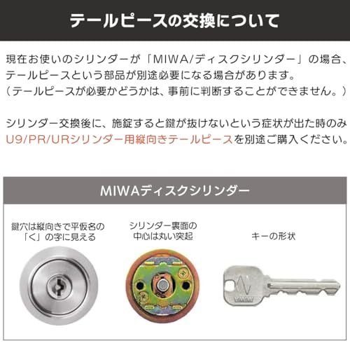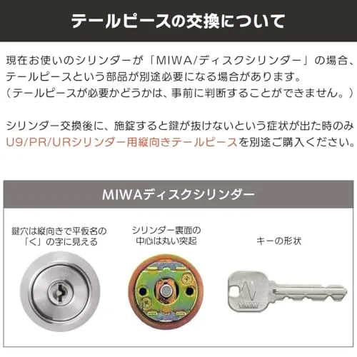 MIWAのディスクシリンダーがついている場合、テールピースという部品の交換が必要なことがあります。交換が必要かは事前には判断できないため、購入して取り付けてみて、鍵が抜けないという症状が出たときのみ別売のテールピースをご購入下さい。