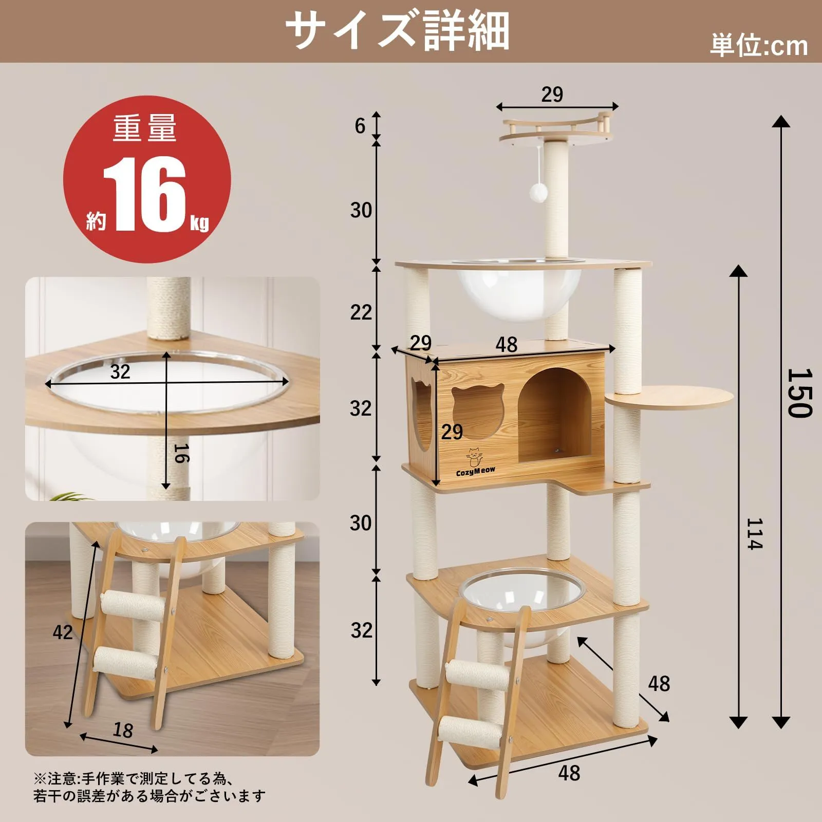 【簡単な組み立てと安心のサポート】この製品は組み立てが簡単で、日本語の説明書と設置動画が付属しており、必要な工具も全て揃っているため、どなたでも簡単に組み立てることができます。部品に不具合や欠陥があった場合も無料で交換可能です。充実したアフターサービスにより安心して購入でき、設置後すぐに愛猫が快適に遊べます。ご不明点やご質問がある場合は、丁寧なサポートを随時提供いたします。 商品の寸法 50長さ x 150幅 x 50高さ cm 推奨種 中型, 大型, 小型 商品用途・使用方法 クライミング, ジャンプ 商品の推奨用途 インドア 材質 MDF+白麻 最後までご確認頂き誠にありがとうございました。 上記をご確認頂き、ご購入いただけましたら幸いです。 何かご不明な点がございましたらお気軽にメッセージからお問い合わせ下さい。