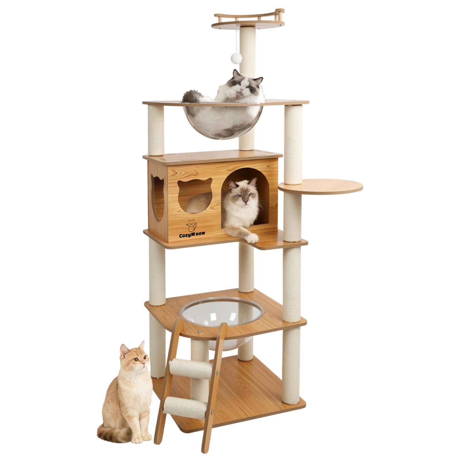 【多機能デザイン】幅50×奥行50×高さ155cmの木製キャットタワーは、爪とぎ・ジャンプ・キャットウォーク・ベッドをすべて備えた多機能モデルです。子猫から大型猫まで幅広く対応し、毎日の運動不足やストレスを効果的に解消。宇宙船型の休憩スペースやステップ式のキャットウォークが猫の好奇心を刺激し、遊びとくつろぎの両方を楽しめる、愛猫の理想的な遊び場です。