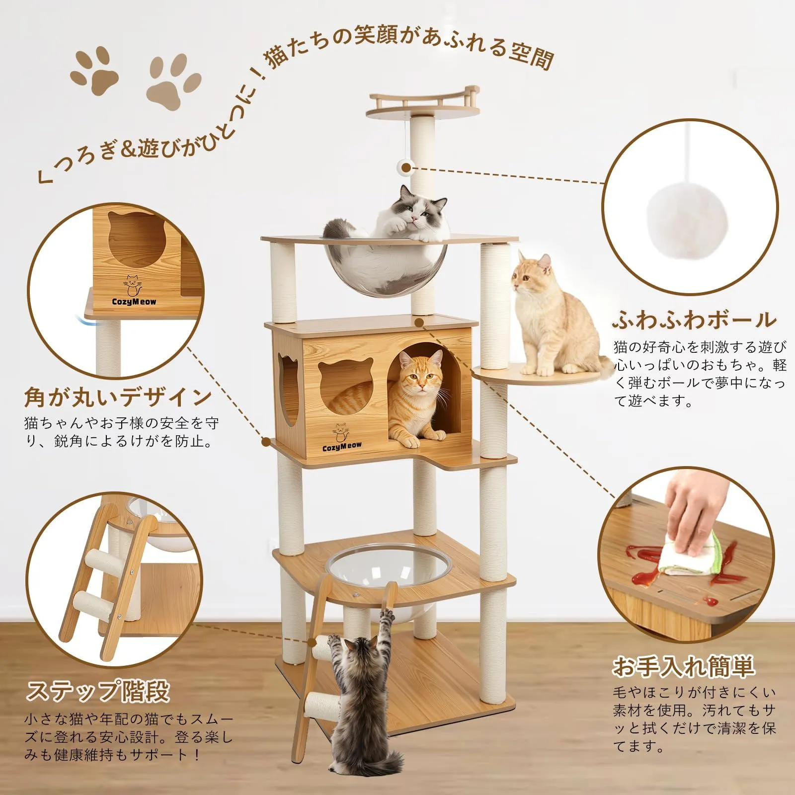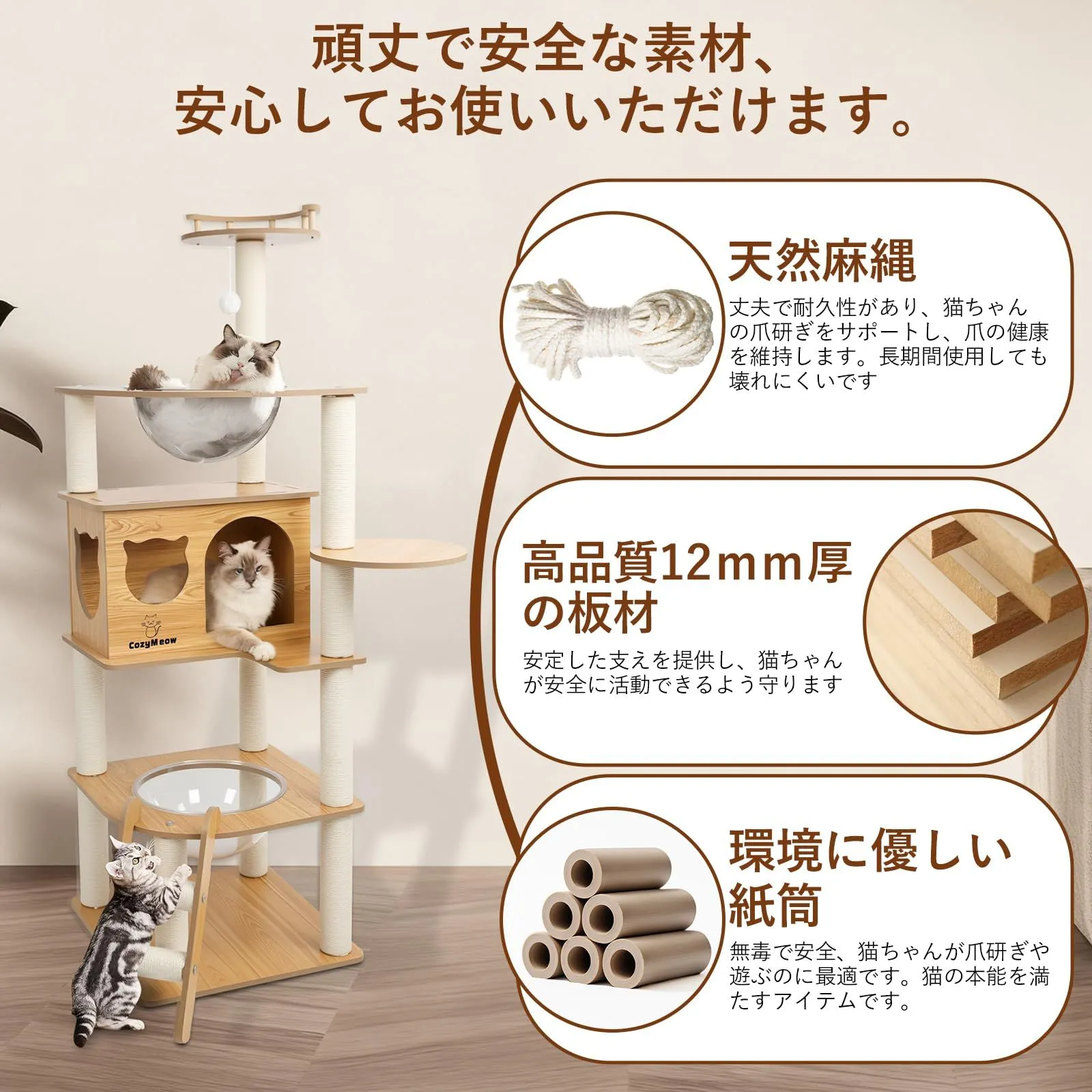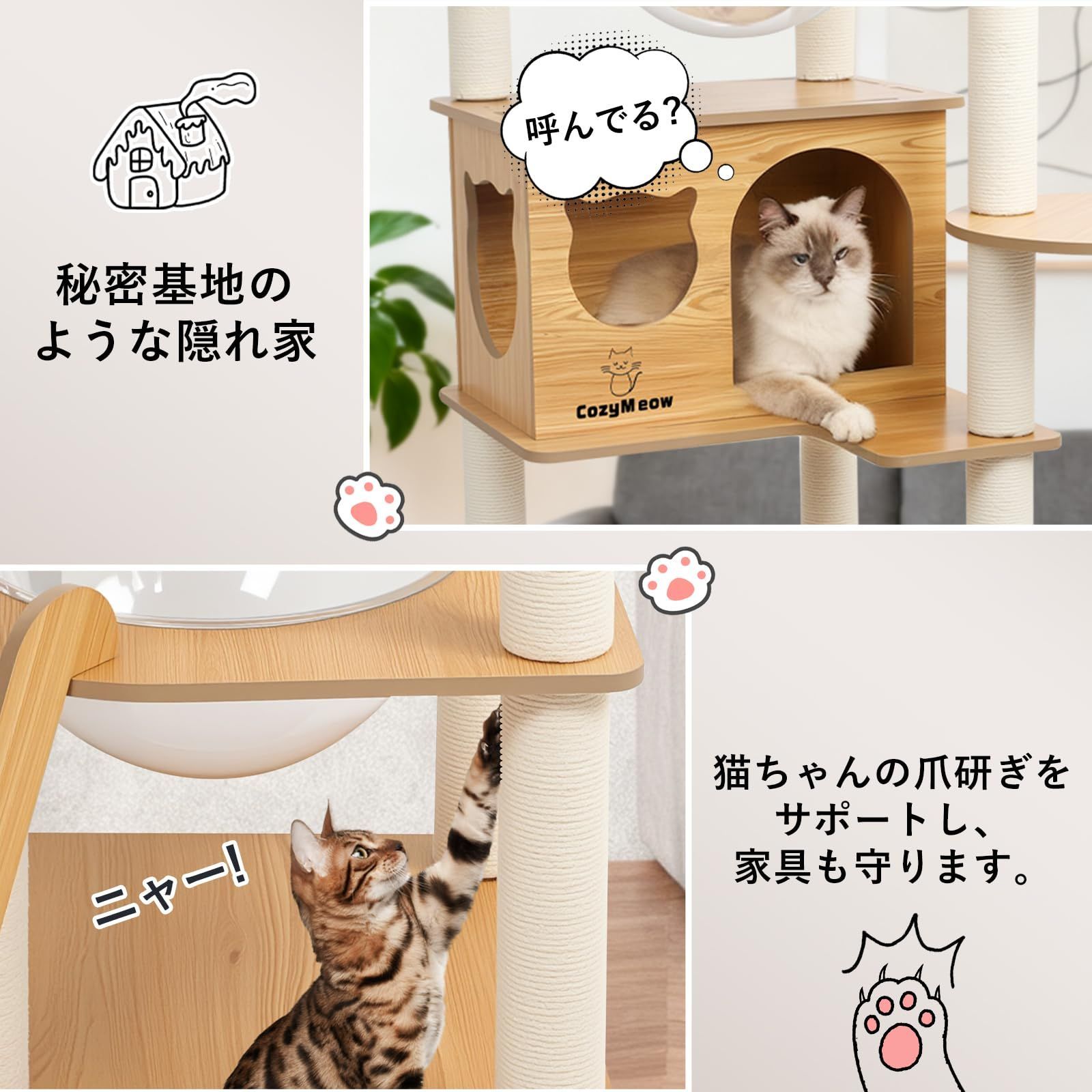【安心・安全設計】厚みのある木材と頑丈な支柱を採用しており、大型猫がジャンプしても揺れにくい設計です。直径6.5cmのサイザル麻ポールは爪とぎに最適で、家具を傷つけることなく遊べます。滑り止め加工のステップと安定感のある底板により、活発な猫でも安心して遊べ、毎回の遊びで安全感を与えられます。猫は思い切り楽しめ、飼い主も安心して見守ることができます。