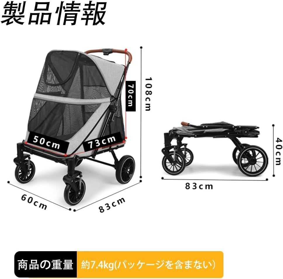 【即日発送】犬用ベビーカー組み立て簡単 折りたたみ式 取り外し可能 60x83x108CM 犬用カート 小型/中型/大型犬 猫にも適し 360度回転 軽量ファッション 通気 収納簡単 多機能 キャスター付き 収納 大容量 高耐荷重 カラー:グレー ペットカート