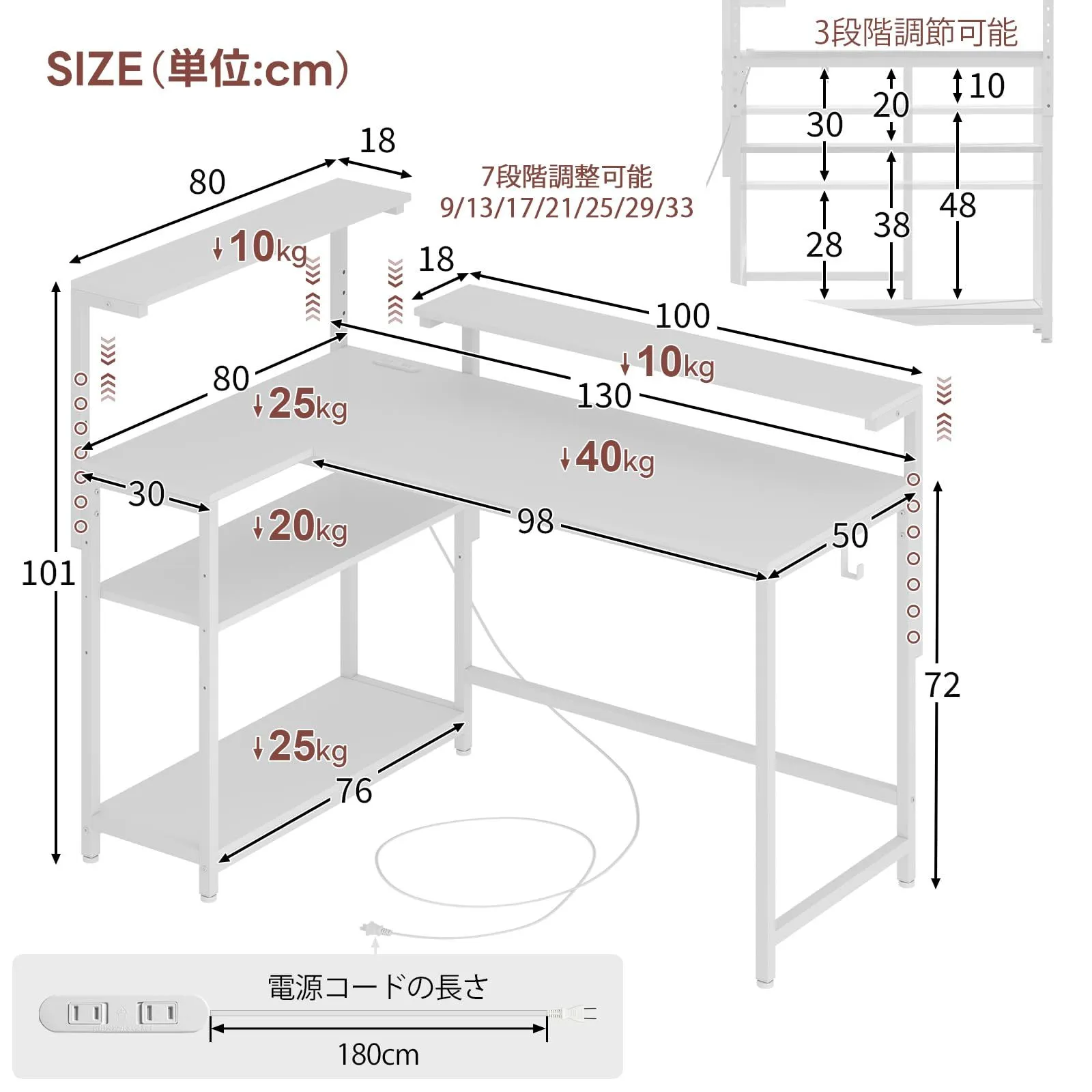 【新着商品】テレワーク L型デスク・左右組み換え自由 モニター台の高さ7段階(12~36cm対応) 収納ラックの棚板が高さ3段階調節 幅130×奥行き80×高さ72cm コンセントとフック付き 耐震転倒防止パーツ付き 収納たっぷり PCパソコンデスク ゲーミン