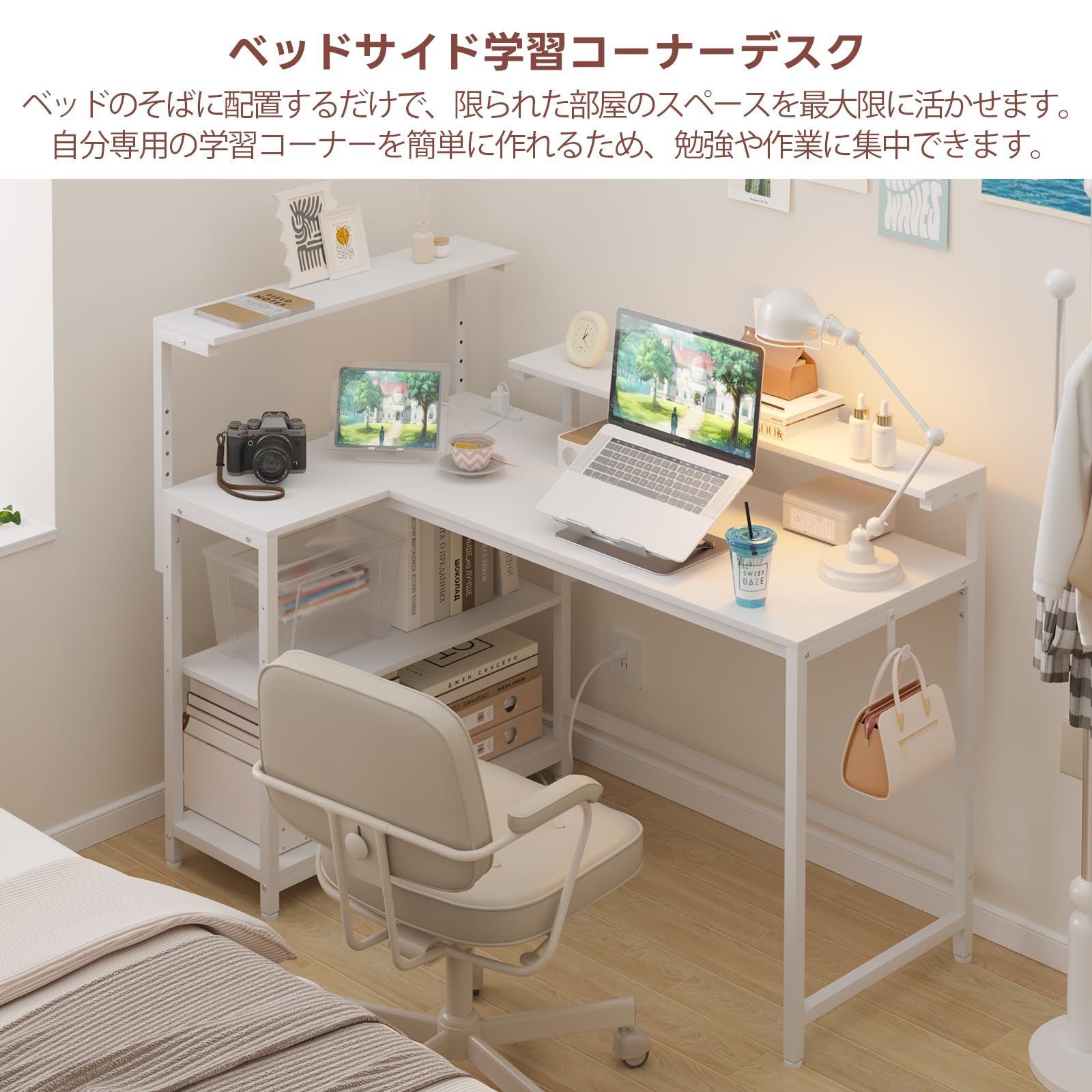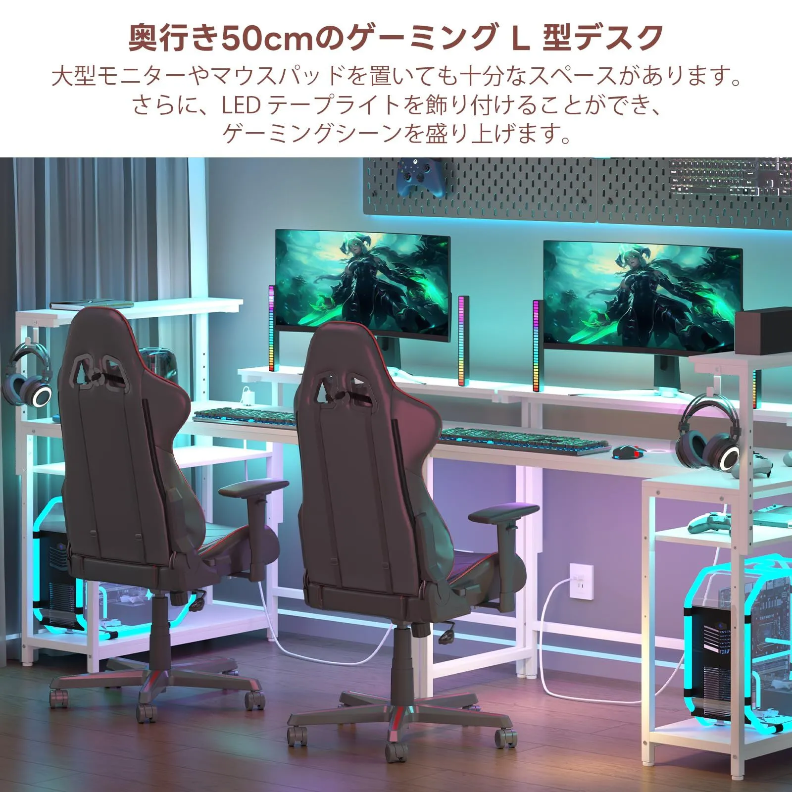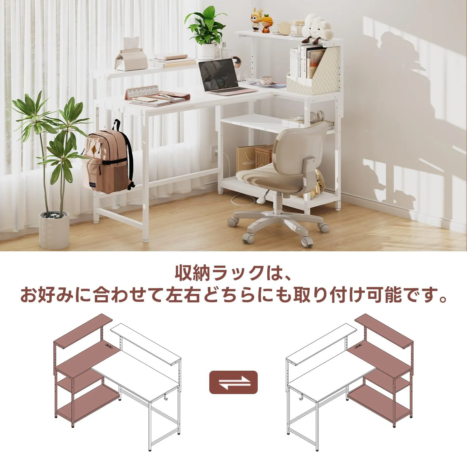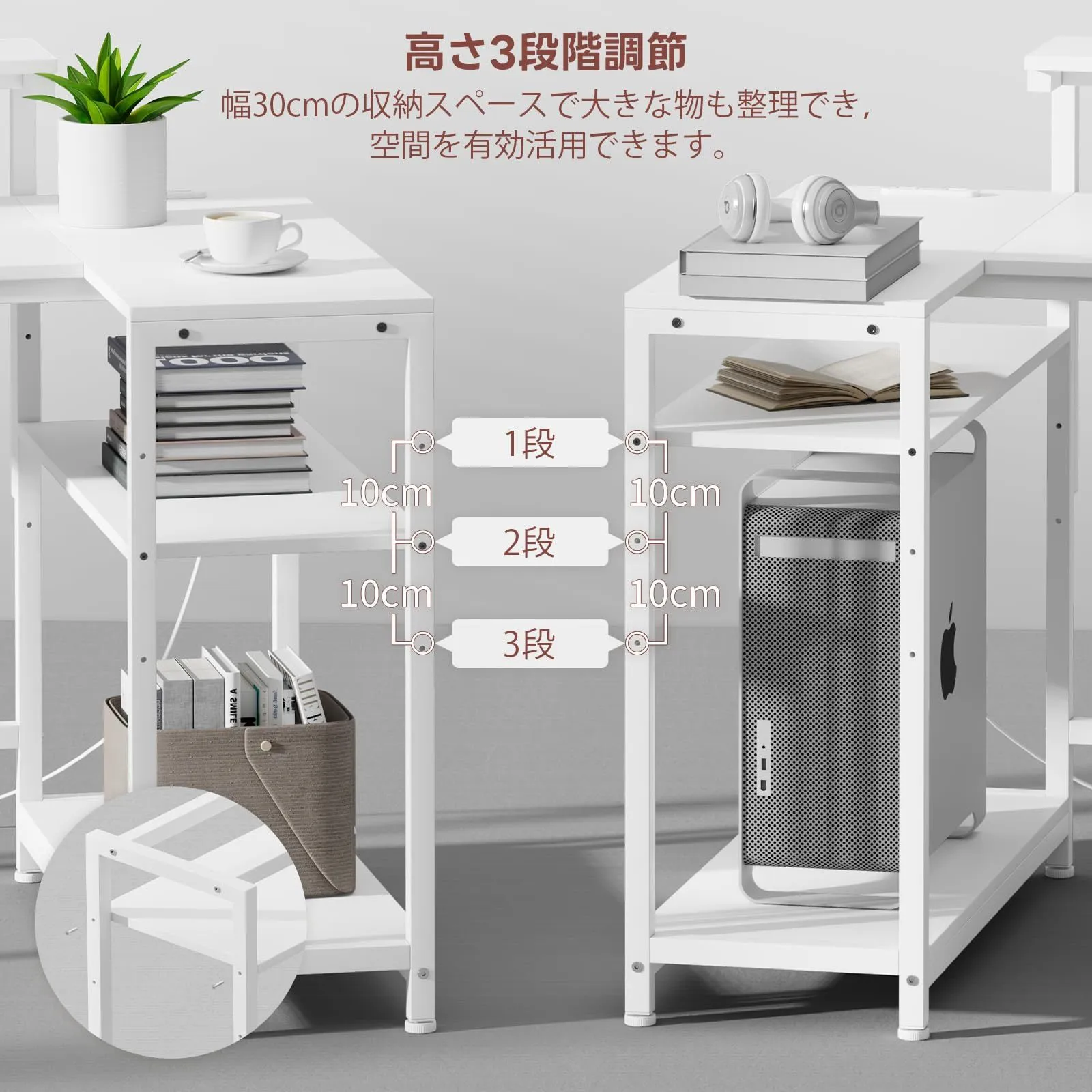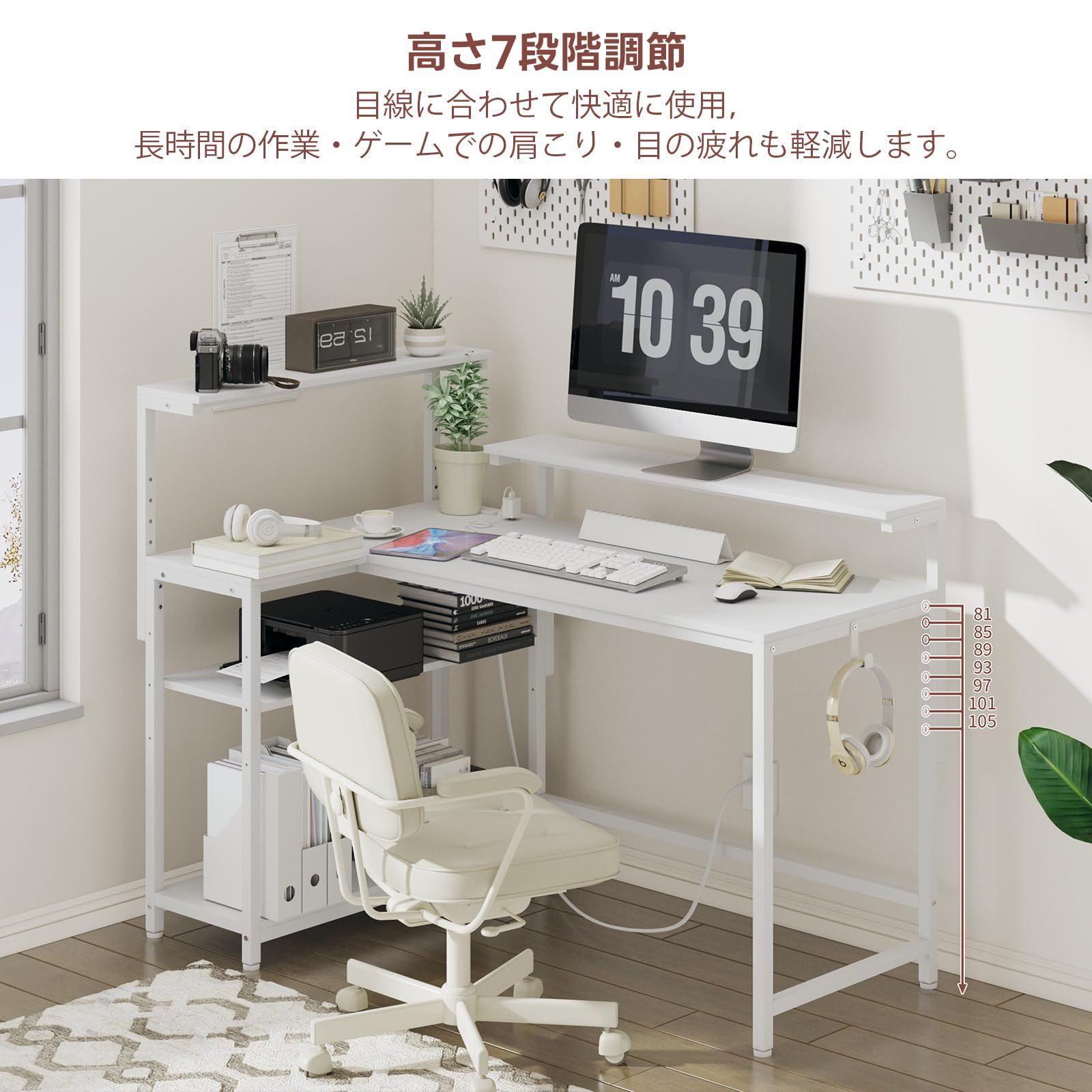LunarLight PCパソコンデスク 幅130×奥行き80×高さ72cm テレワーク L型デスク・左右組み換え自由 モニター台の高さ7段階(12~36cm対応) 収納ラックの棚板が高さ3段階調節 コンセントとフック付き 耐震転倒防止パーツ付き 収納たっぷり ゲーミング オフィス 書斎 (ホワイト, 幅130㎝)
