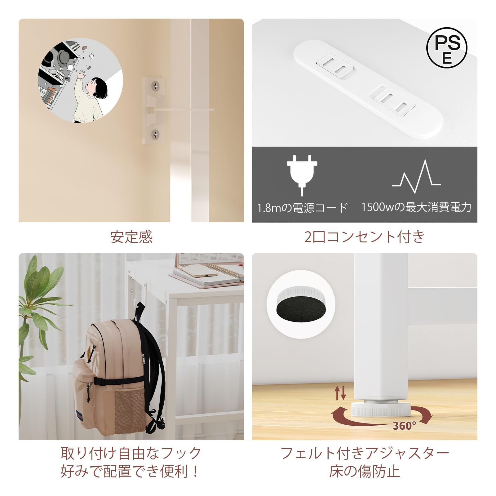 【安全構造】頑丈な構造、天板と棚板はネジ止めにより確実に固定され、長期間にわたって緩みを防止します。スチールフレームは2箇所で強度アップ用サポートがあります。耐震転倒防止パーツ付き、2口コンセント搭載でパソコン在宅ワークなどに大変便利です。またフックを装備し、カバンなどを掛けるのにも便利です。