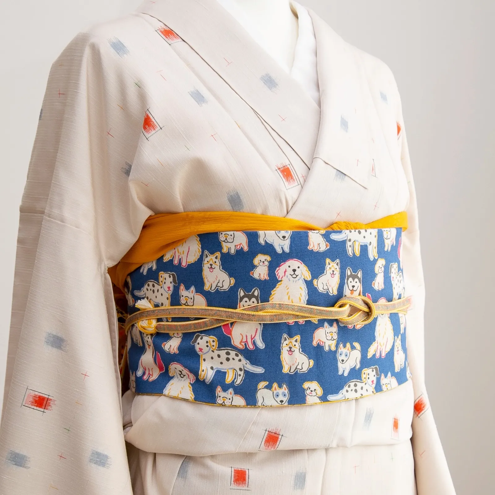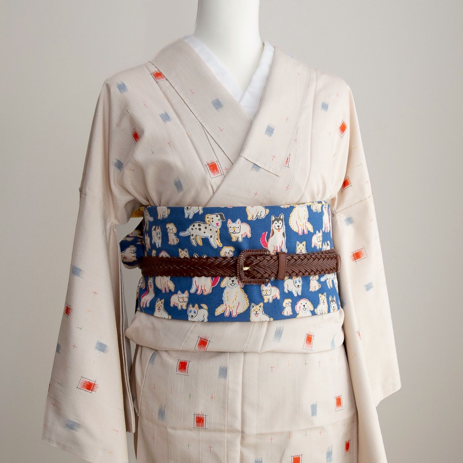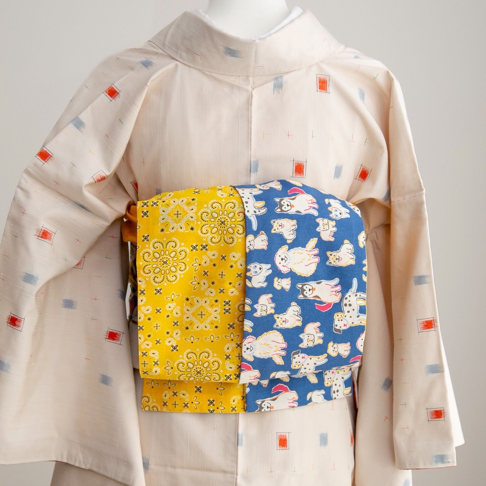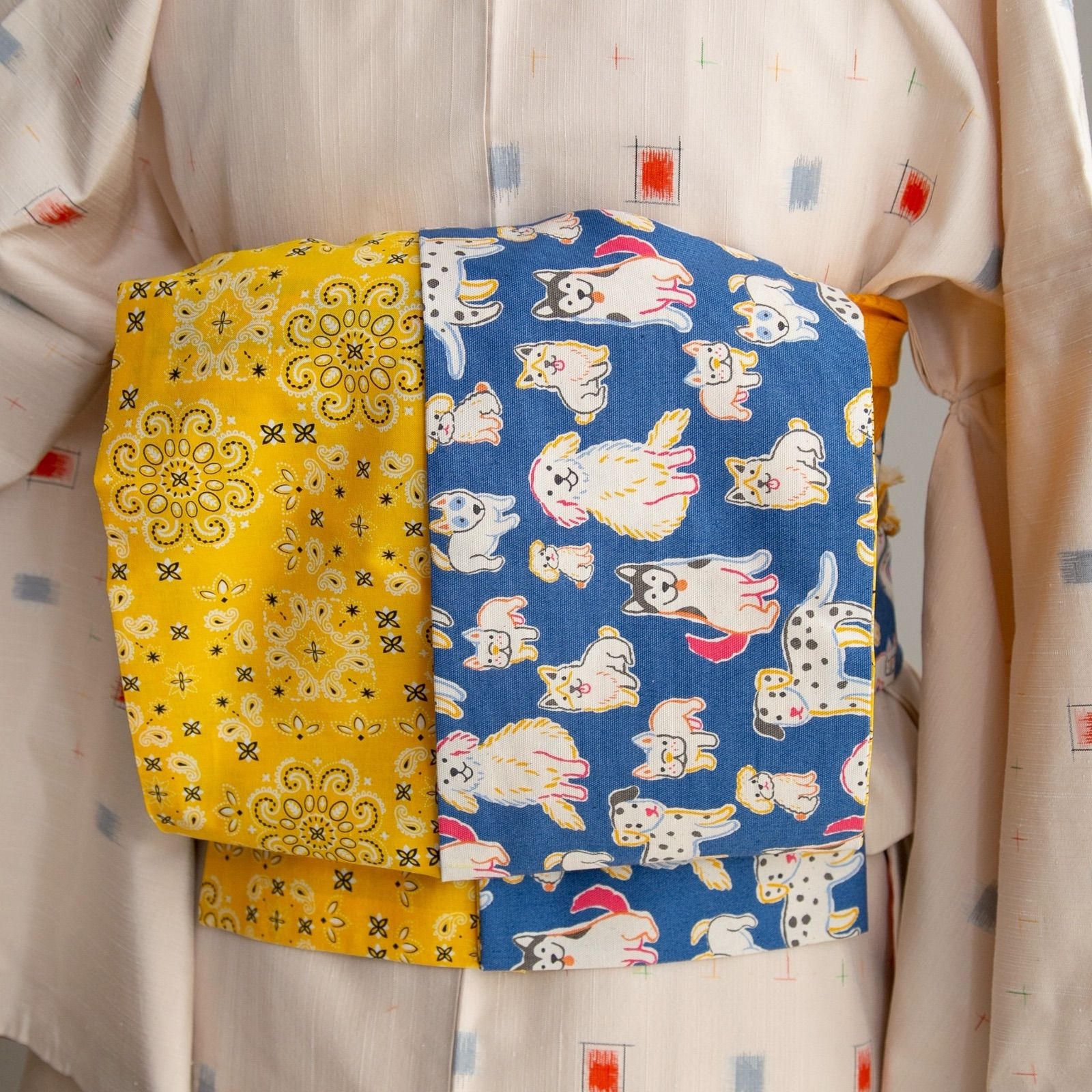 ポップな犬柄にペイズリー柄が可愛い半幅帯で、両面リバーシブルに着用できます。