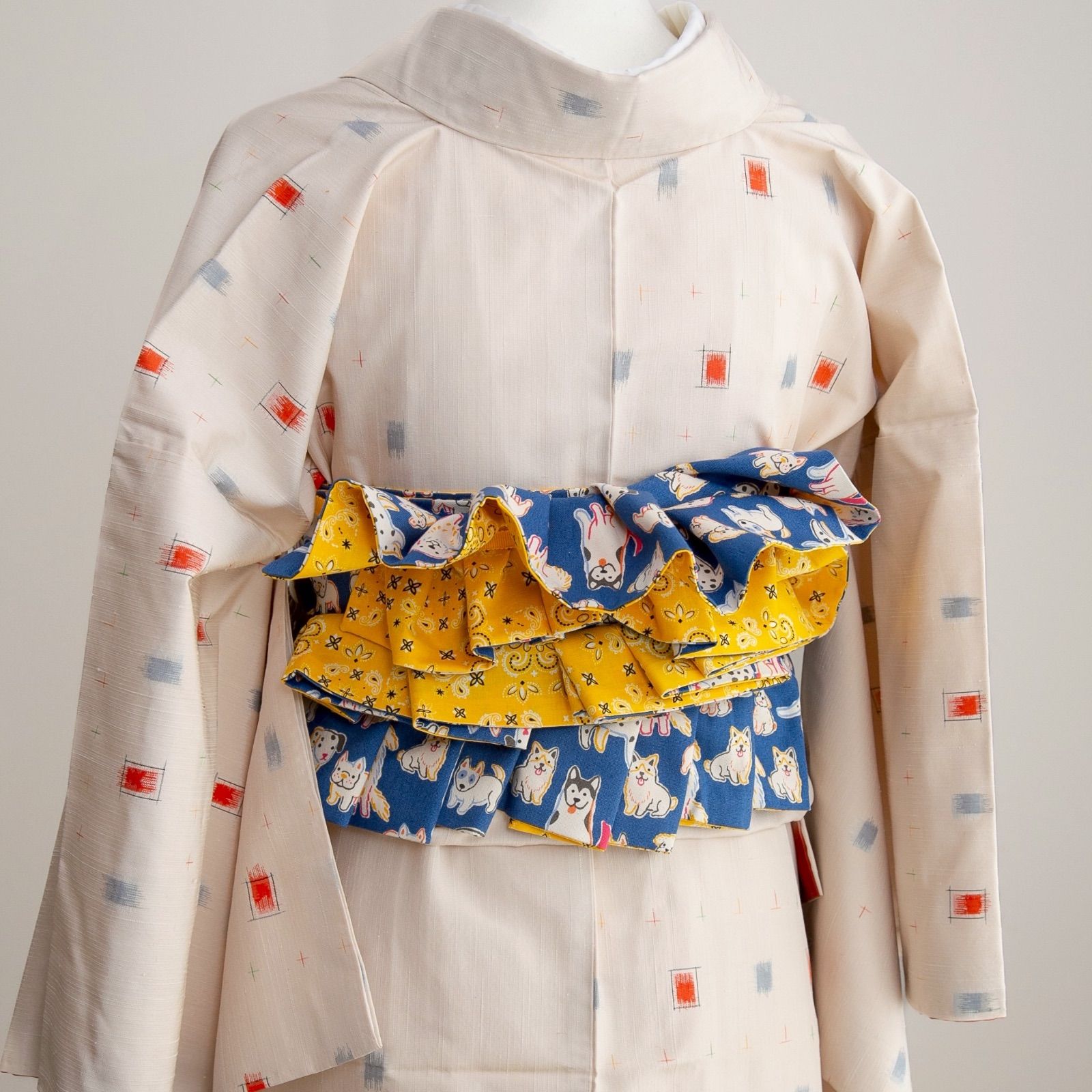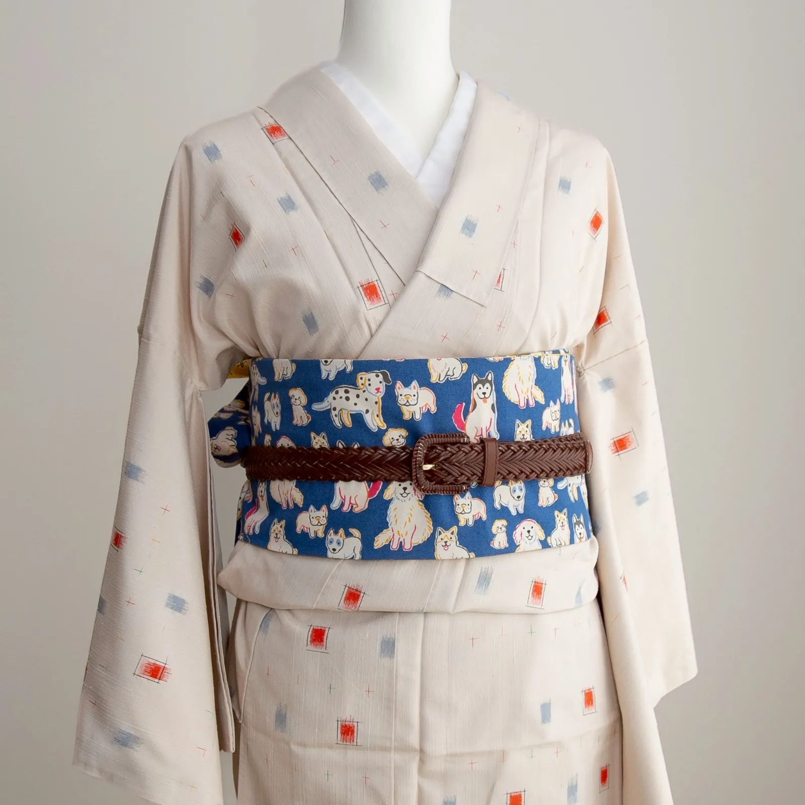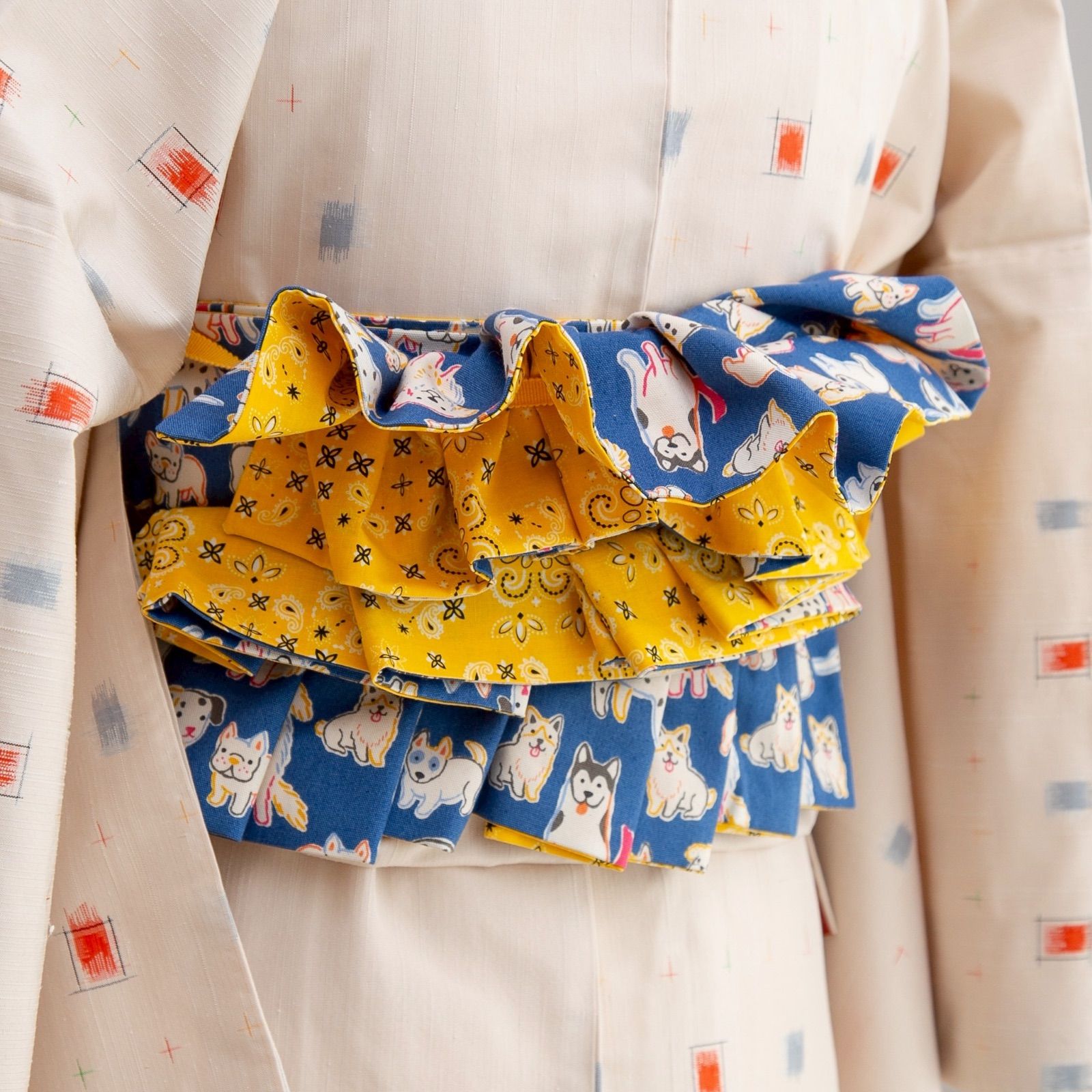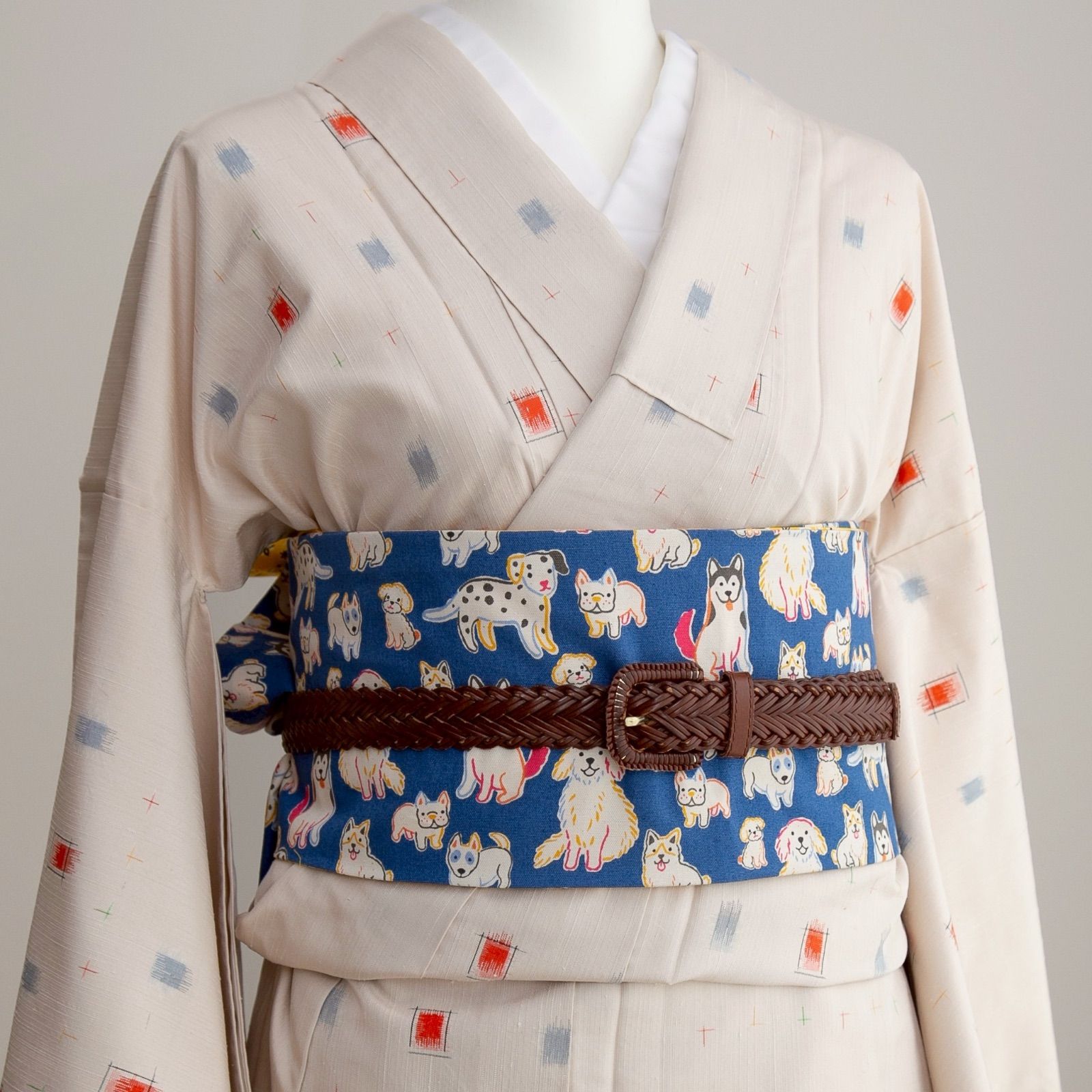 ポップな犬柄にペイズリー柄が可愛い半幅帯で、両面リバーシブルに着用できます。