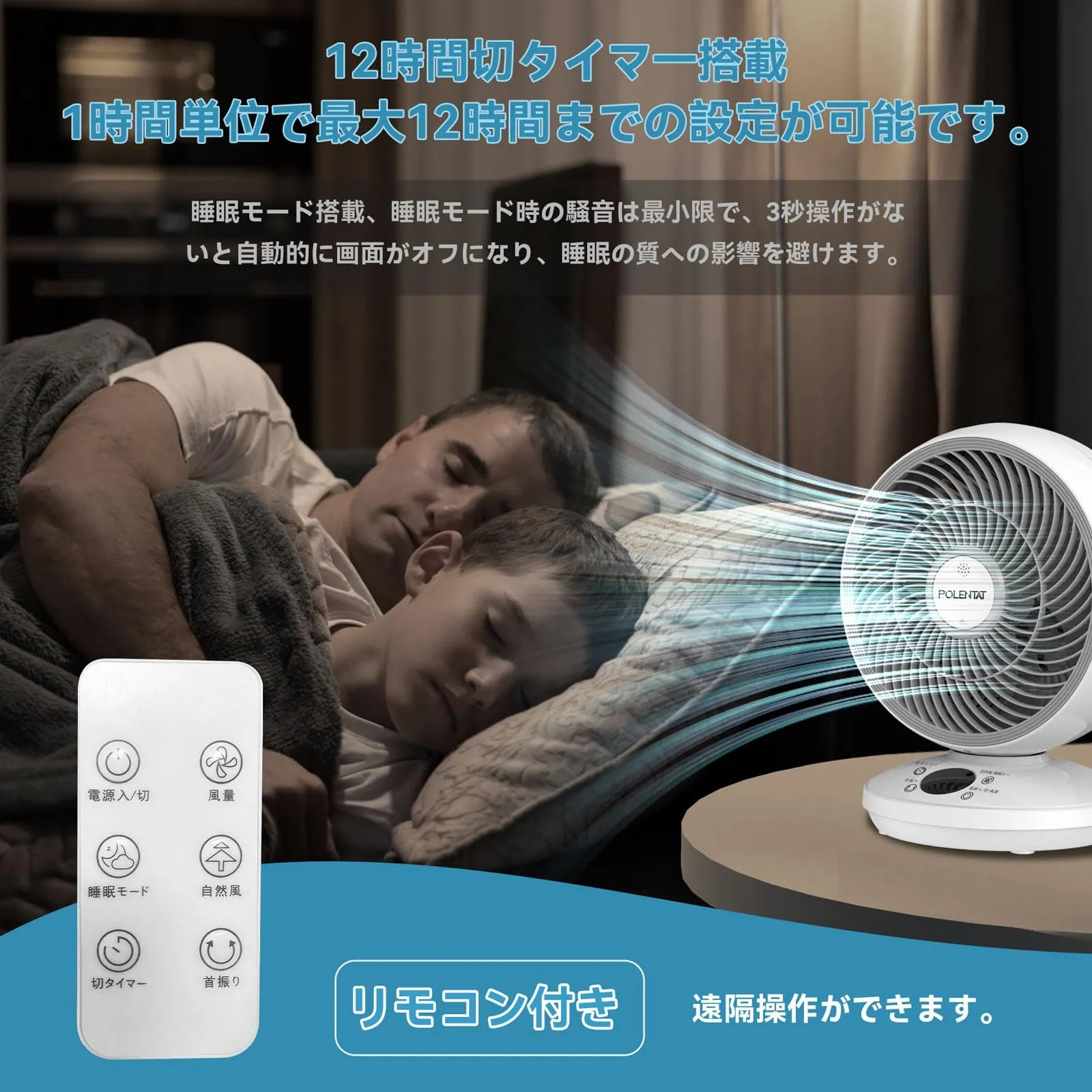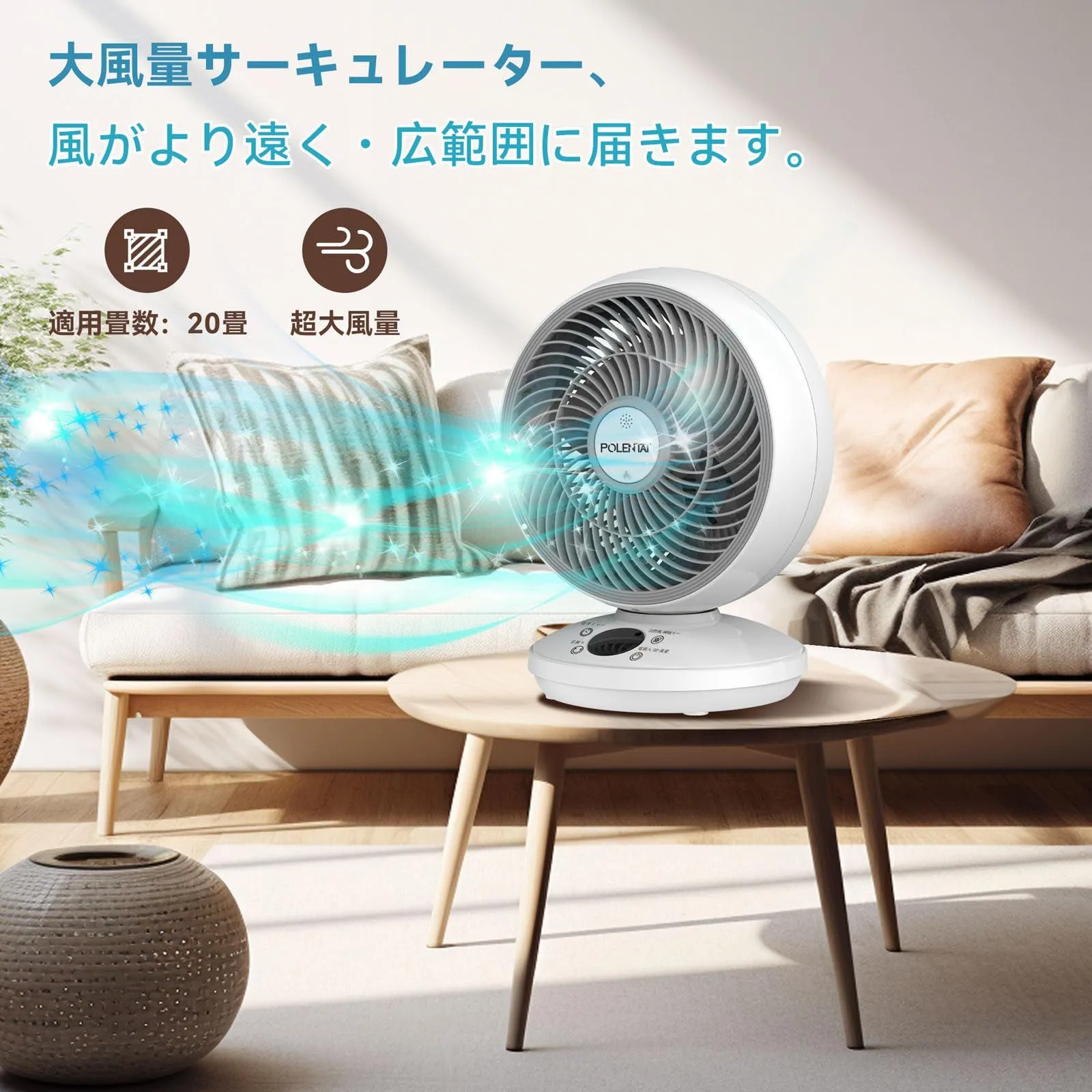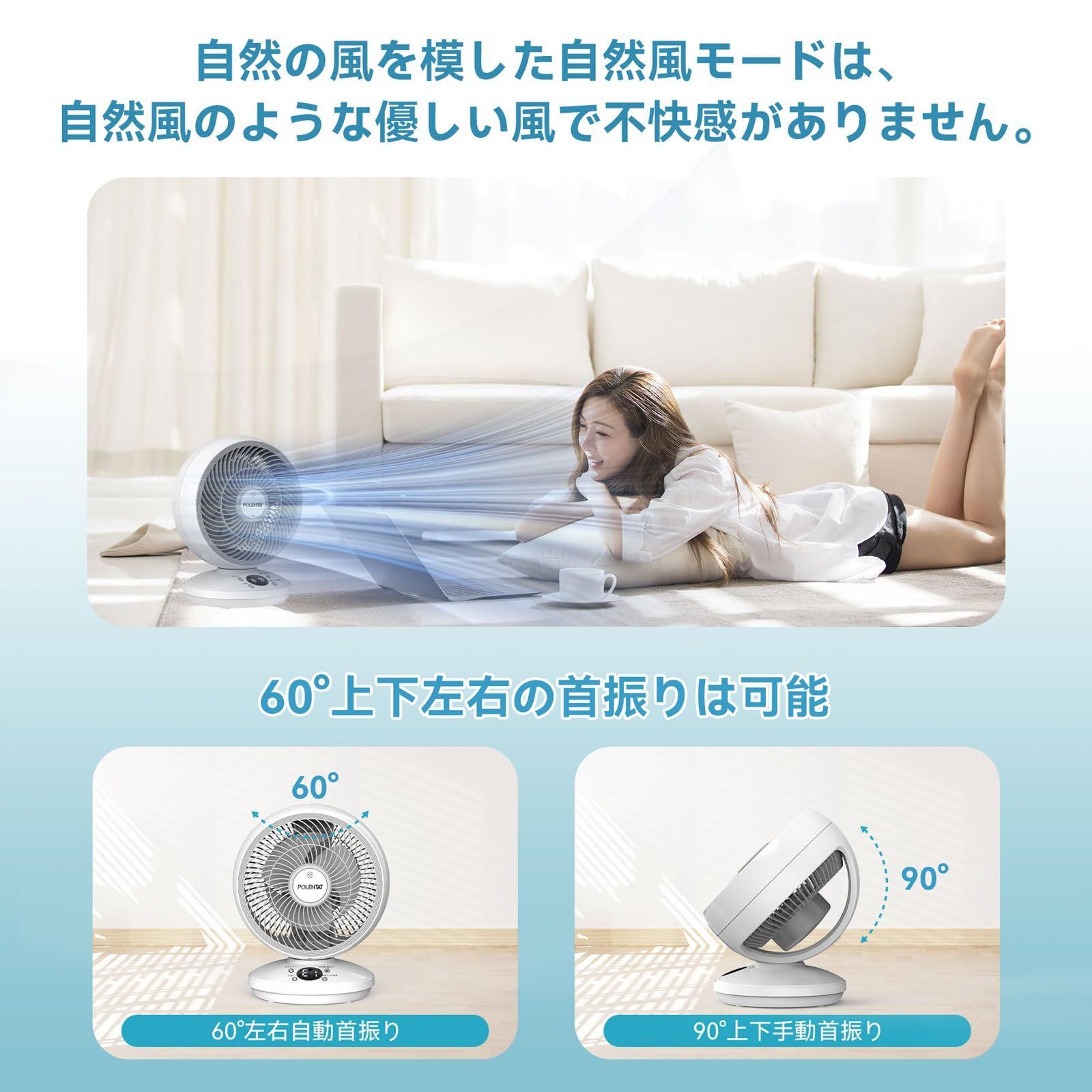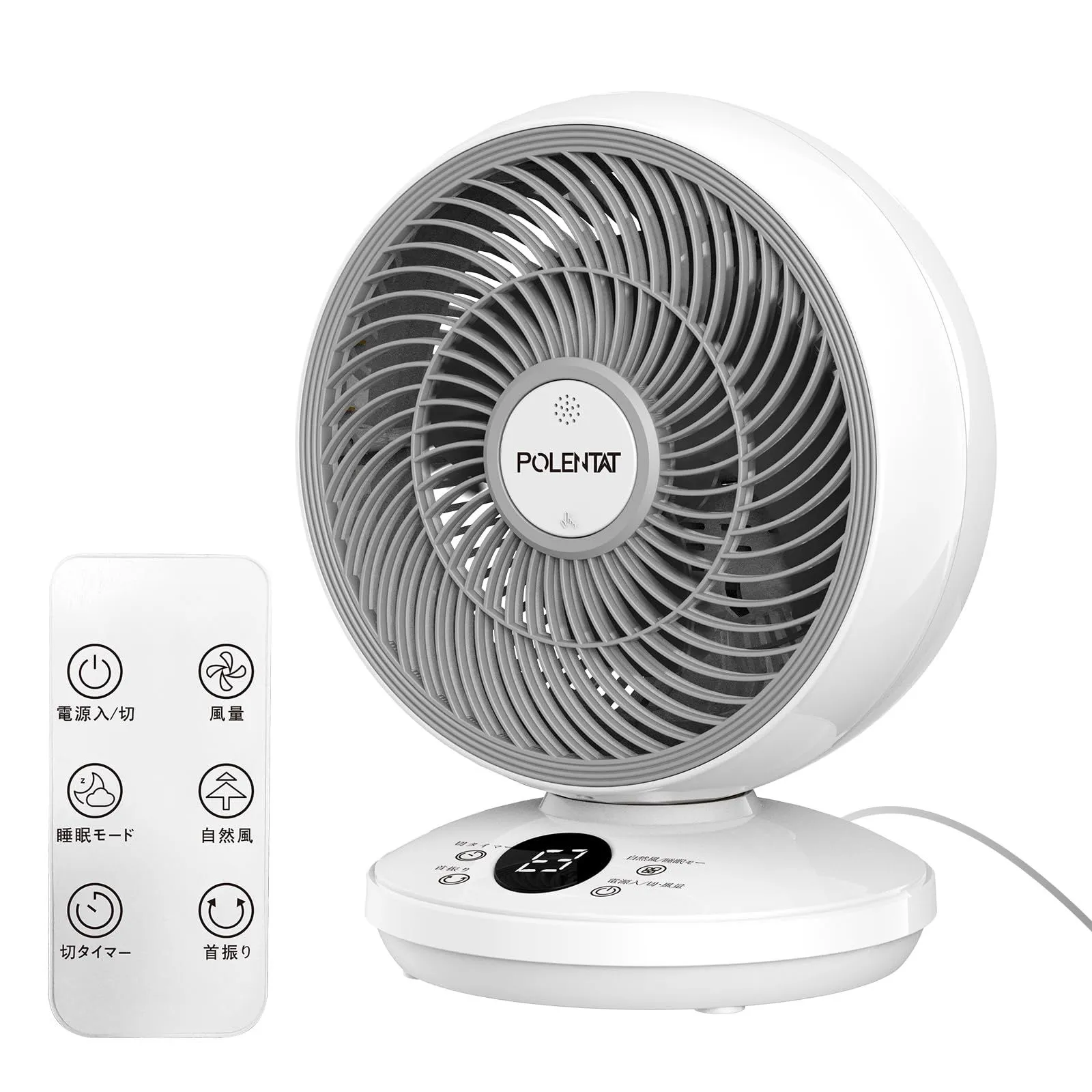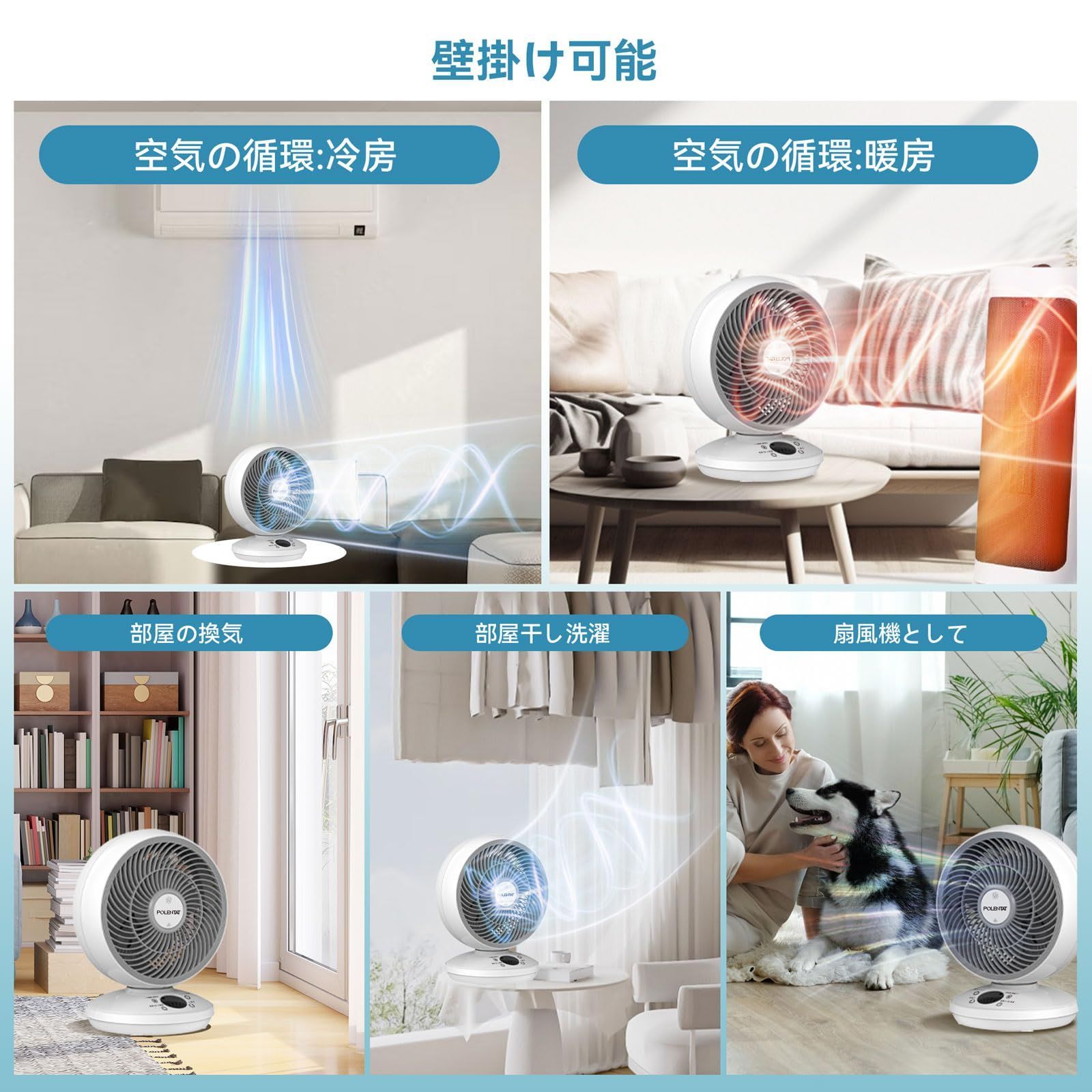 POLENTAT サーキュレーター 扇風機 DCモーター 静音 20畳 左右首振り リモコン付き 壁掛け パワフル送風 3段階風量 12時間タイマー 液晶ディスプレイ お手入れ簡単 空気循環 冷暖房換気 部屋干し 空気清浄 脱臭 コンパクト 省エネ 節電対策