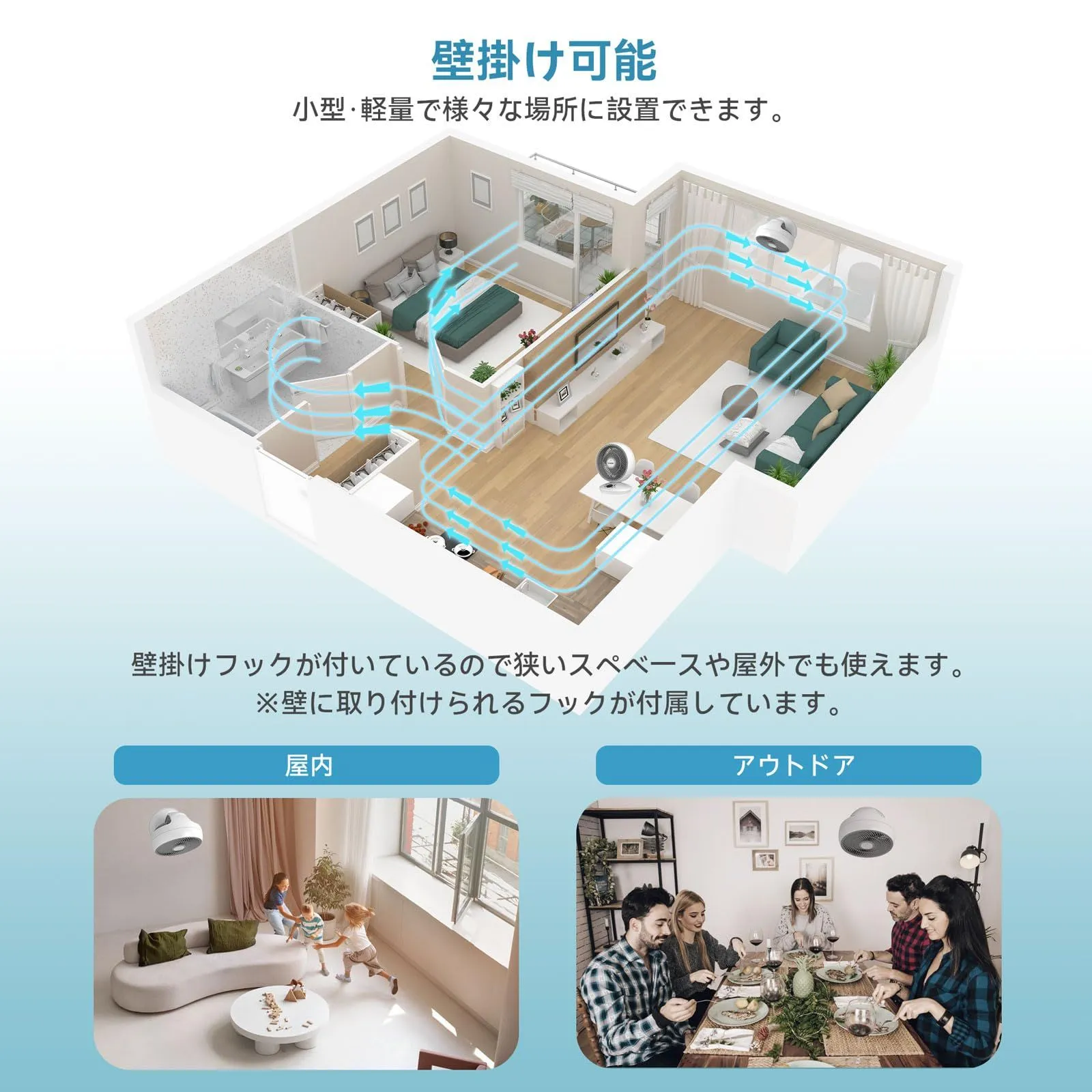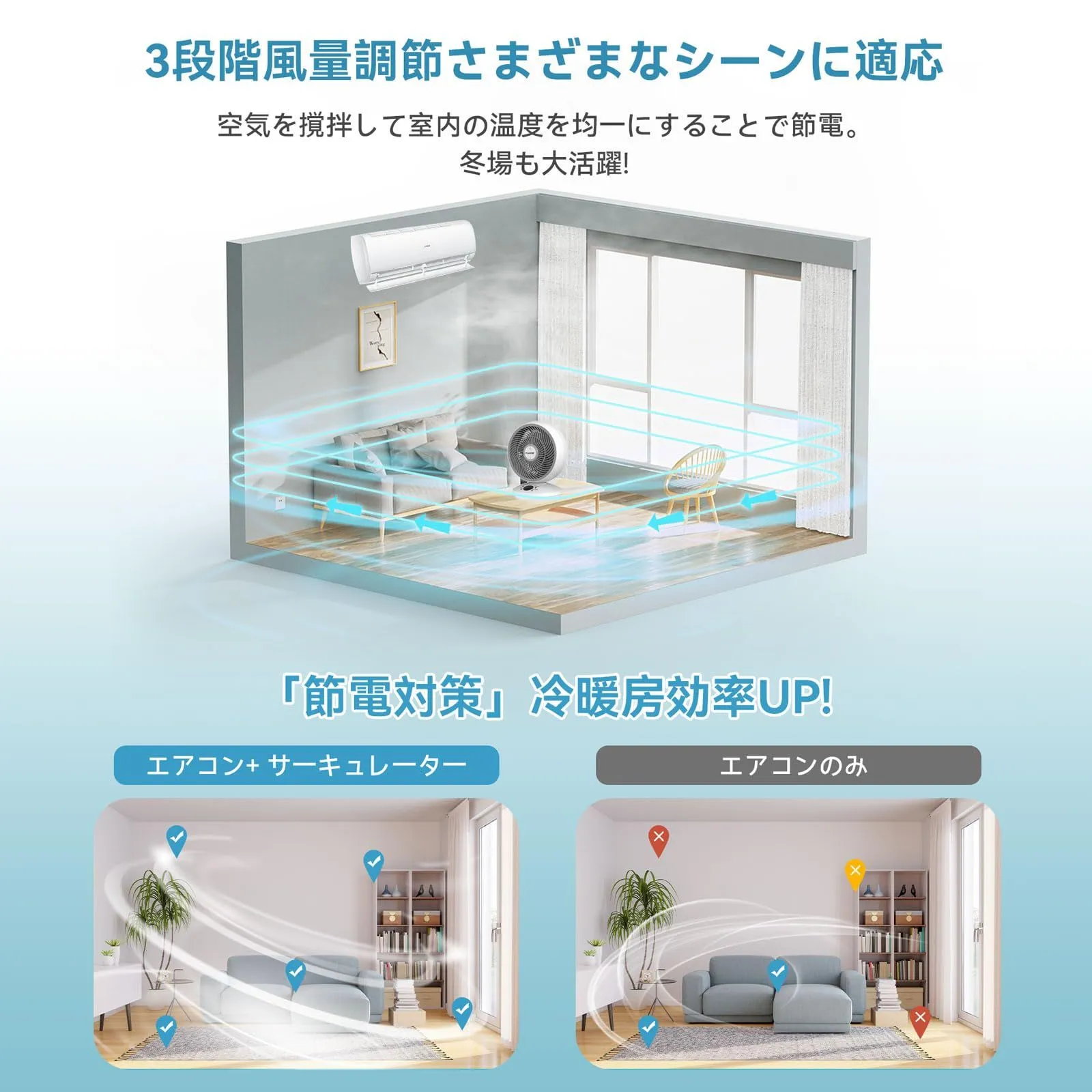 【20畳対応・3D立体送風で空気を循環】特殊形状のプロペラにより、最大7m先まで届く直進性の高いパワフル送風を実現。左右の自動首振りと上下の角度調整を組み合わせることで、20畳の広い部屋でも隅々まで空気を攪拌。エアコンと併用することで、夏は涼しく冬は暖かく、オールシーズン快適な室温を保ちます。