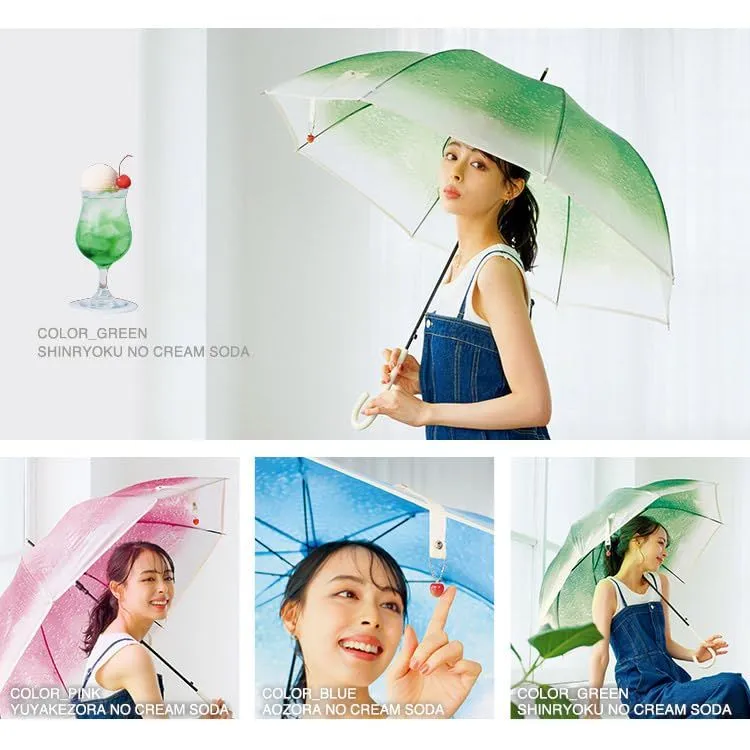【クリームソーダアンブレラ】 雨の日とクリームソーダ雨宿りに訪れた喫茶店できらきら輝くクリームソーダに出会い、憂鬱な気分が晴れていく。 日本全国を巡り、旅をしながらオリジナルのクリームソーダをつくる「旅する喫茶」とのコラボレーションシリーズ。 生地は発色の良いポリウレタンを使用しており、クリームソーダのシュワシュワ感と色の美しさを忠実に再現 雨粒が付くとより幻想的な世界が広がります。