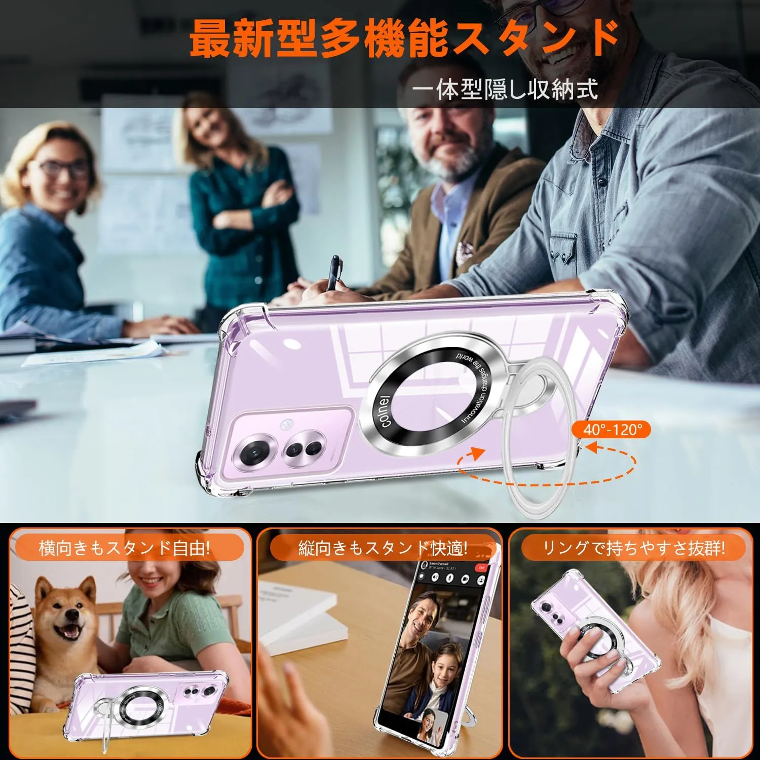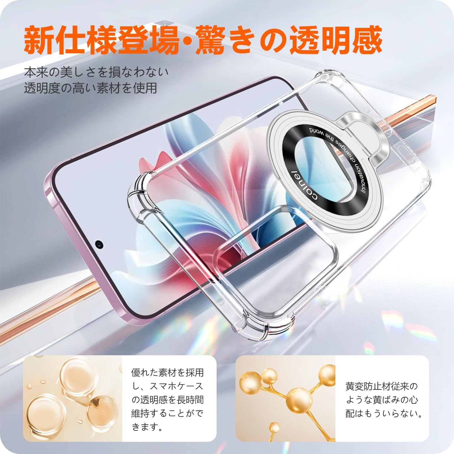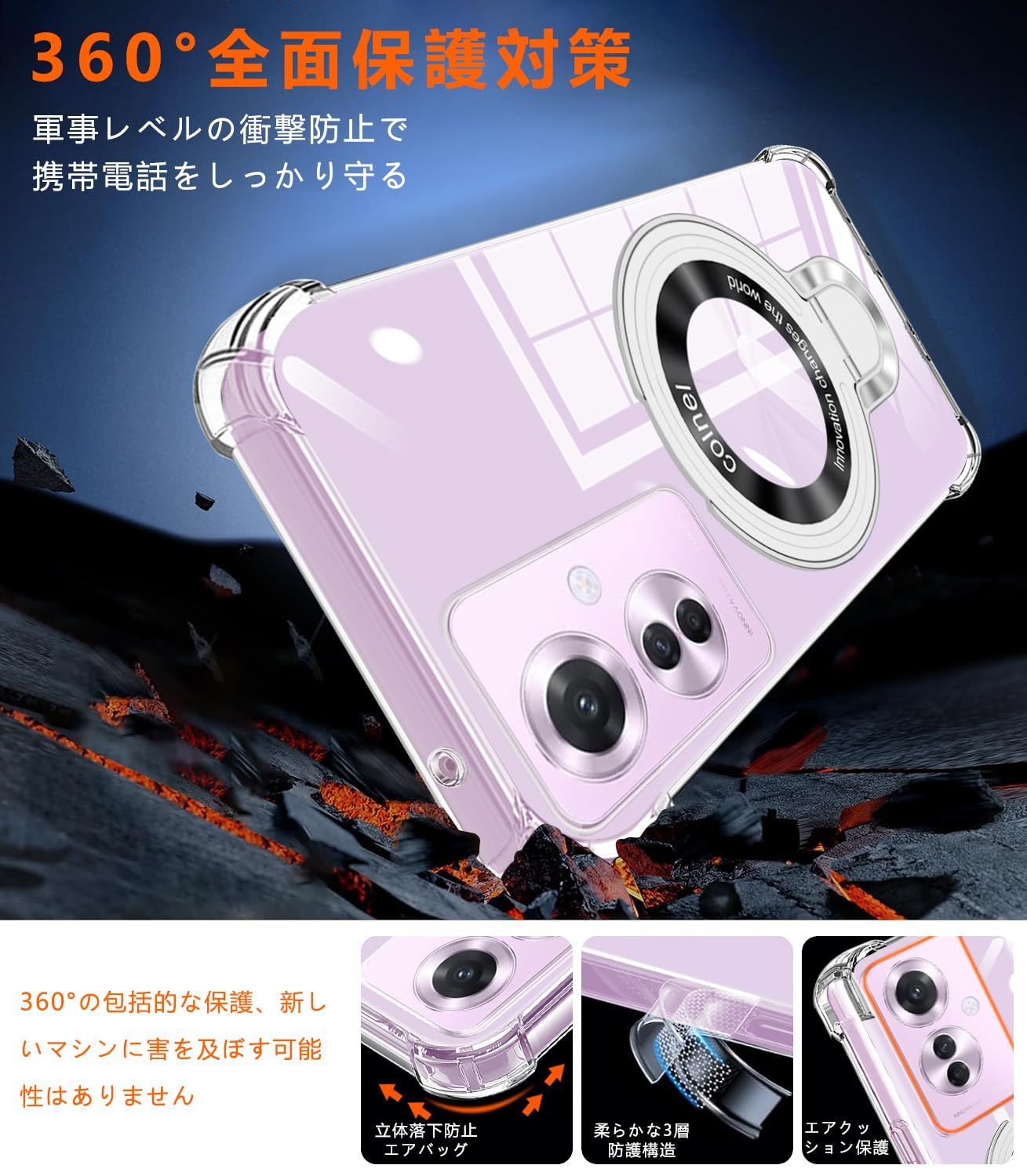 OPPO Reno9 A/OPPO Reno7 A ケース クリア MagSafe対応 リング付き 縦横両対応 アジャスタブルスタンド 四角エアクッション 耐衝撃 OPG04 A201OP カバー 衝撃吸収ポケット内蔵 TPU 薄型軽量 全面保護 オッポリノ7a オッポリノ9a ケース