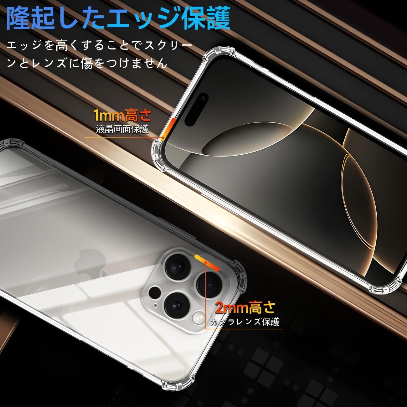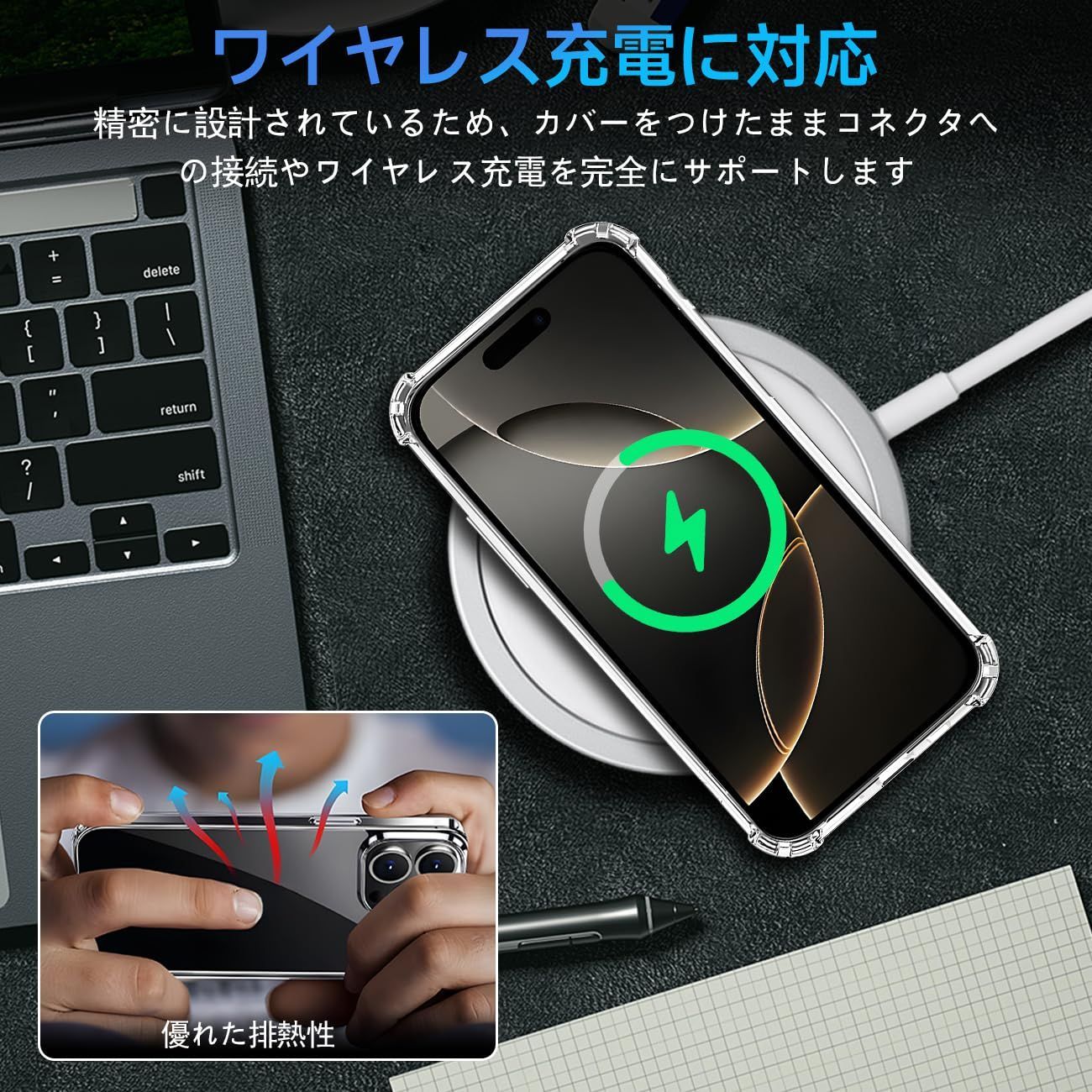 【細かいところまで保護できる安心設計・レンズと液晶画面にも保護】携帯電話を平らな面に置いたとき、液晶画面とカメラレンズの接触による不具合を最小限に抑えるため、カメラレンズより0.5mmをアップし、液晶画面より0.8mmアップしております。スクリーンを保護する同時に、ガラスフィルムをまったく邪魔しません。更に滑り止めと落下防止の設計があり、テーブルから滑り落ちる心配はありません。裏面は放熱性に優れたポリカーボネート素材を採用し、効率的に放熱し、バッテリーを完璧に保護することができます。携帯電話ケースを付けたままでもワイヤレス充電が可能です。