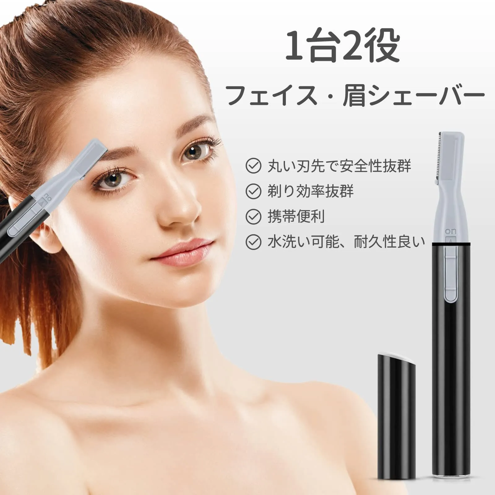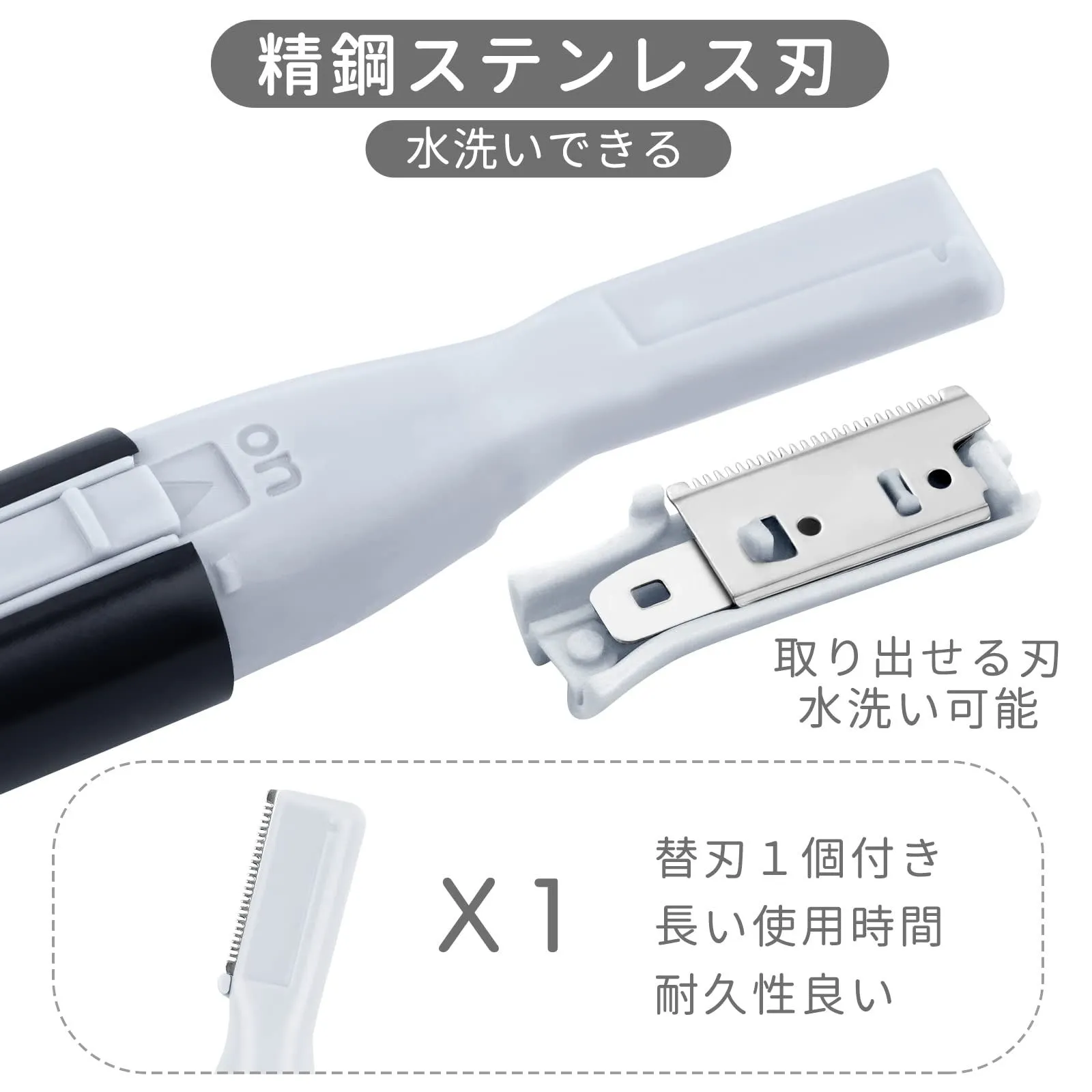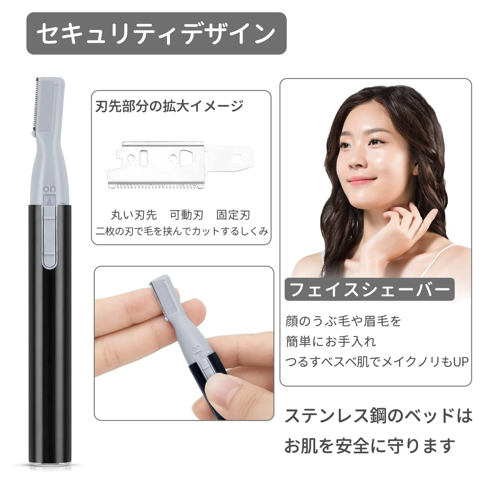 肌に優しい:眉毛シェーバーは低刺激性の丸み刃先ステンレス製刃を使います。固定刃と可動刃の2枚の刃で毛を挟んでカットする構造なので、お肌に直接に触れないです。しっかり毛髪を剃ると同時に、肌に優しく、傷と赤みを防ぎ、刺激を与えず、肌が弱い方にも安心してご使用できます。