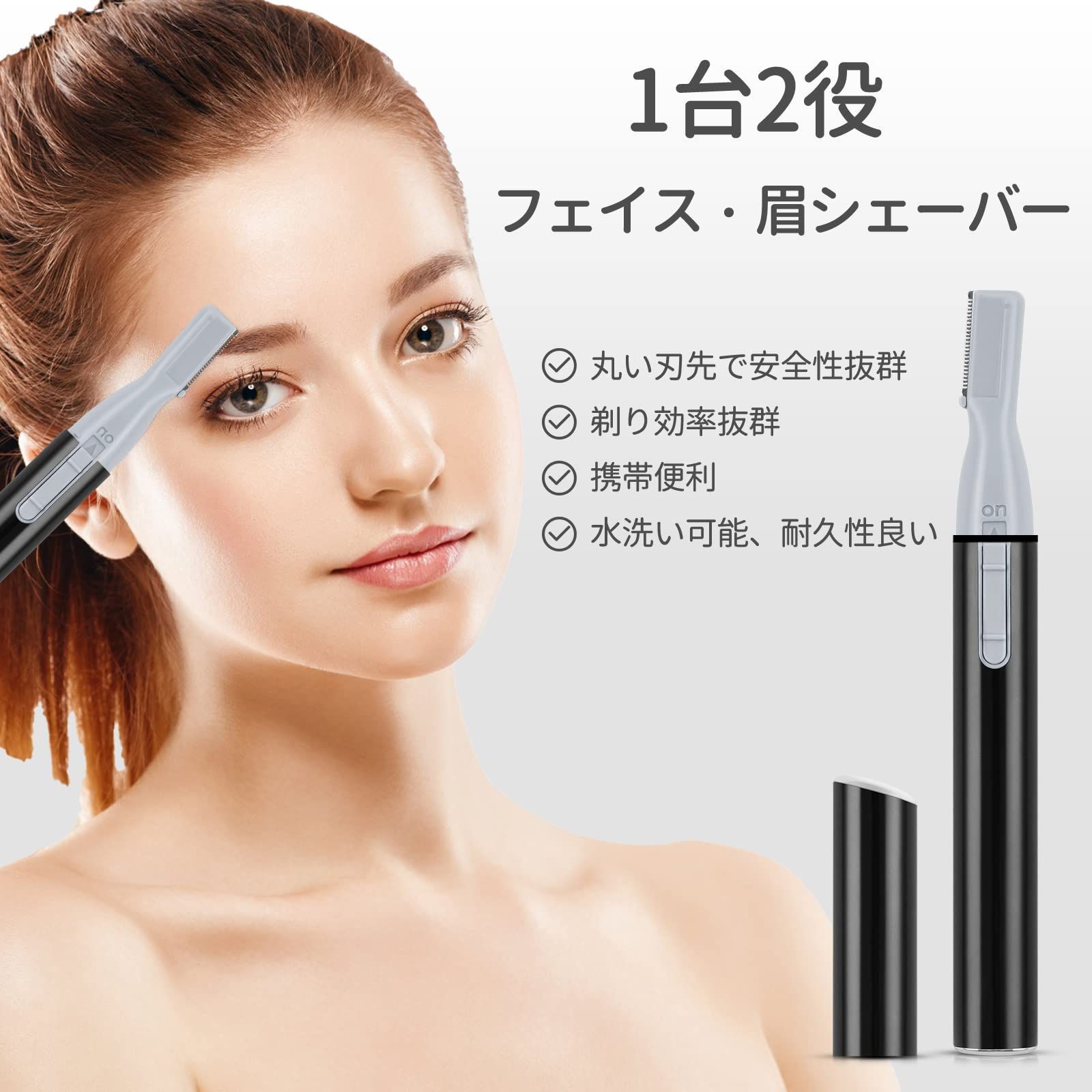 眉毛シェーバー フェイスシェーバー 女性 眉毛カッター レディースシェーバー 電動 顔そり 替刃付き 内刃水洗い可能 頬 脇 足 うぶ毛 産毛処理 マユコーム付き 乾電池式 コンパクト ブラック