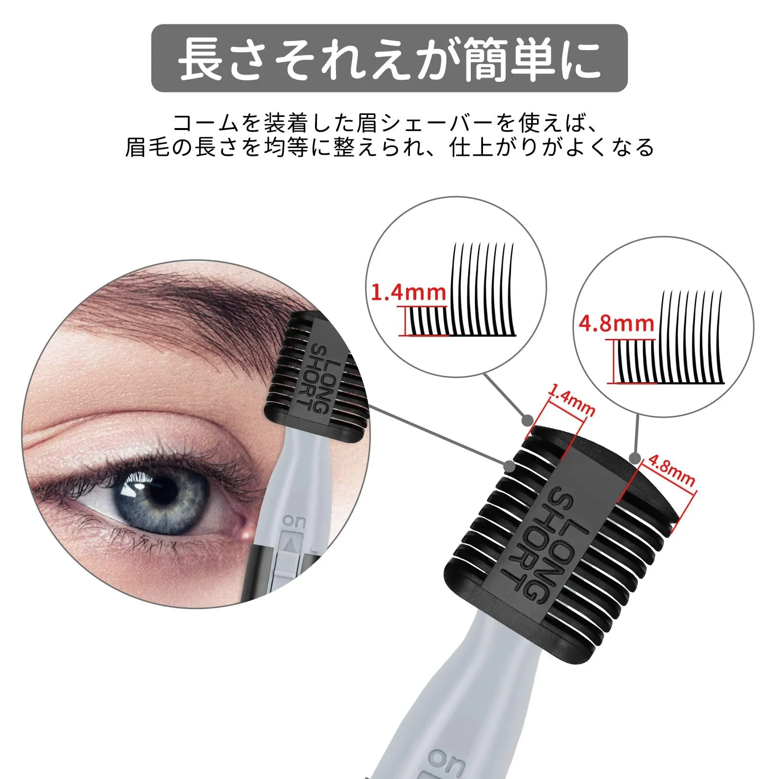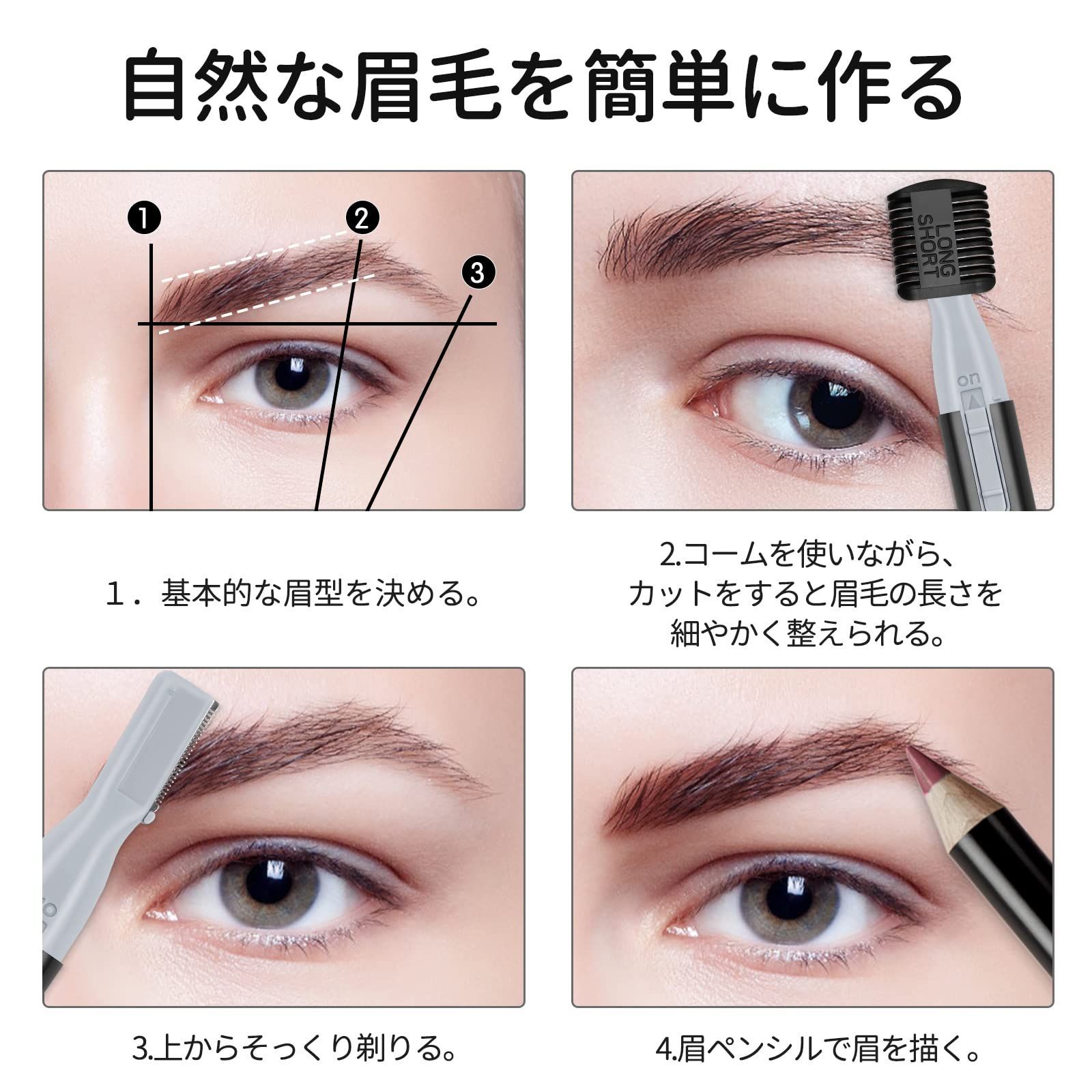 初心者でも簡単:パッケージには日本語取扱説明書とマユコームが付きます。使用前にコームを刃の部分にセットして眉毛をなぞることで、簡単にキレイな眉毛を作ります。掃除用ブラシもついているので手入れもしやすいです。使いやすいので初心者も大丈夫です。
