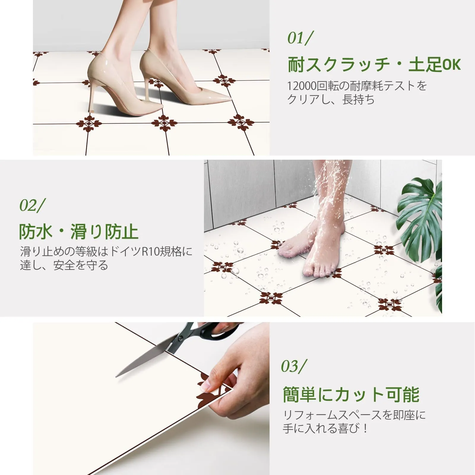 ? 素材の利点:1) 防水&抗菌防カビで、滑り止めの等級はドイツR10規格に達しており、洗面所、トイレ、浴室 、キッチン、床暖房、玄関、あらゆる床面に安心して使用できます。2) 12,000回の耐摩耗試験をクリア、抜群の耐摩耗性を持つ、土足OK、長持ち。猫の爪とぎでも傷つきにくく、ペットのいるご家庭にもおすすめです。3) SGS認証の四大品質試験に合格し、安全で環境に優しい素材です。