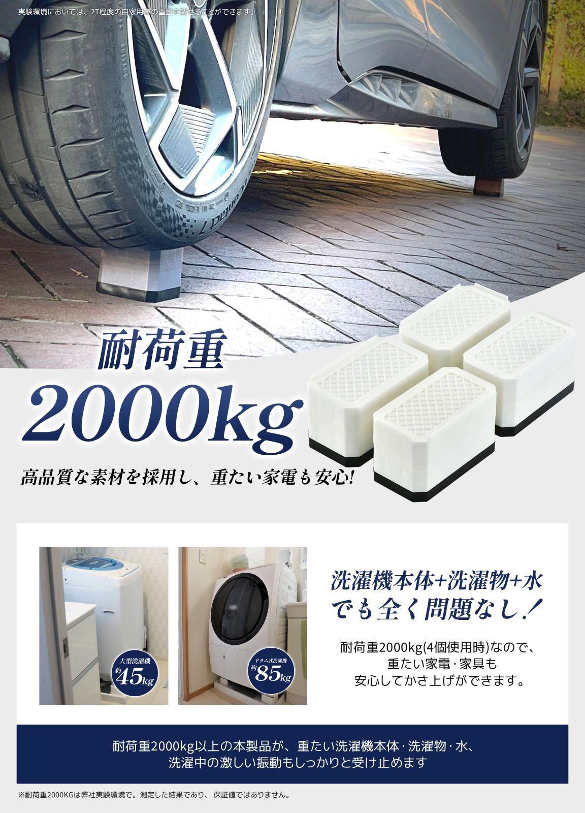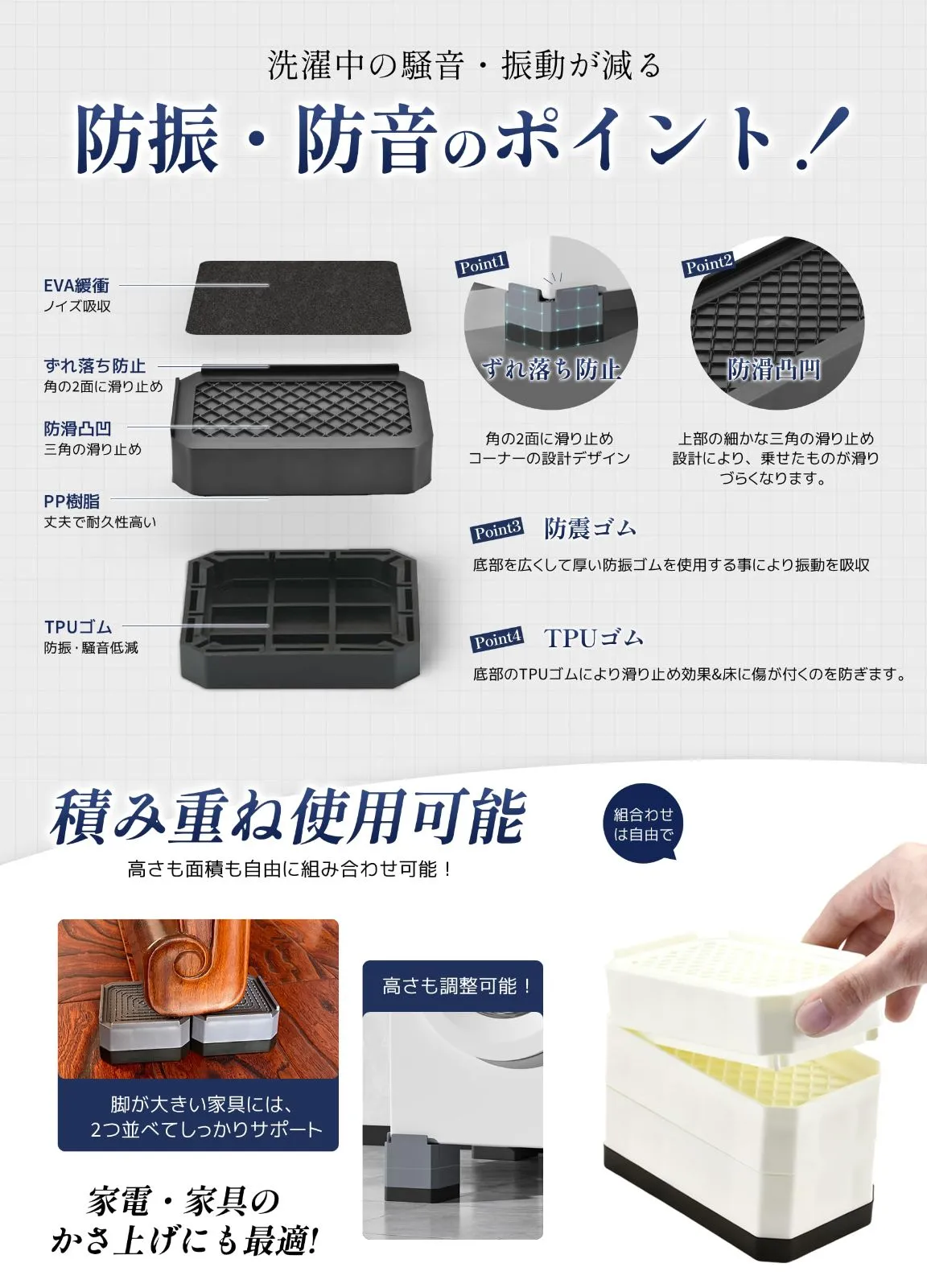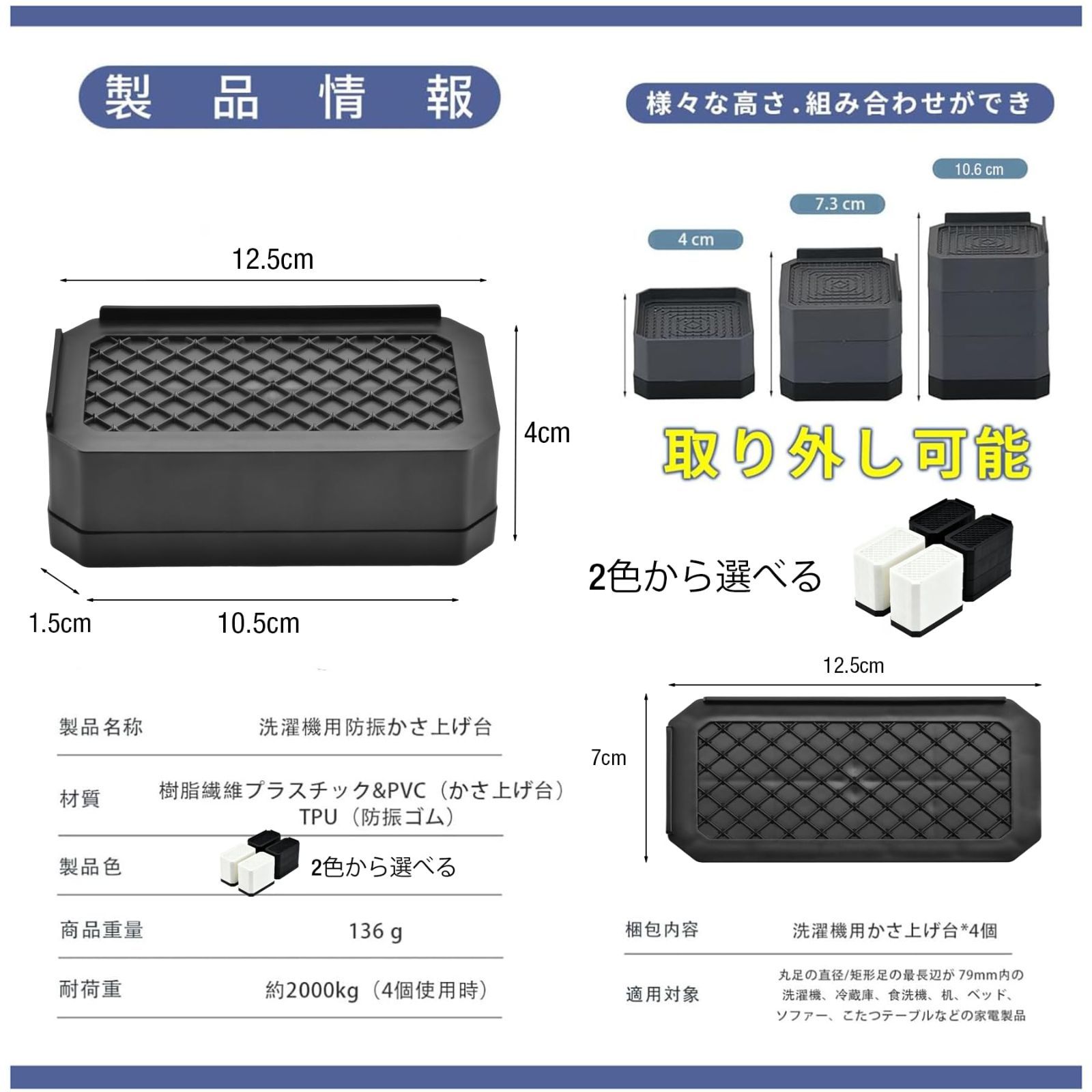 【洗濯機かさ上げ台】 サイズ:12.5L x 7W x 7.3H cm(2層)。セット内容:4個入り。耐荷重:約2000kg(4個使用時)。※適用対象:丸足の直径/矩形足の最長辺が79mm内の洗濯機、冷蔵庫、食洗機、机、ベッド、ソファー、こたつテーブルなどの家電製品・家具(85cm以上はつなぎ合わせる必要があります)。 最後までご確認頂き誠にありがとうございました。 上記をご確認頂き、ご購入いただけましたら幸いです。 何かご不明な点がございましたらお気軽にメッセージからお問い合わせ下さい。